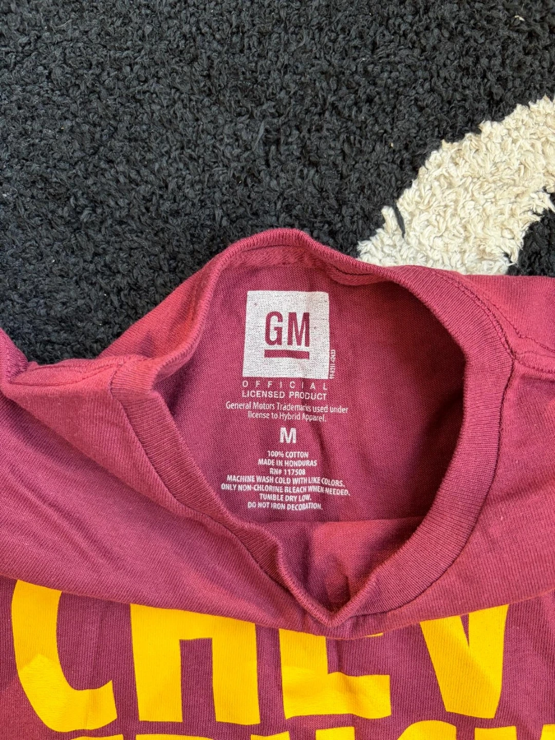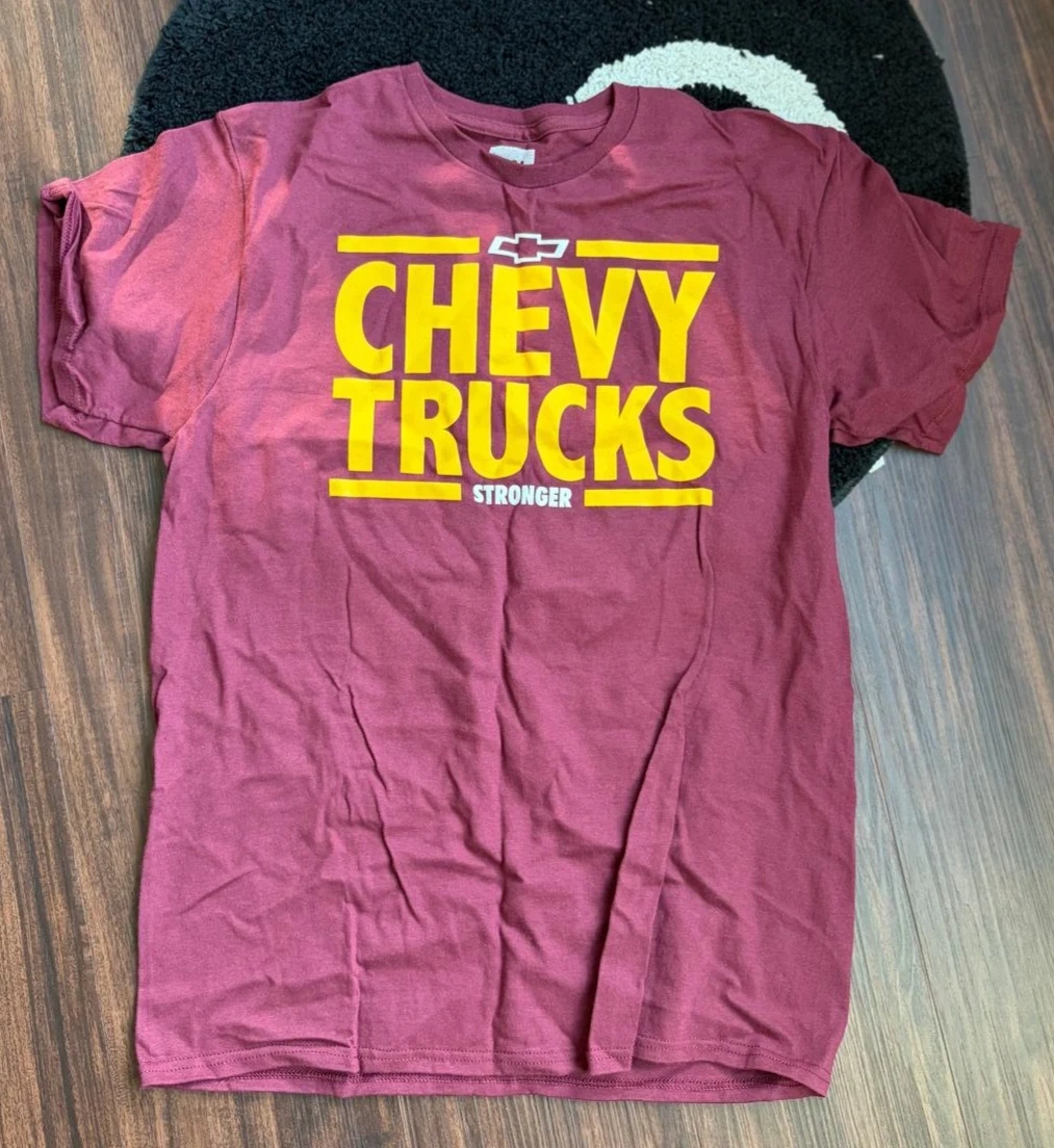 This is a GM Chevy Trucks t-shirt in size medium. It's a maroon colour with yellow lettering. The shirt is made of 100% cotton and is officially licensed by General Motors.