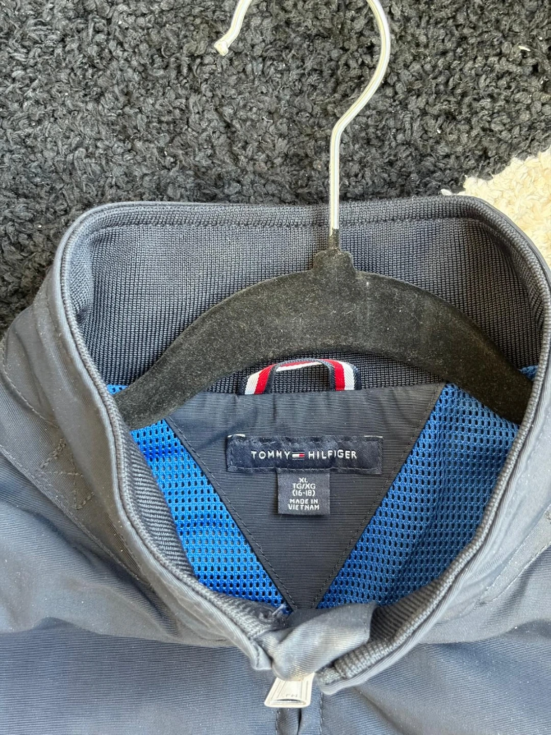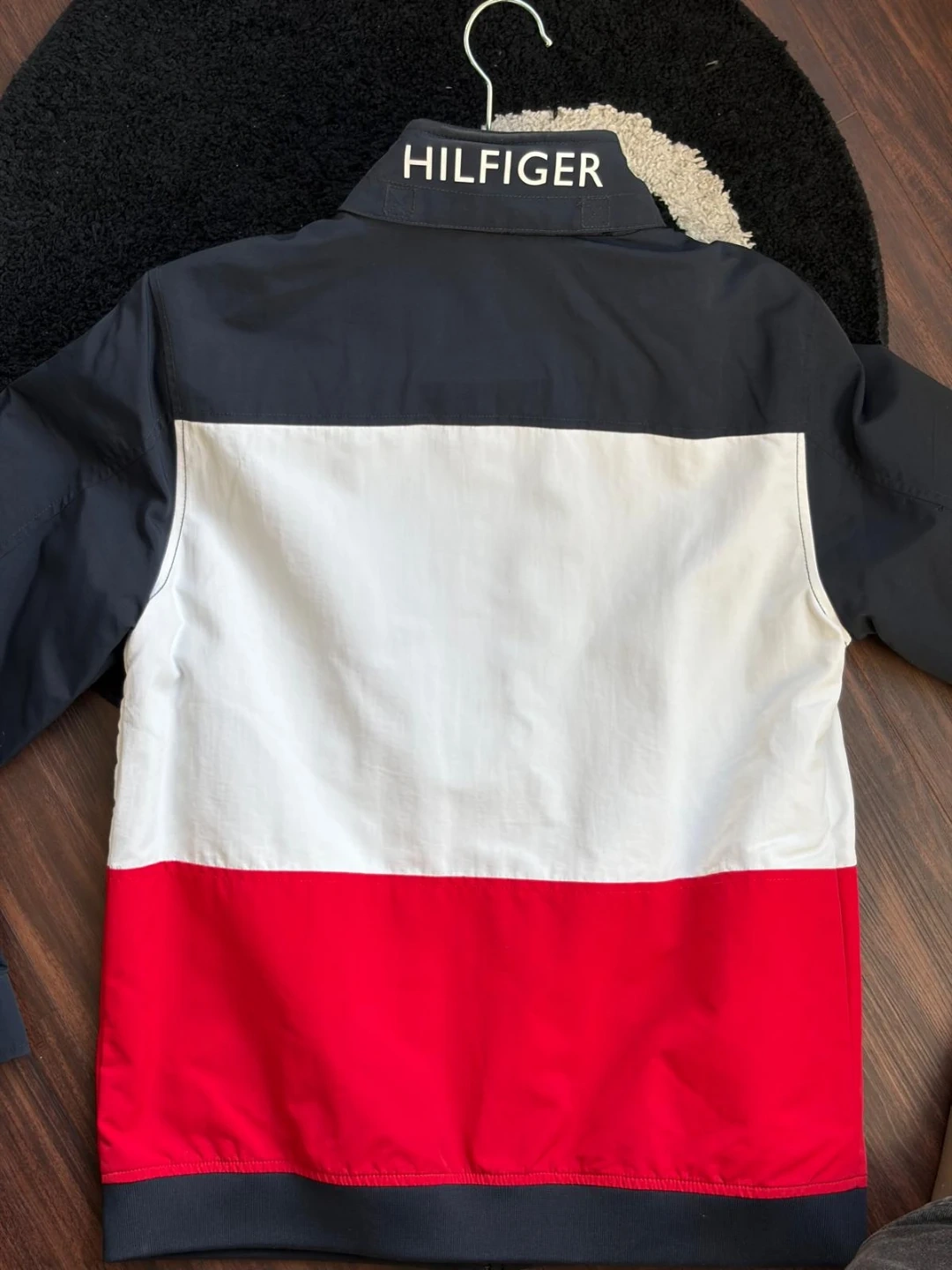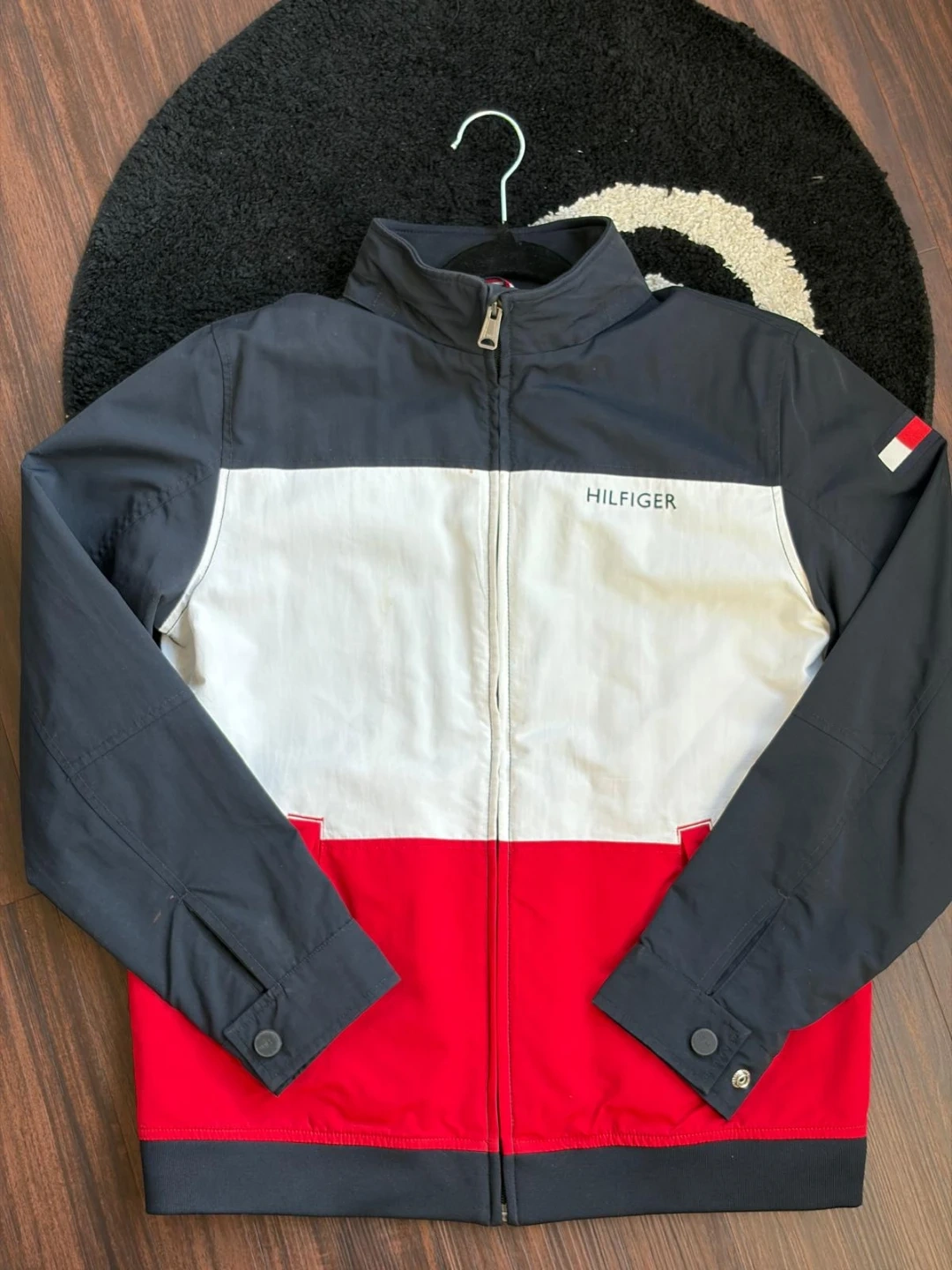 I'm selling a Tommy Hilfiger jacket in excellent condition! It features a stylish colour block design in black, white, and red. The size is 10/12 (TG/XG). Perfect for keeping warm and looking great