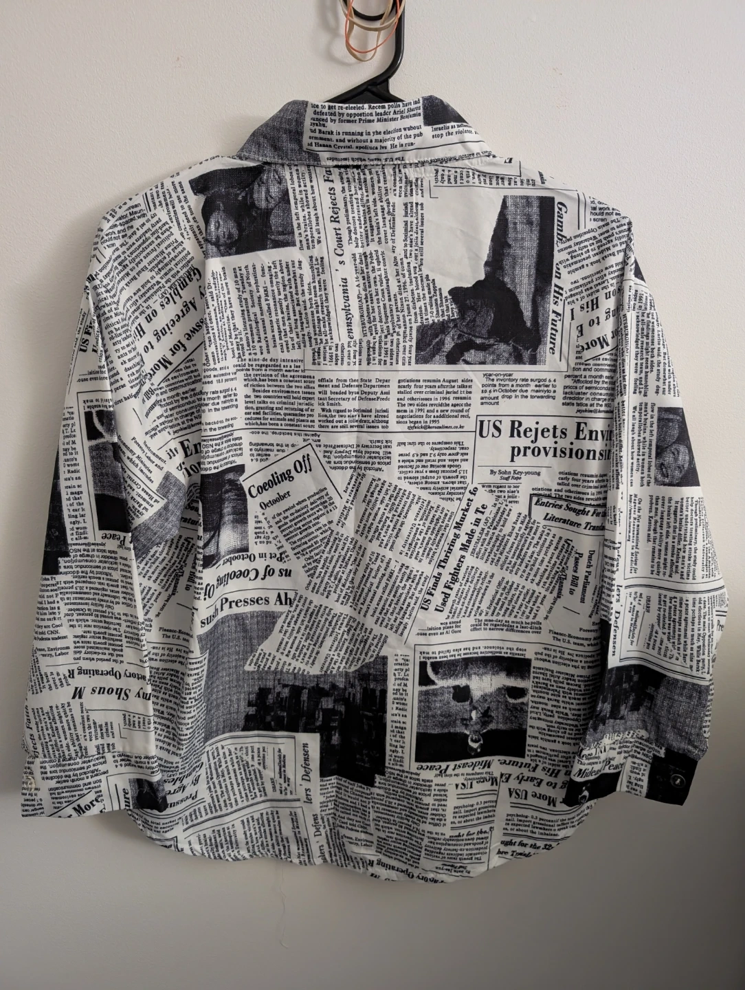 Fun and unique newspaper print button-down shirt! It's a statement piece that's sure to turn heads. The shirt features a black and white newspaper print all over. Perfect for adding a touch of vintage flair to your wardrobe.