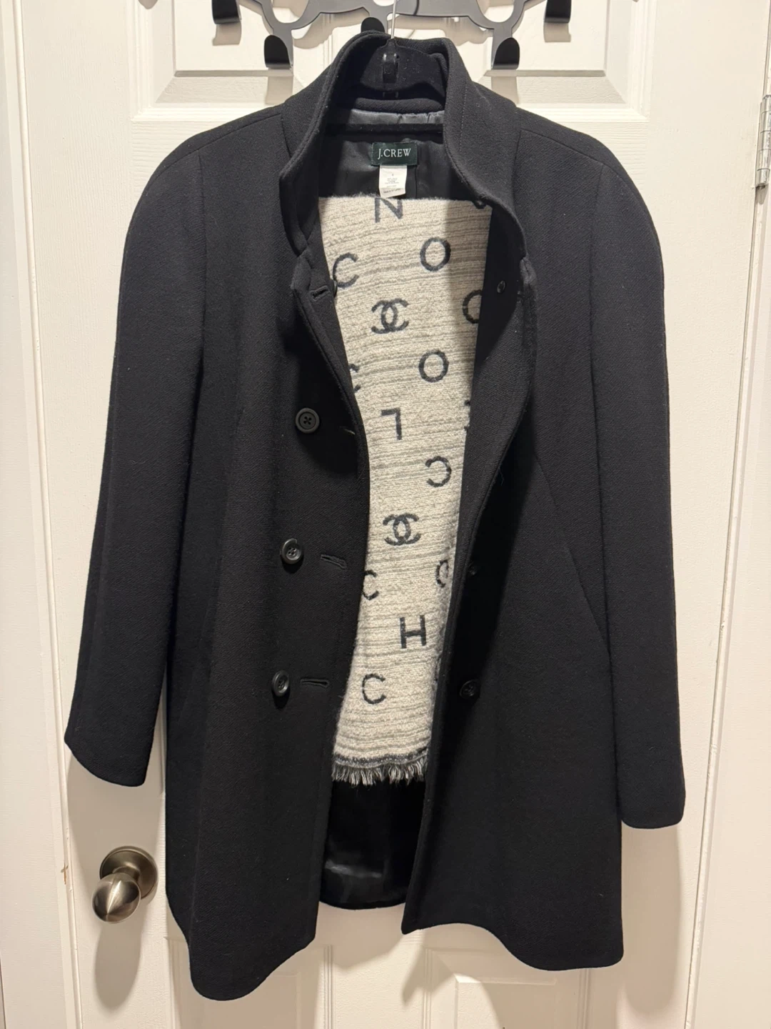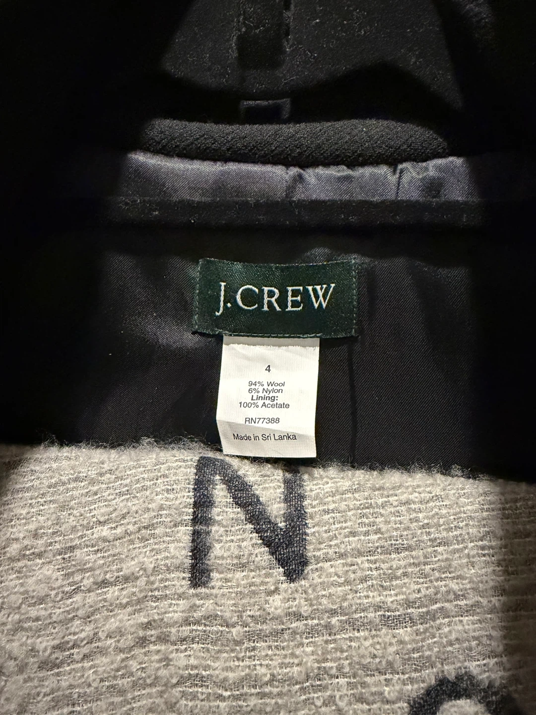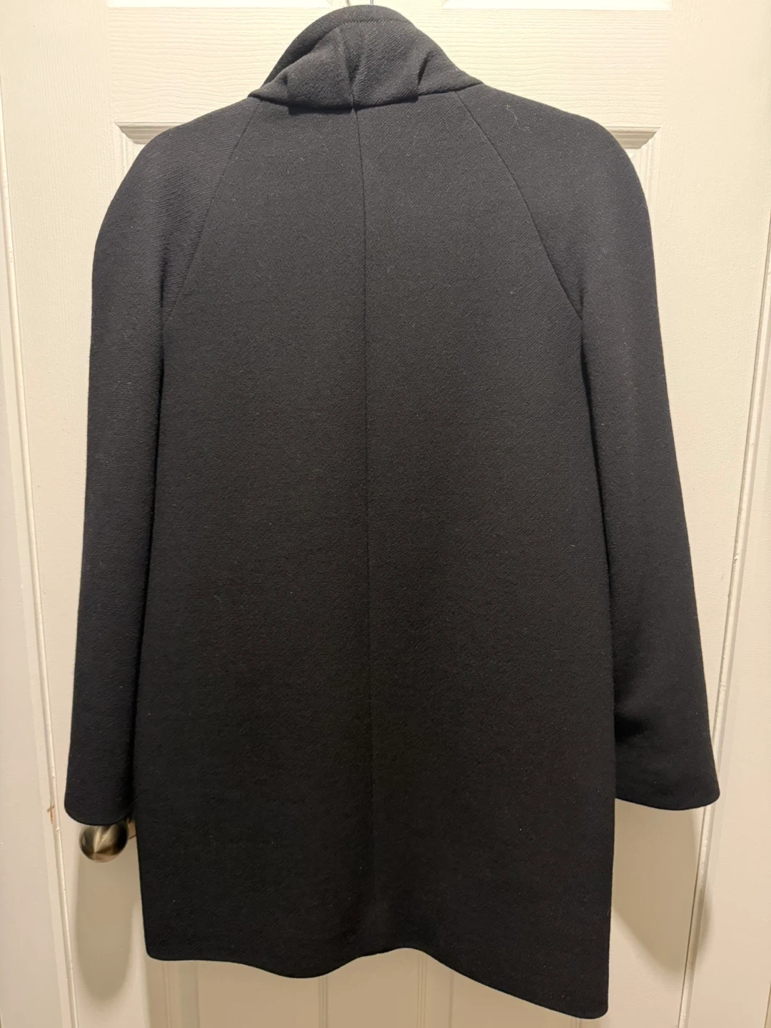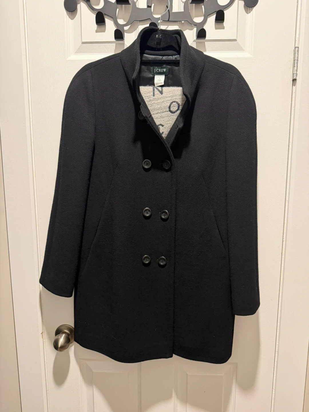 Selling a classic black wool coat from J.Crew. It's a size 4 and in great condition. The outer shell is 94% wool and 6% nylon, with a 100% acetate lining. A stylish and warm addition to your wardrobe for those chilly Canadian days!