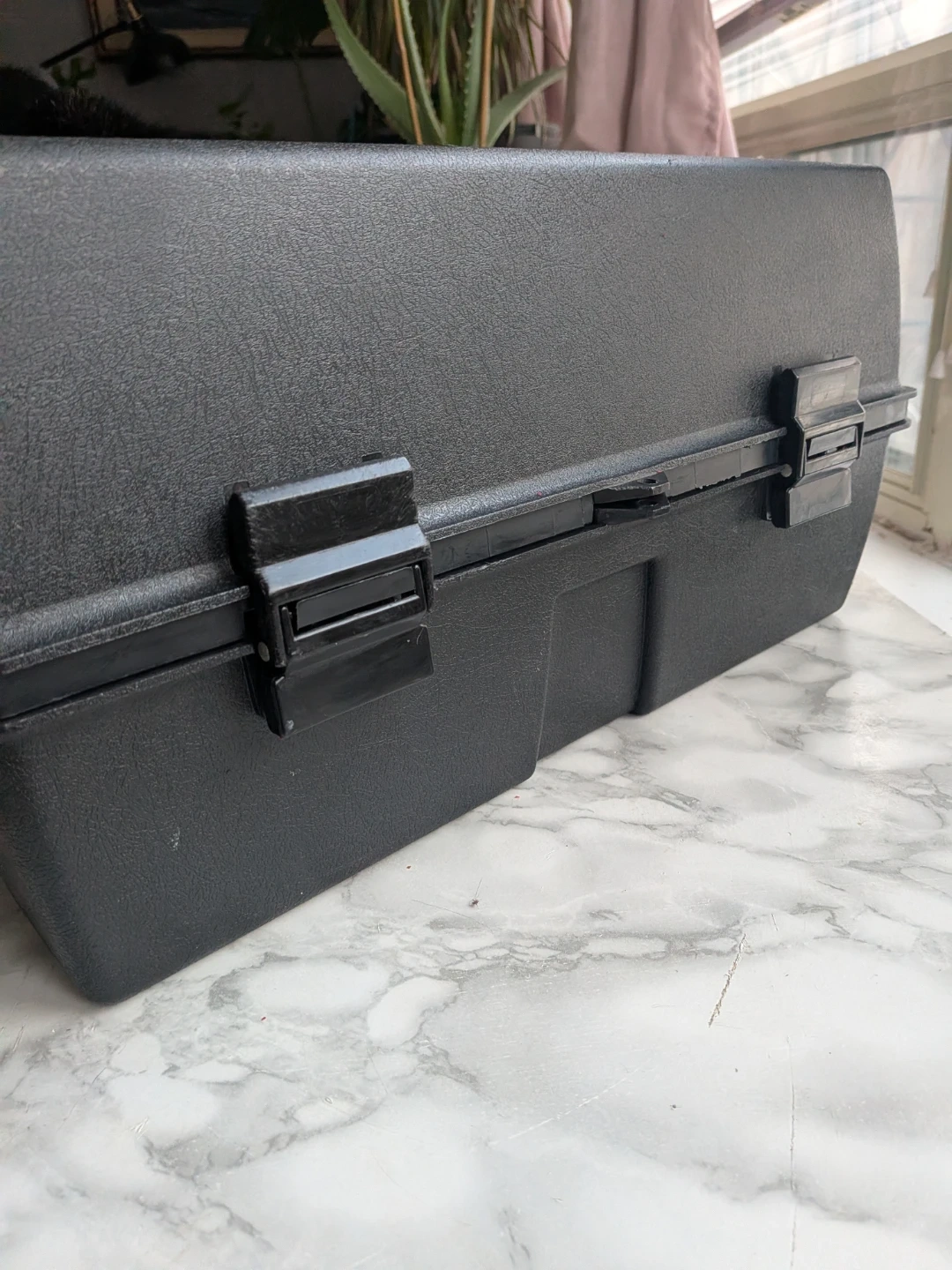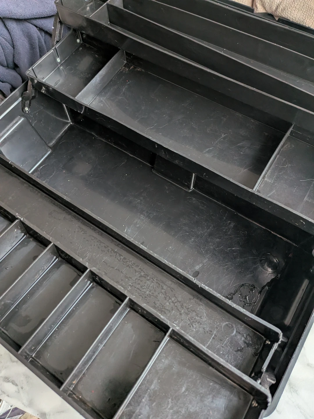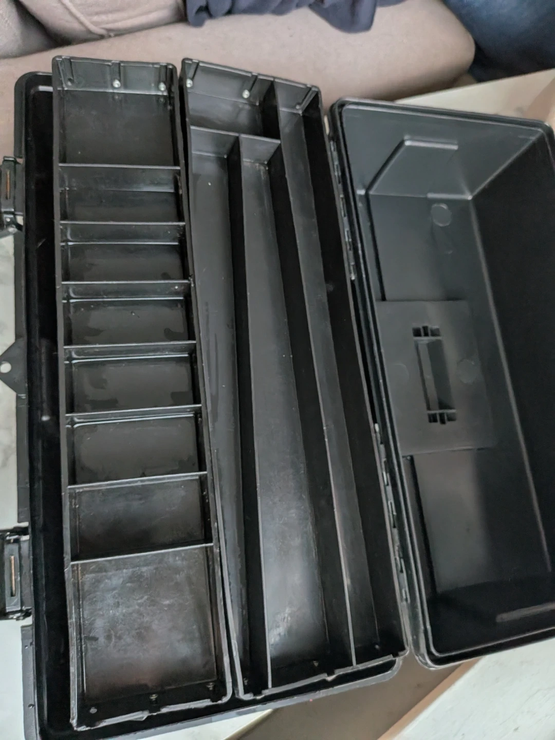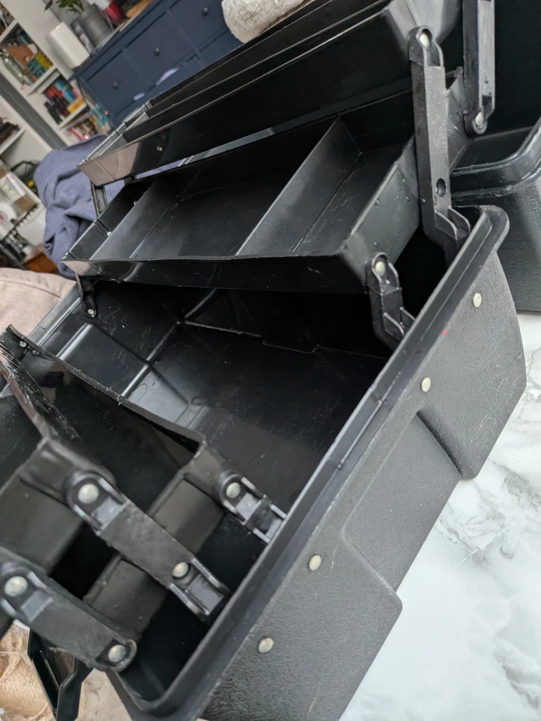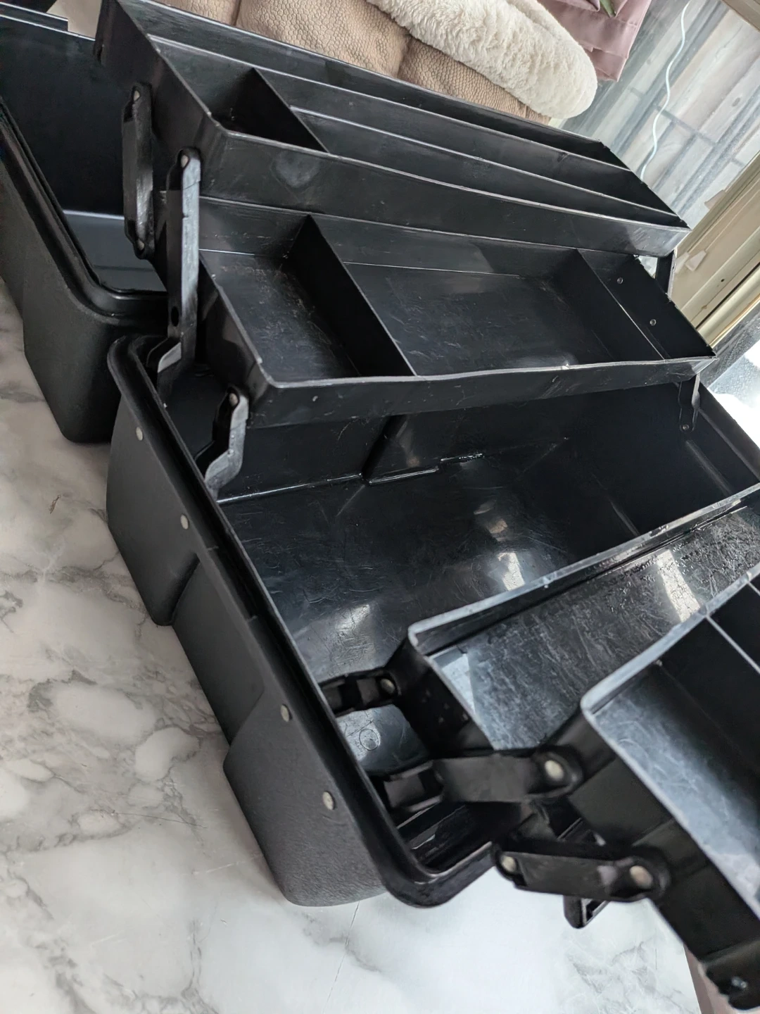 Selling a black cantilever tool box. It has multiple trays that pull out when opened. Great for storing tools or craft supplies!