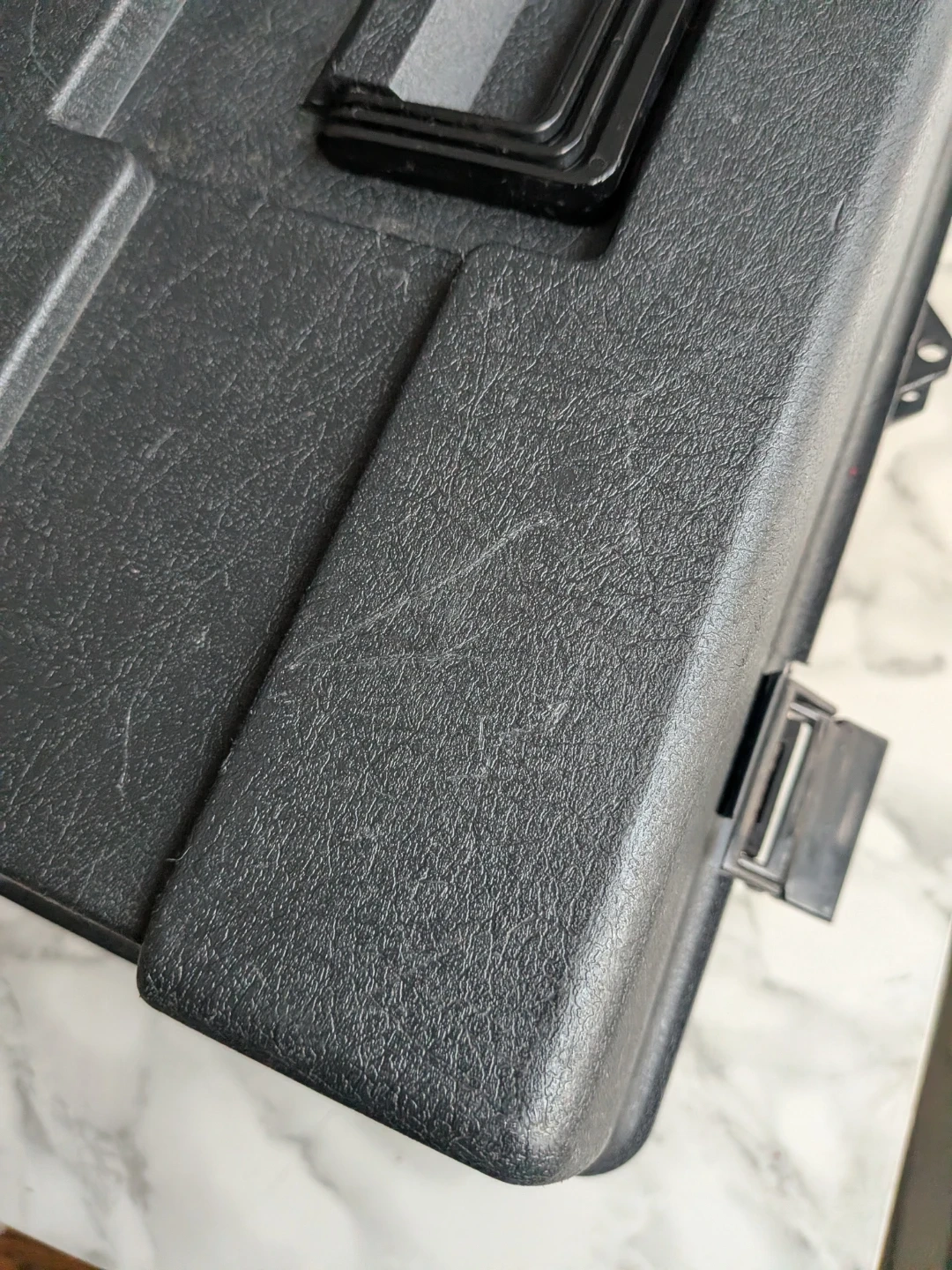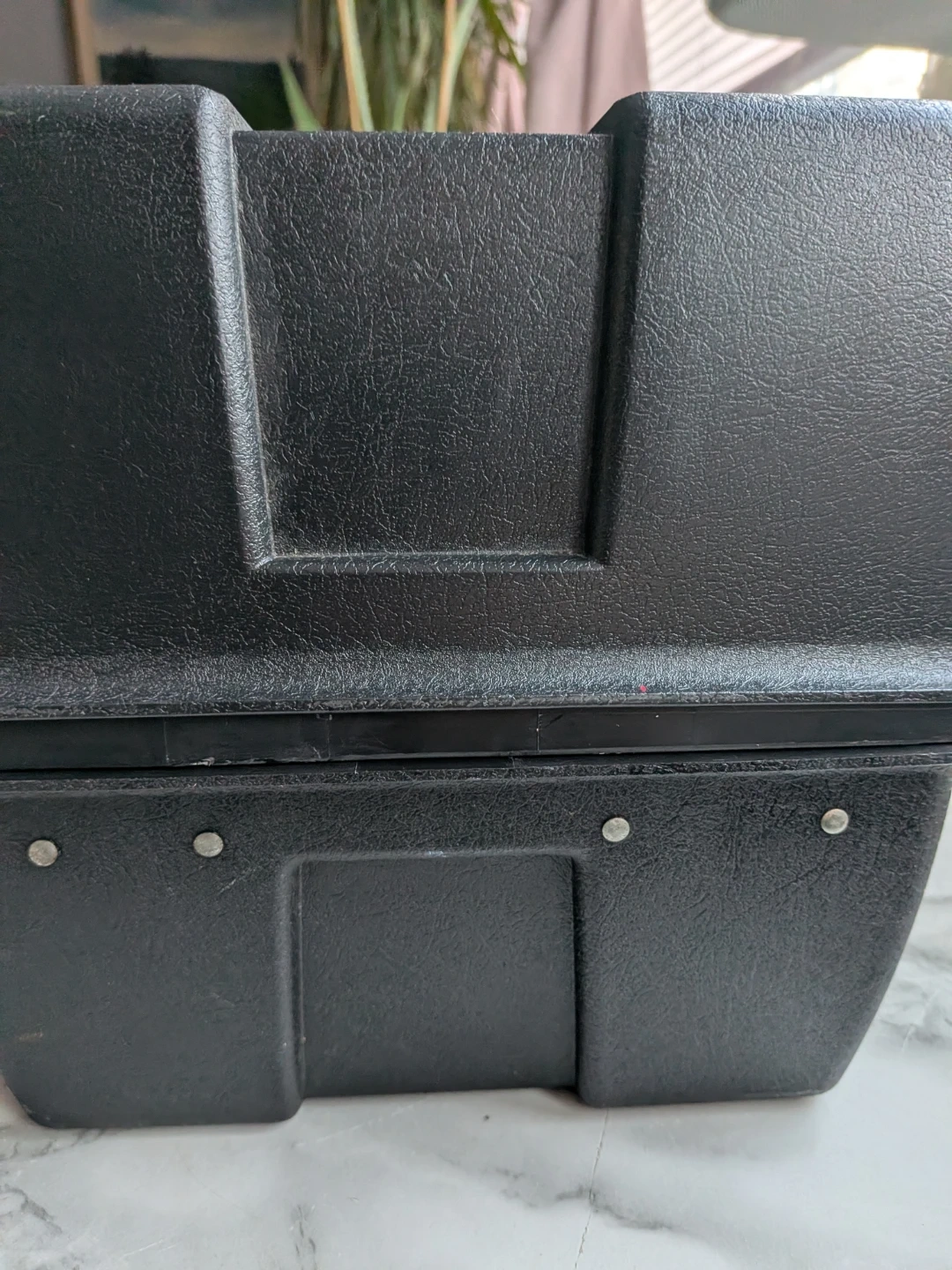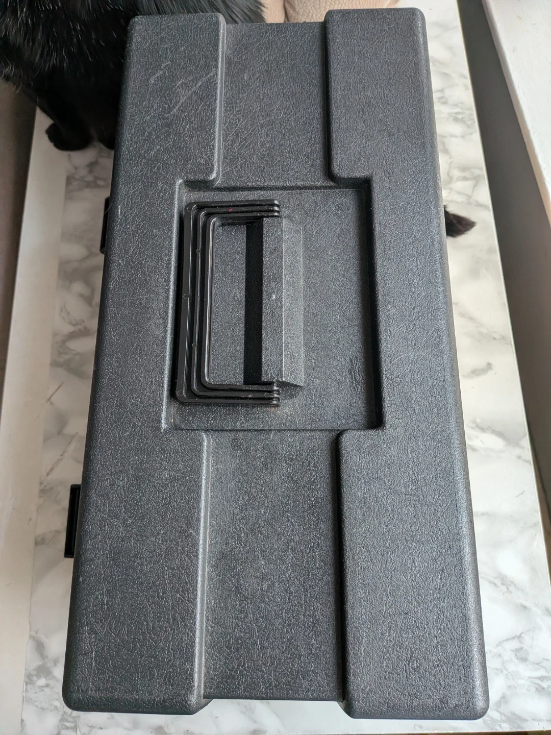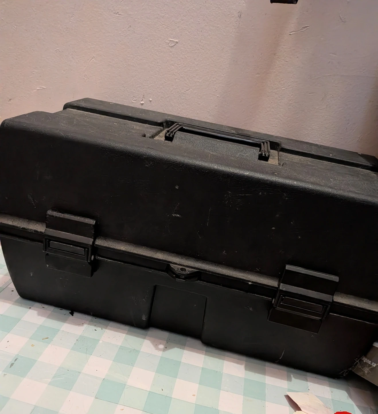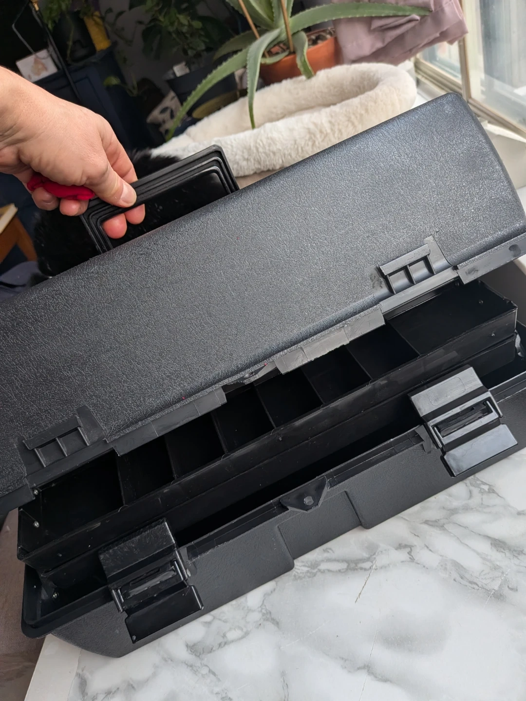 Selling a black cantilever tool box. It has multiple trays that pull out when opened. Great for storing tools or craft supplies!