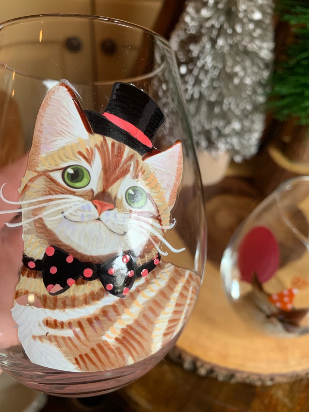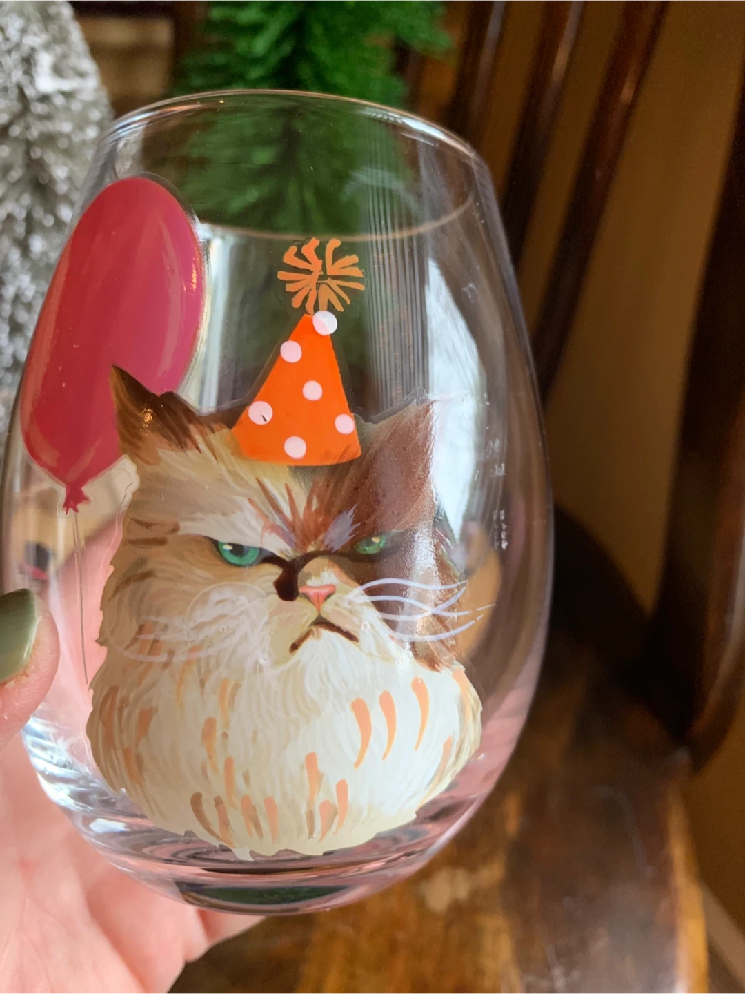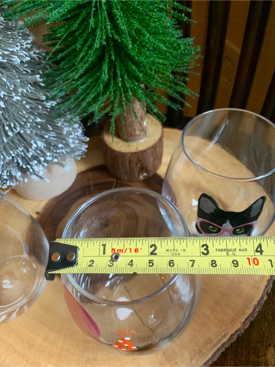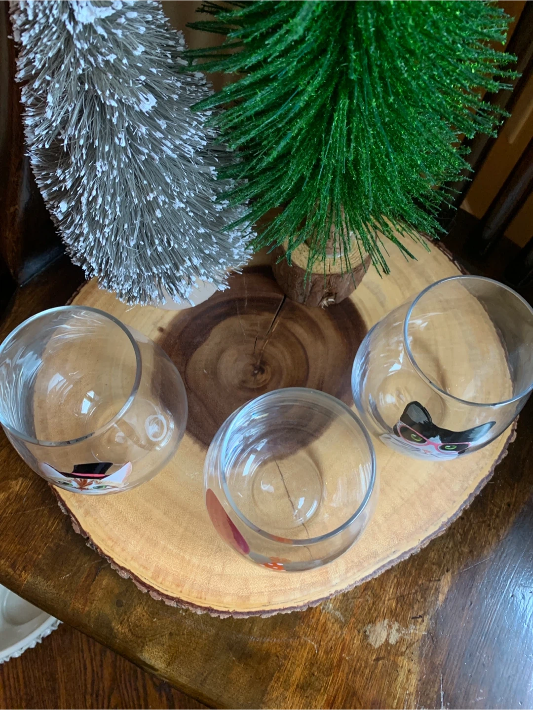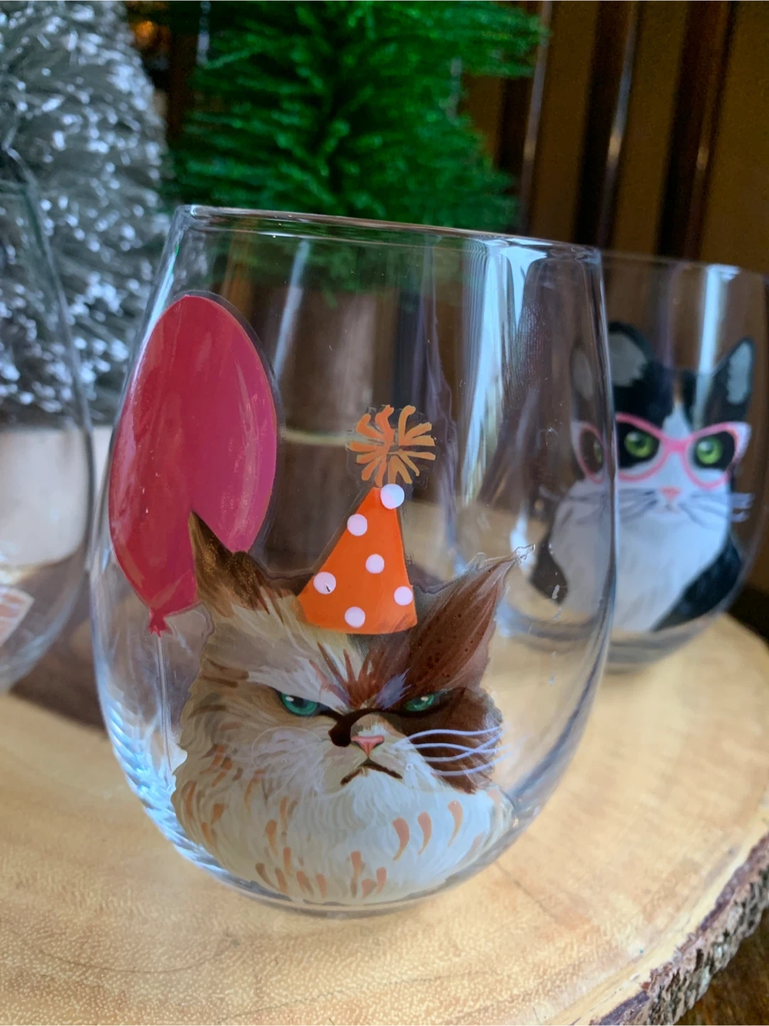 Selling a set of adorable stemless wine glasses featuring adorable cat designs! One is a grumpy birthday cat, a top hat cat and one with pink glasses. These are perfect for any cat lover or as a unique addition to your glassware collection. Each glass has a different cat illustration, adding a touch of whimsy to your drinkware. They are in near perfect condition, just top hat cat has a little paint missing from his fur. Elevate your wine drinking and have some fun with these glasses!π»