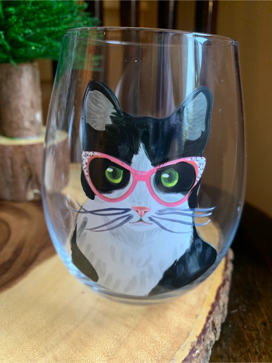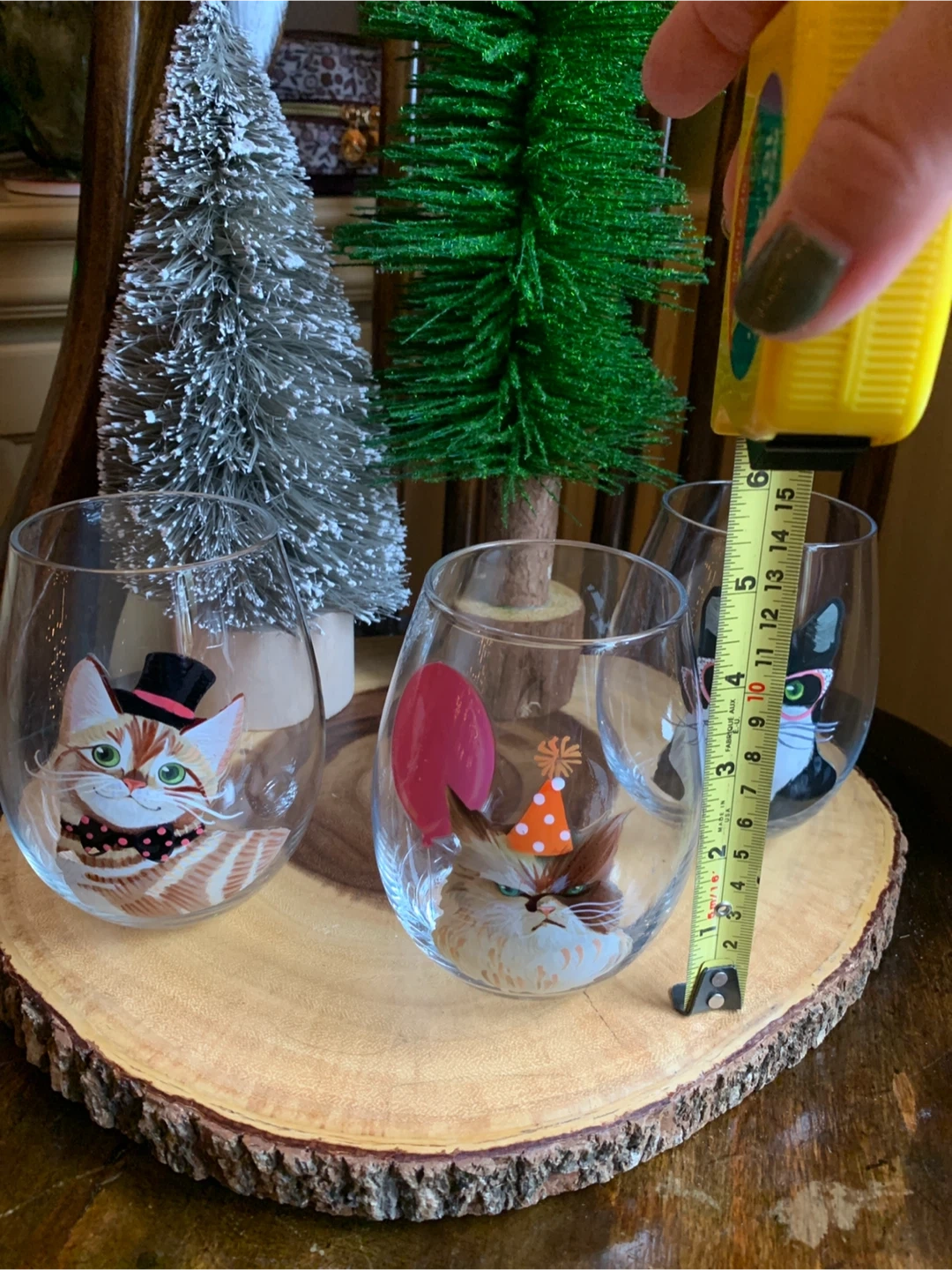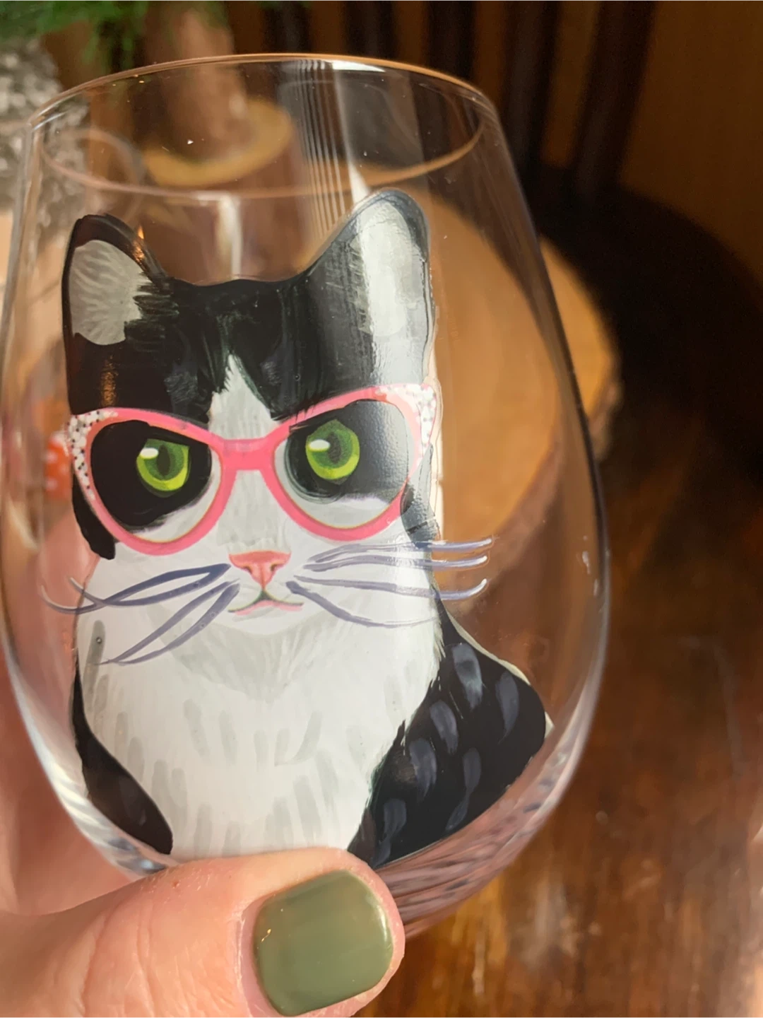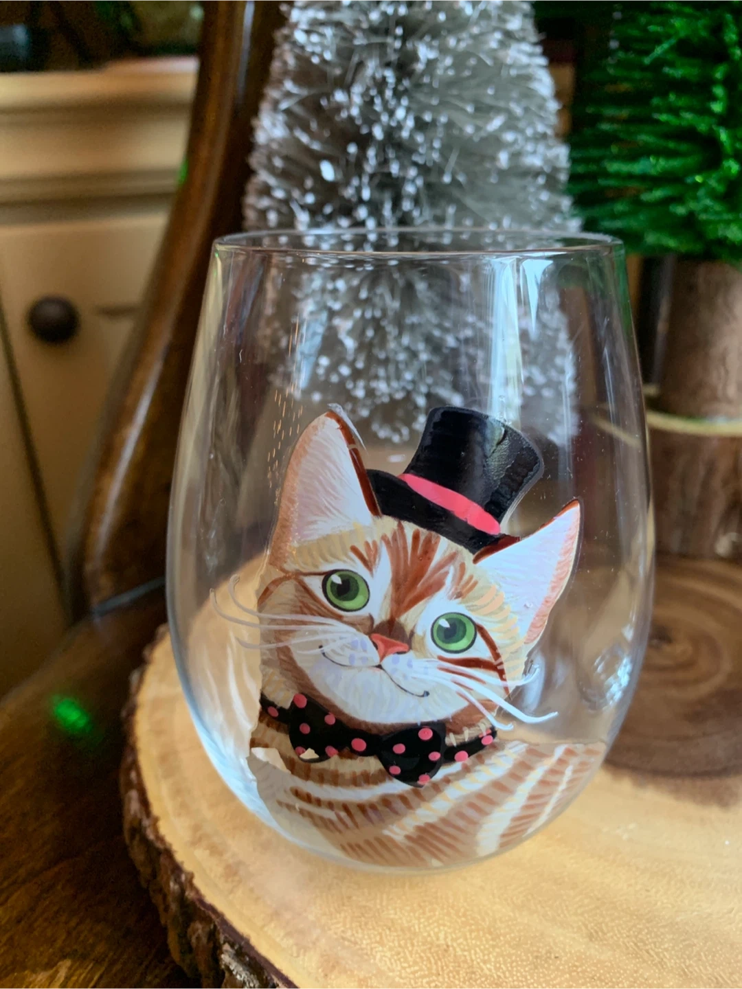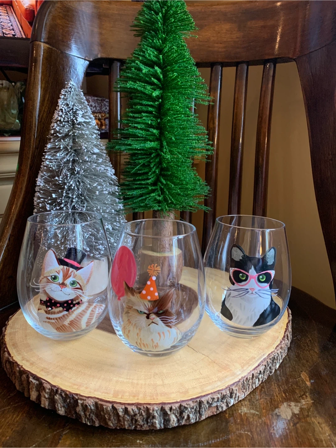 Selling a set of adorable stemless wine glasses featuring adorable cat designs! One is a grumpy birthday cat, a top hat cat and one with pink glasses. These are perfect for any cat lover or as a unique addition to your glassware collection. Each glass has a different cat illustration, adding a touch of whimsy to your drinkware. They are in near perfect condition, just top hat cat has a little paint missing from his fur. Elevate your wine drinking and have some fun with these glasses!π»