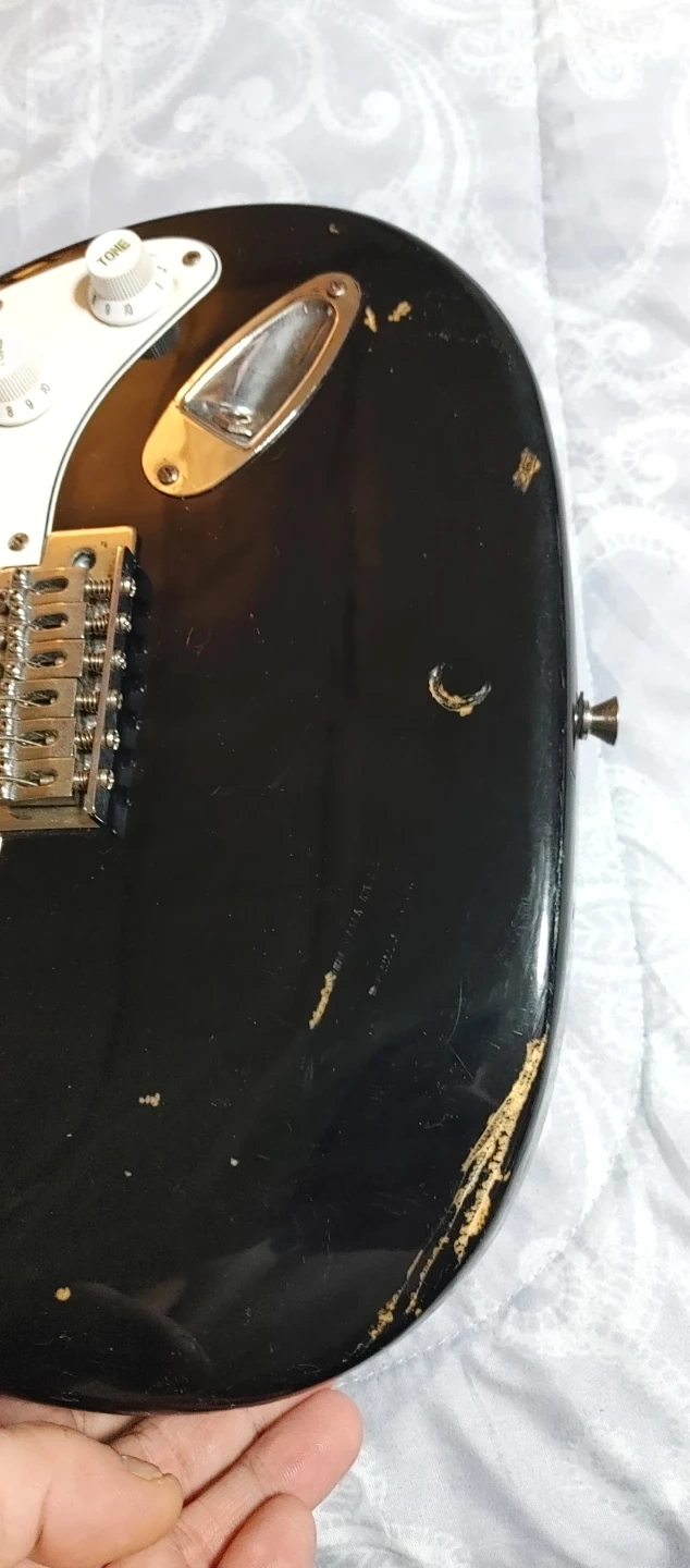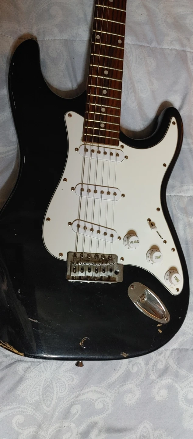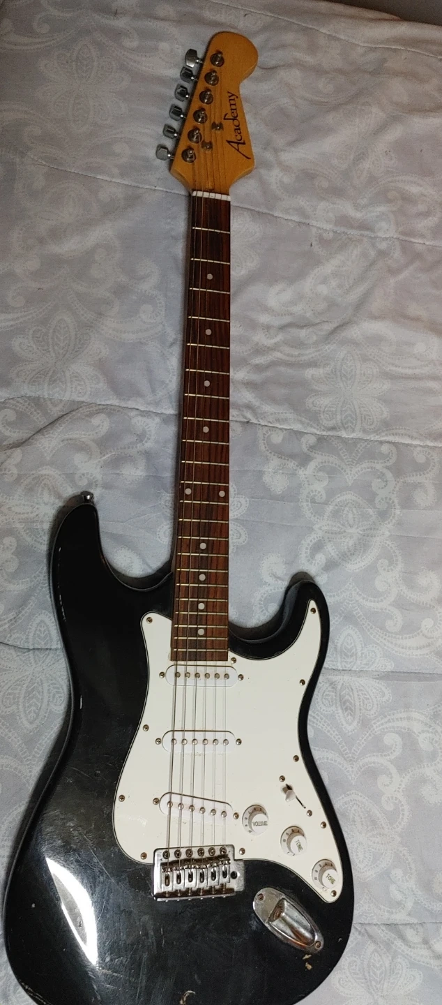 Selling an Academy electric guitar. It's in used condition, but still has lots of life left in it! Perfect for someone just starting out or looking for a practice guitar has scratches on the bottom Edge not broken just scratches doesn't affect the playing still a good starter guitar