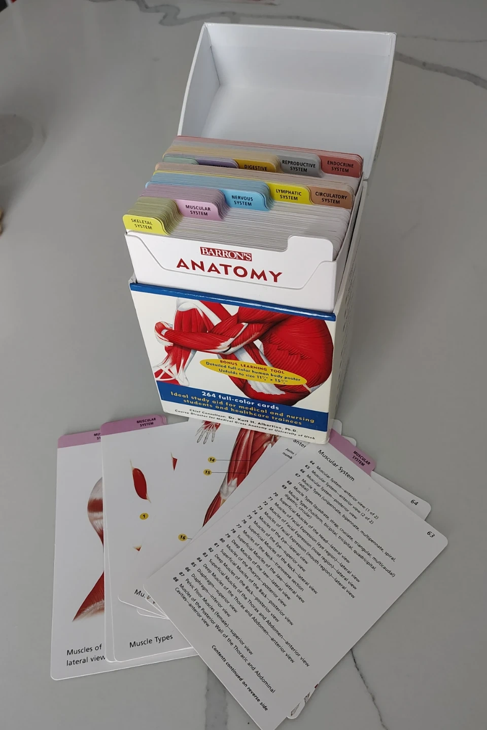 264 full colour flash cards detailing all major systems in the human body. Includes 11x16 full body poster. Perfect for studying any biology related courses. Slight damage to box.