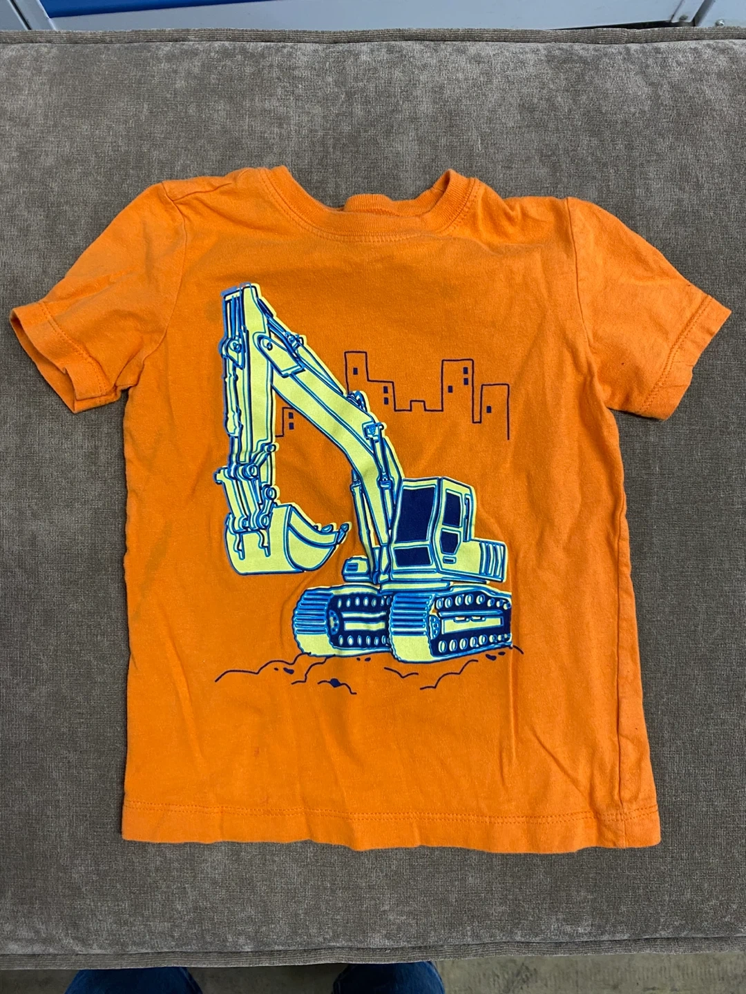 A bright orange kids' t-shirt featuring a cool excavator print! It's perfect for any young construction fan..size 3T