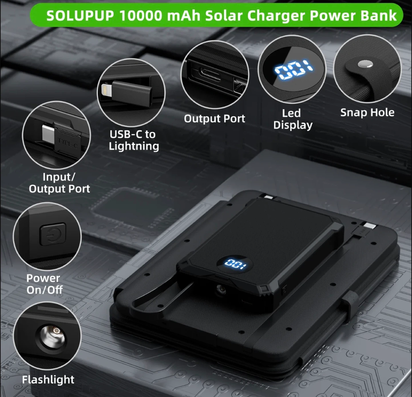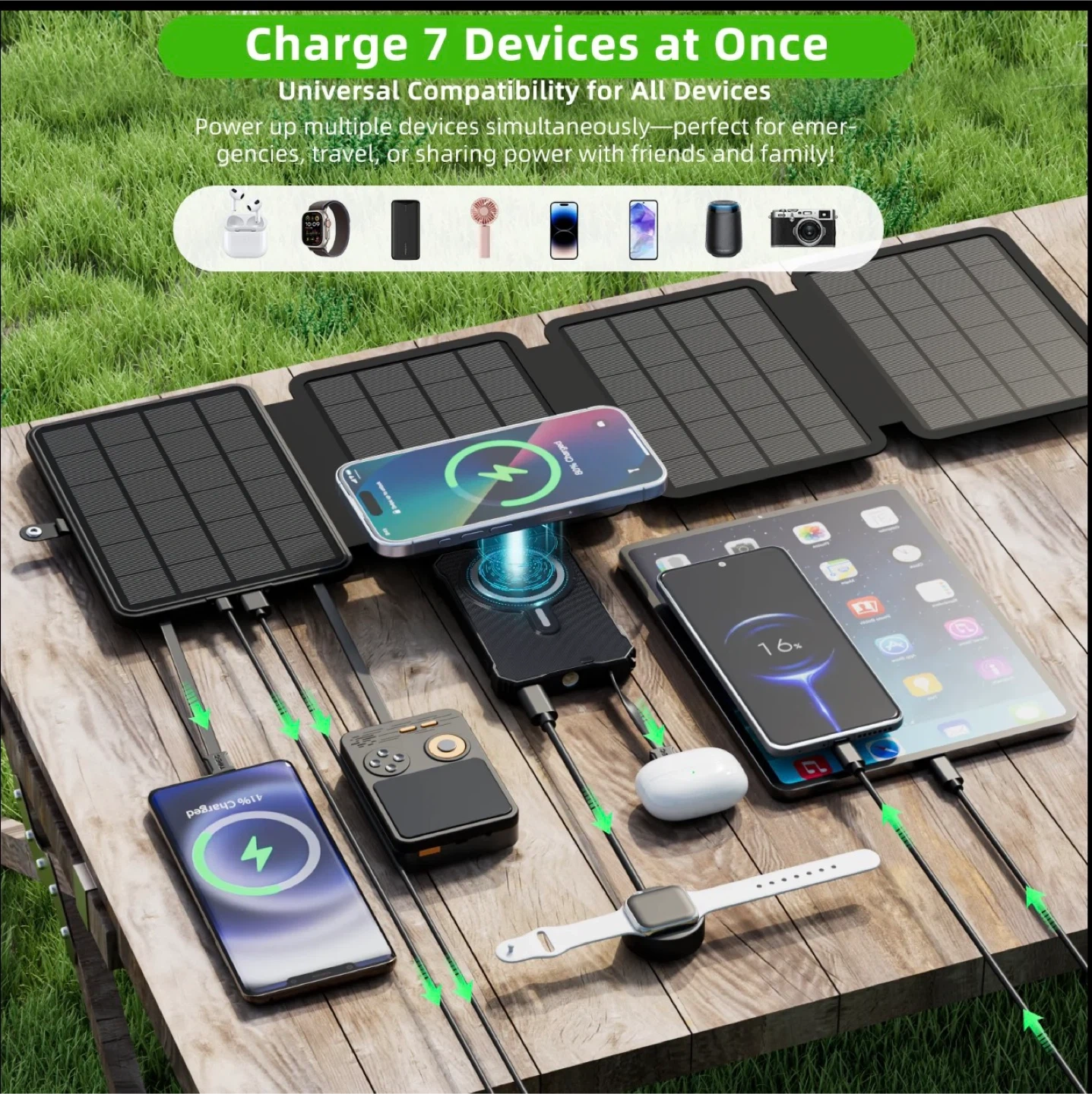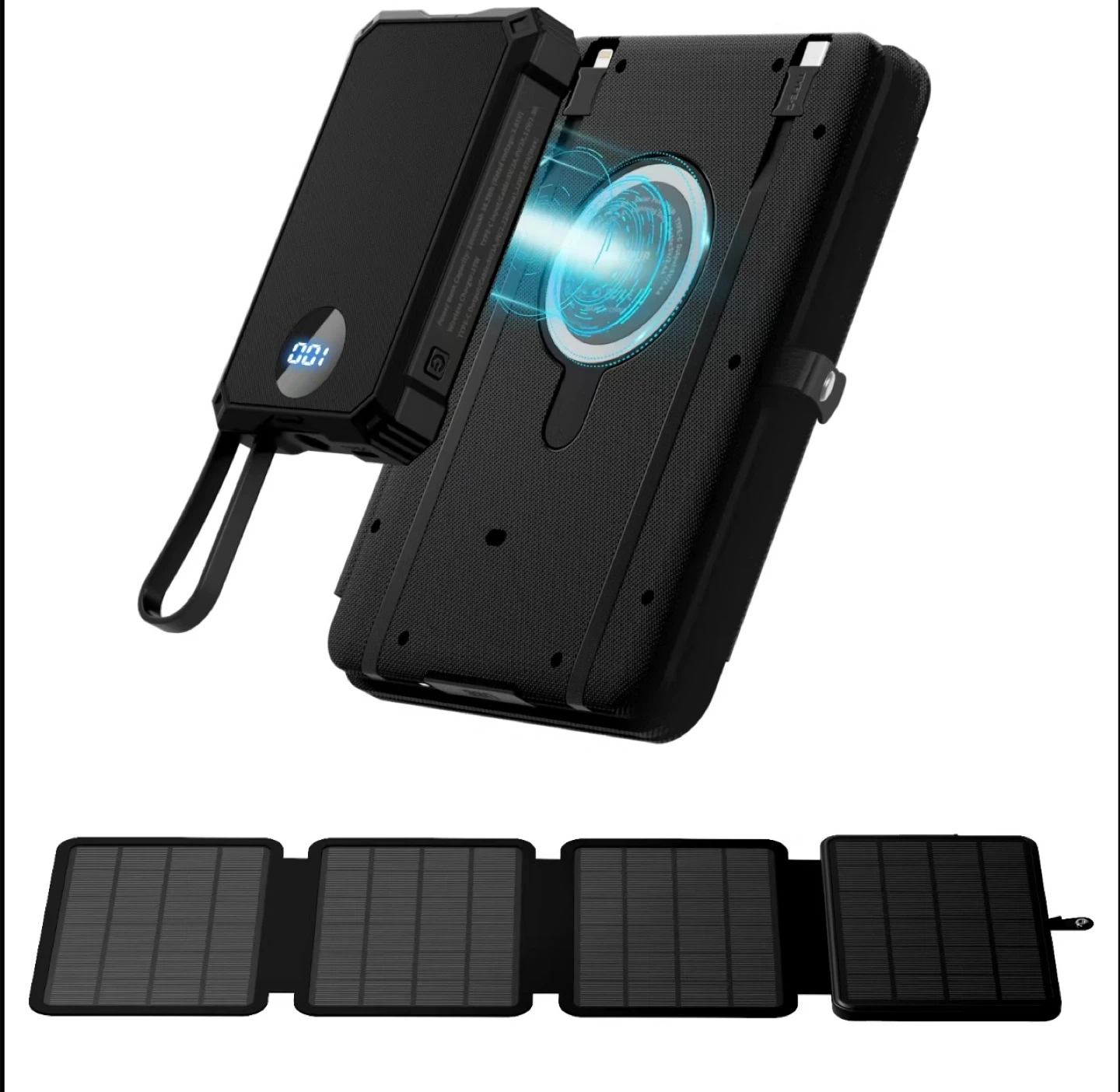 10000mAh Solar Power Bank, Detachable Solar Panel, 14W Foldable, Magnetic Charging, 5 Port Fast Charging, IPX5 Waterproof, Works Separately for Phones/Tablets, Camping Outdoor