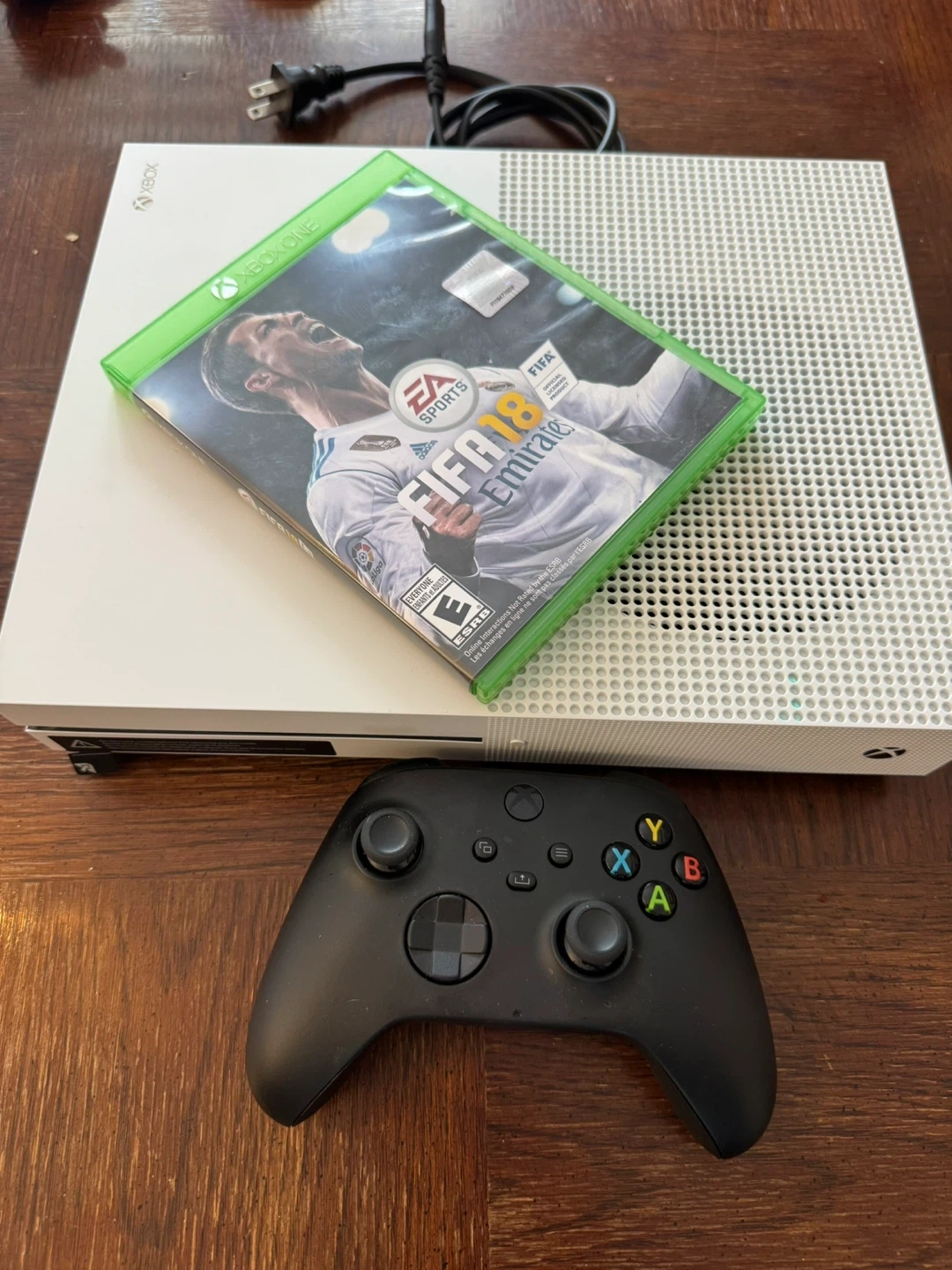 Selling an Xbox One S console. 1Tb Hard drive. It comes with a black controller, power cable, hdmi cable, and the game FIFA 18. Perfect for some gaming fun!