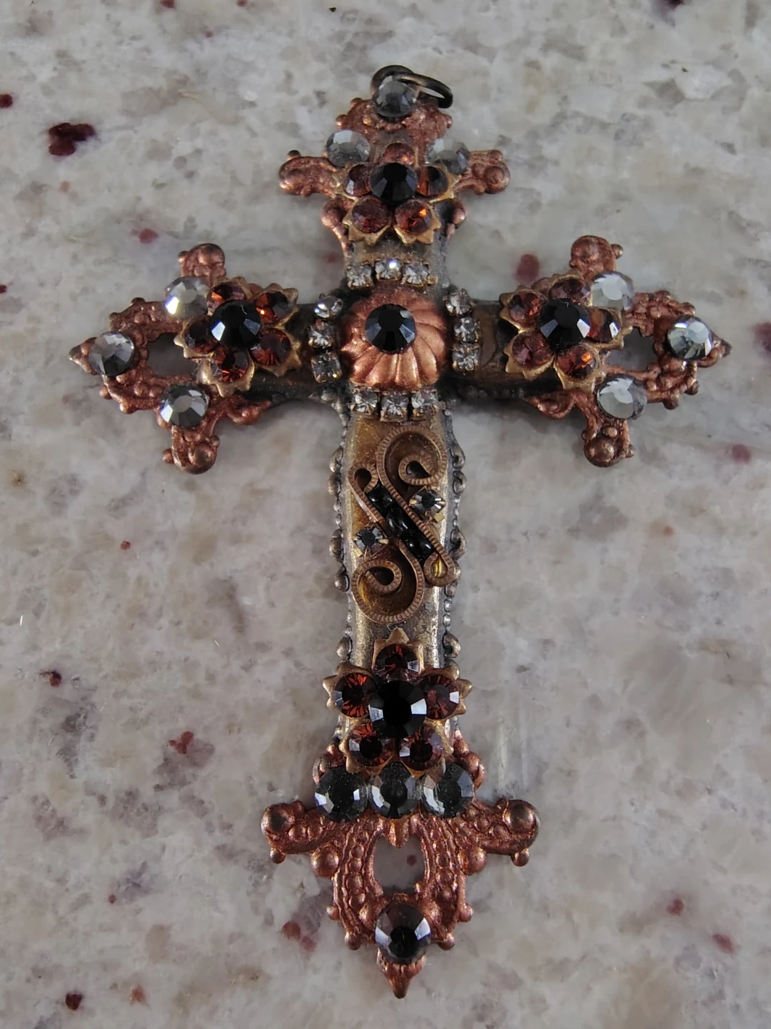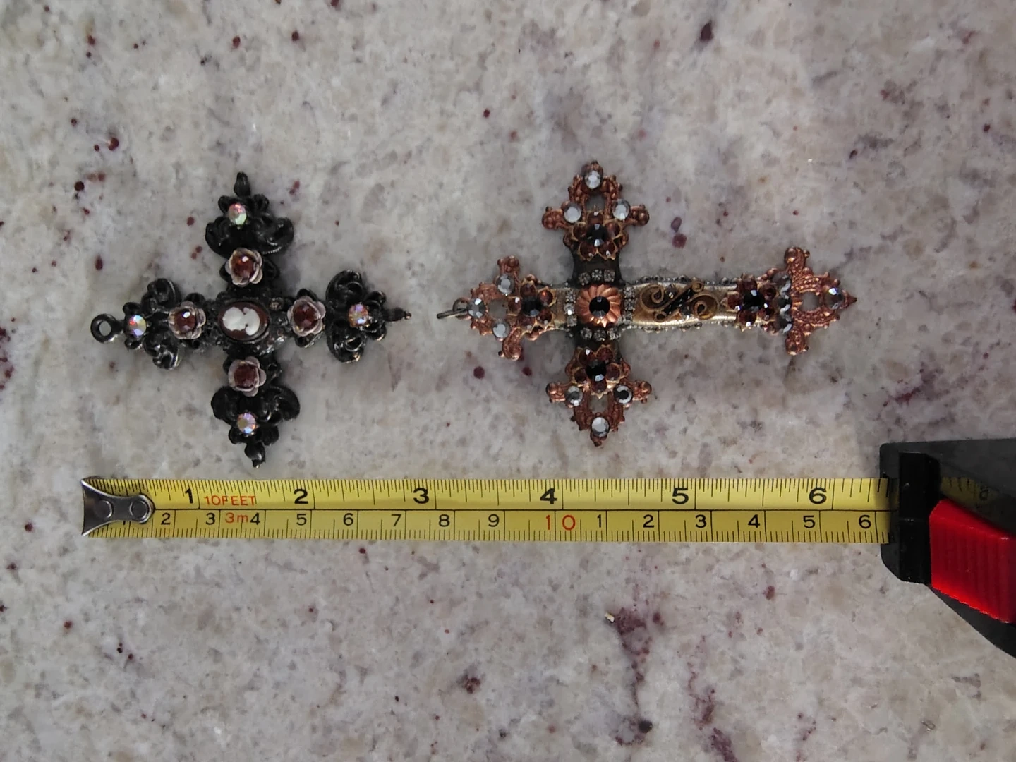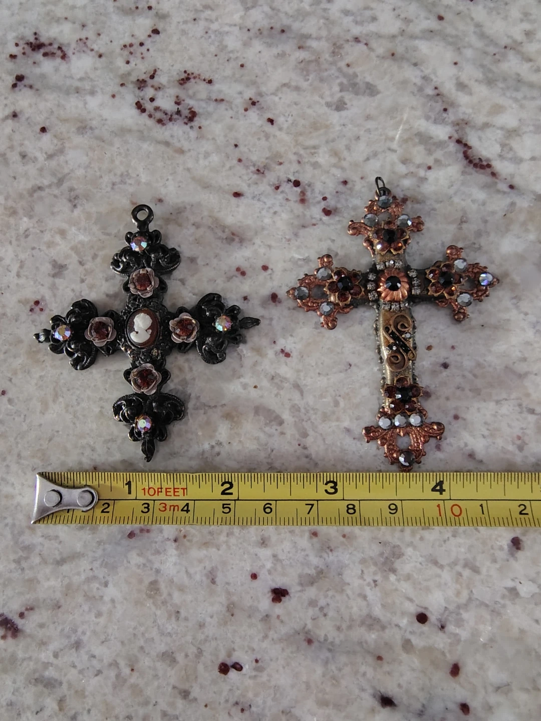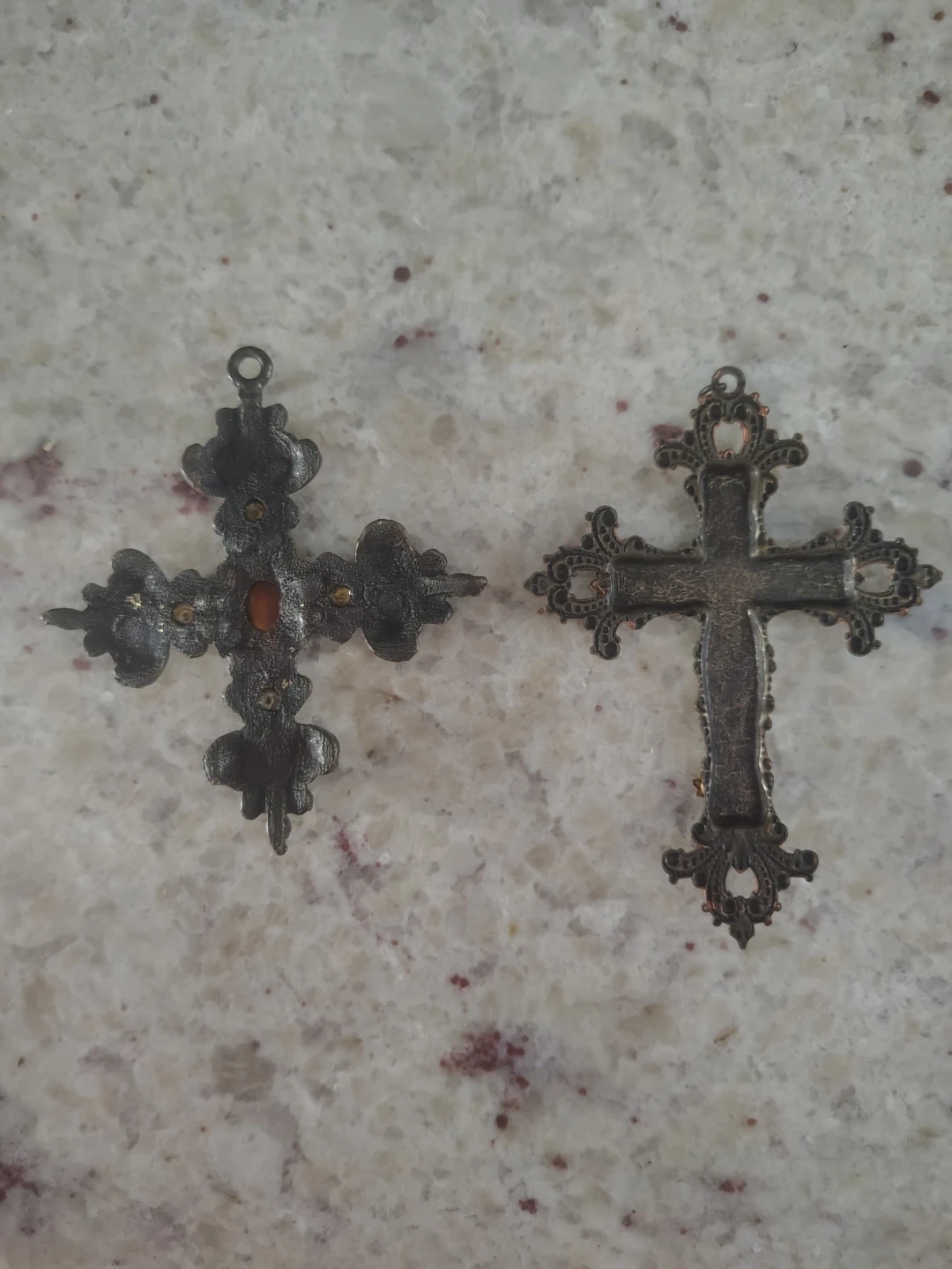 Two attractive religious cross pendants, costume jewellery. Bought new in the early 2000s and stored unused in a sealed baggie since then.