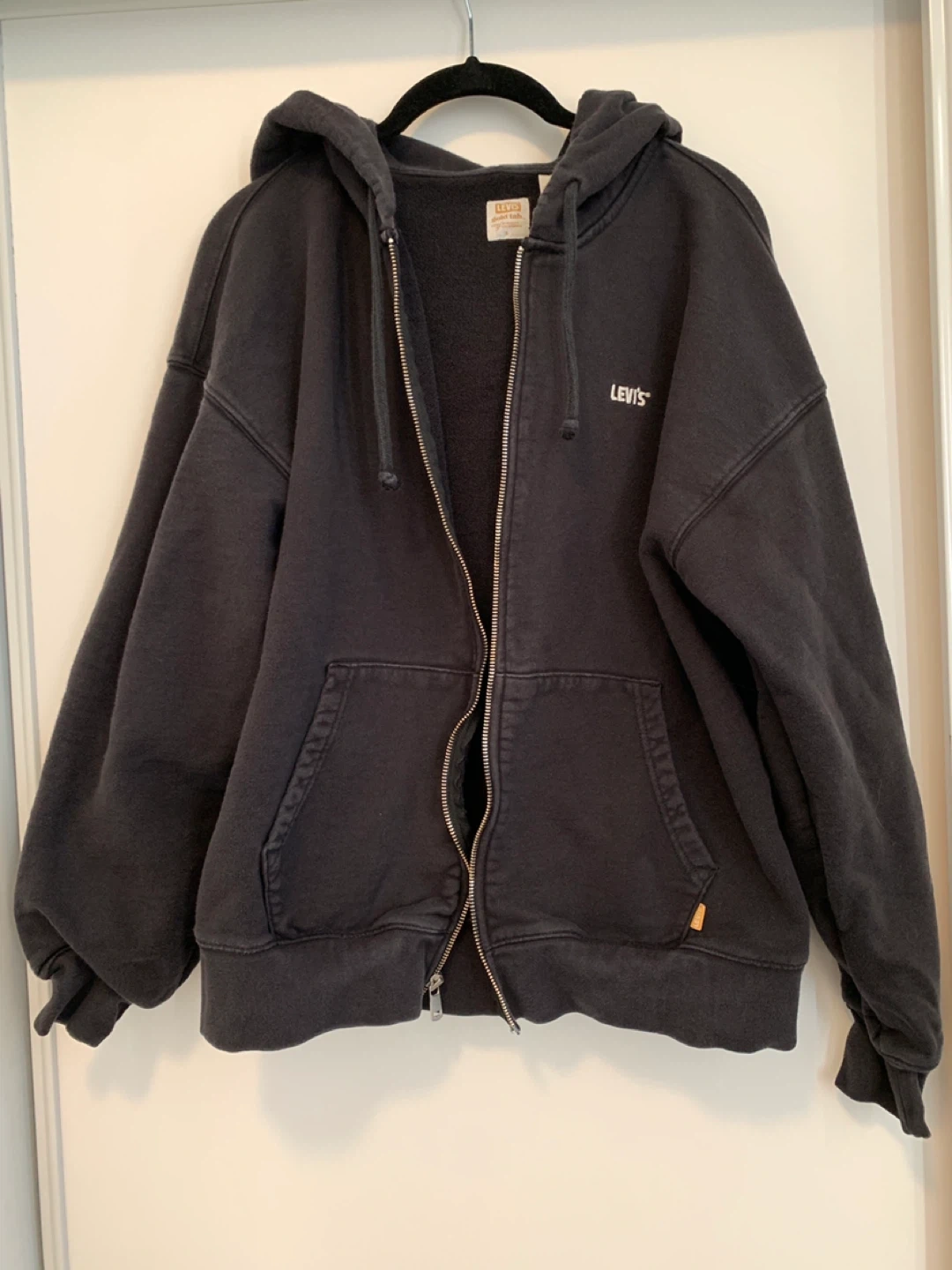 Selling a Levi's black zip-up hoodie. It shows some signs of wear, but it's still in good condition and has lots of life left! Perfect for layering or wearing on its own