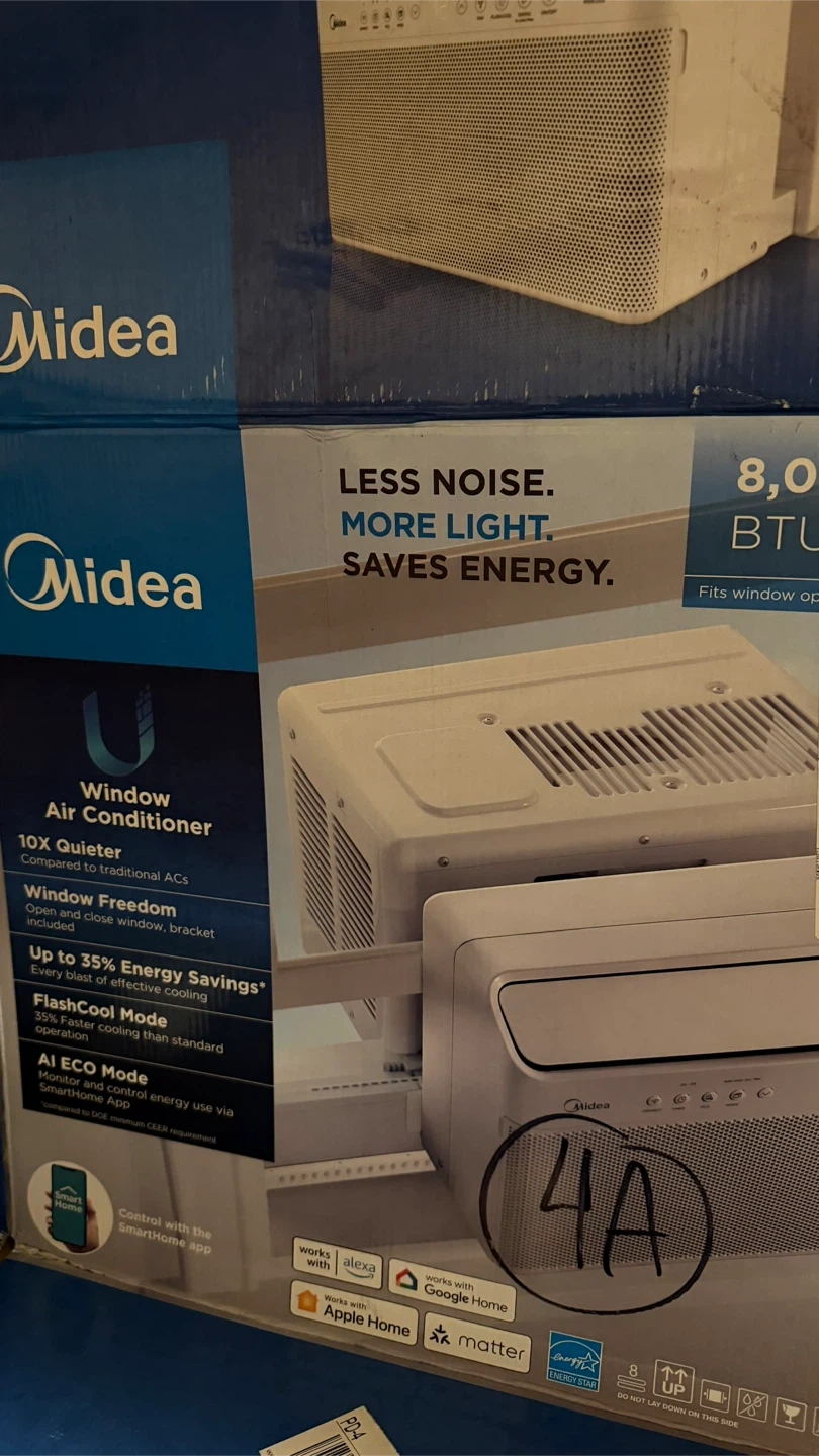 Selling a Midea 8,000 BTU window air conditioner in white. It fits window openings and promises less noise, more light, and energy savings. It also has window freedom for wide and close windows, and includes a bracket. Comes with a remote and can connect with Alexa, Apple home and Google Home. Price as new is $376. Only used one summer , selling because the new apartment has central AC