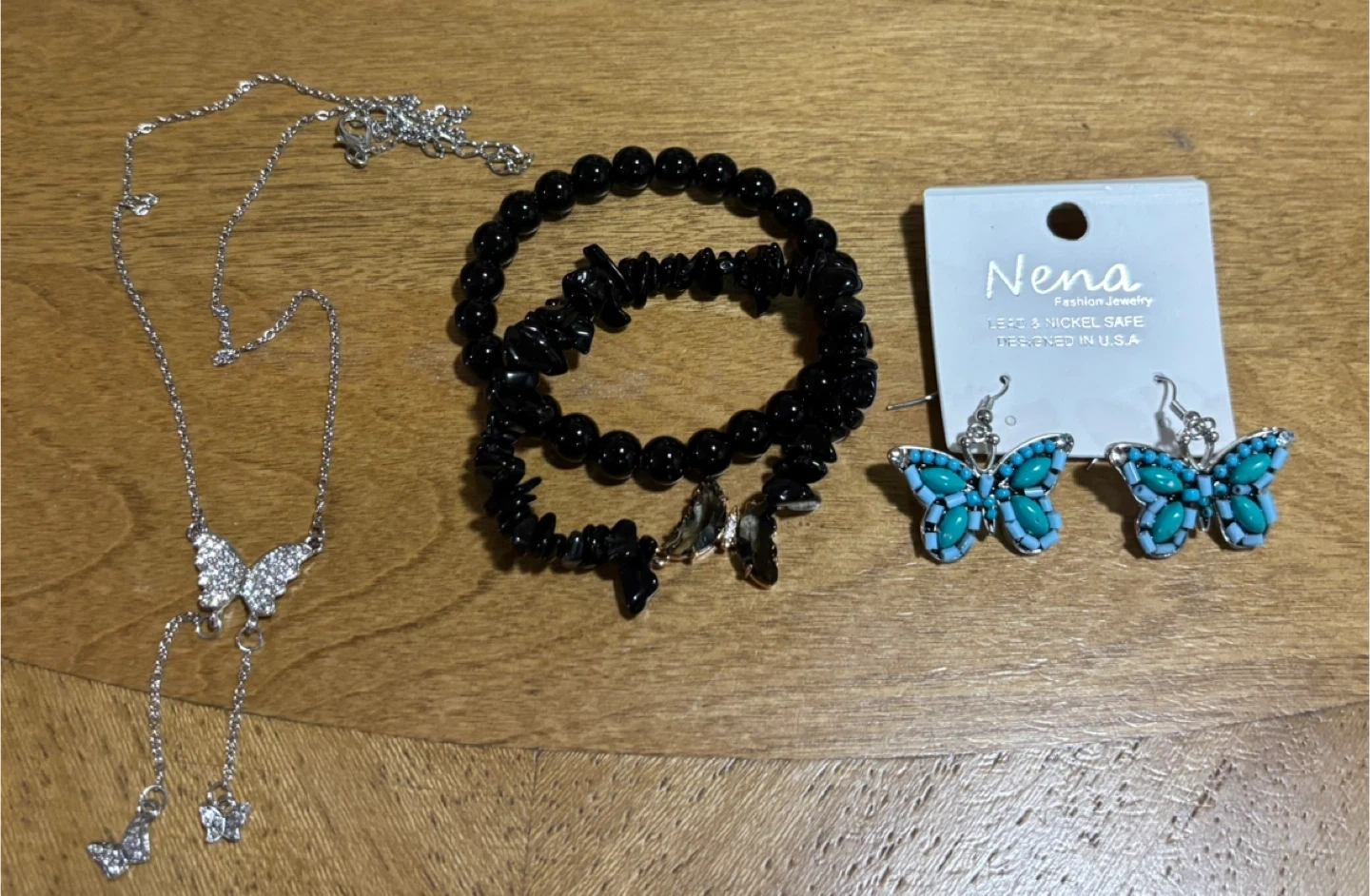 Selling a set of jewelry including a silver butterfly necklace, two black bracelets, and a pair of turquoise butterfly earrings!