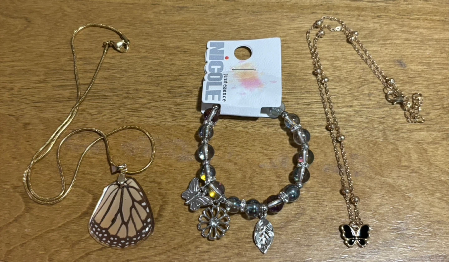 Here's a set of jewelry! There is a Nicole bracelet with charms and two butterfly necklaces, one gold and one black. They're all in great condition and ready to accessorize your outfits.