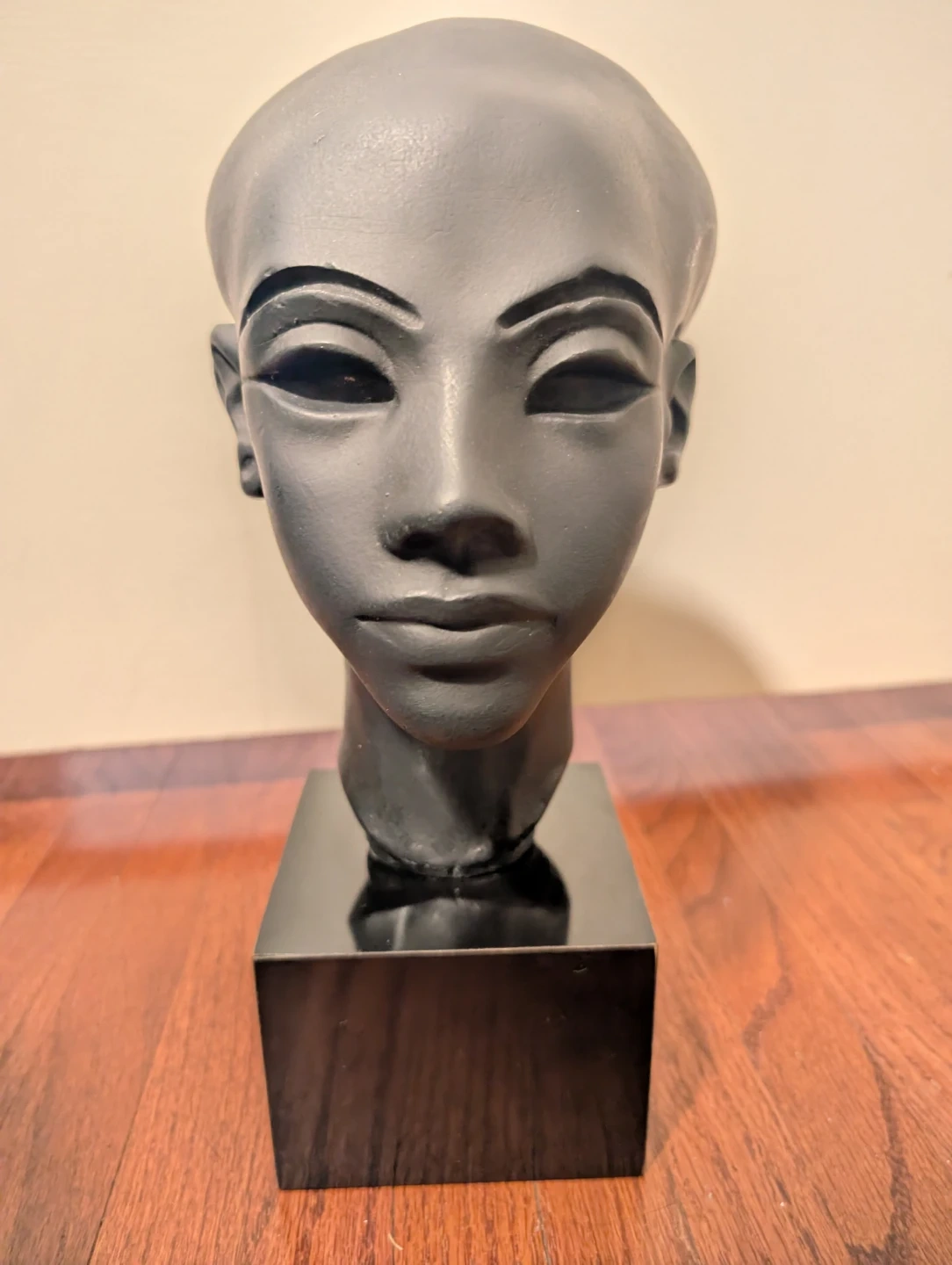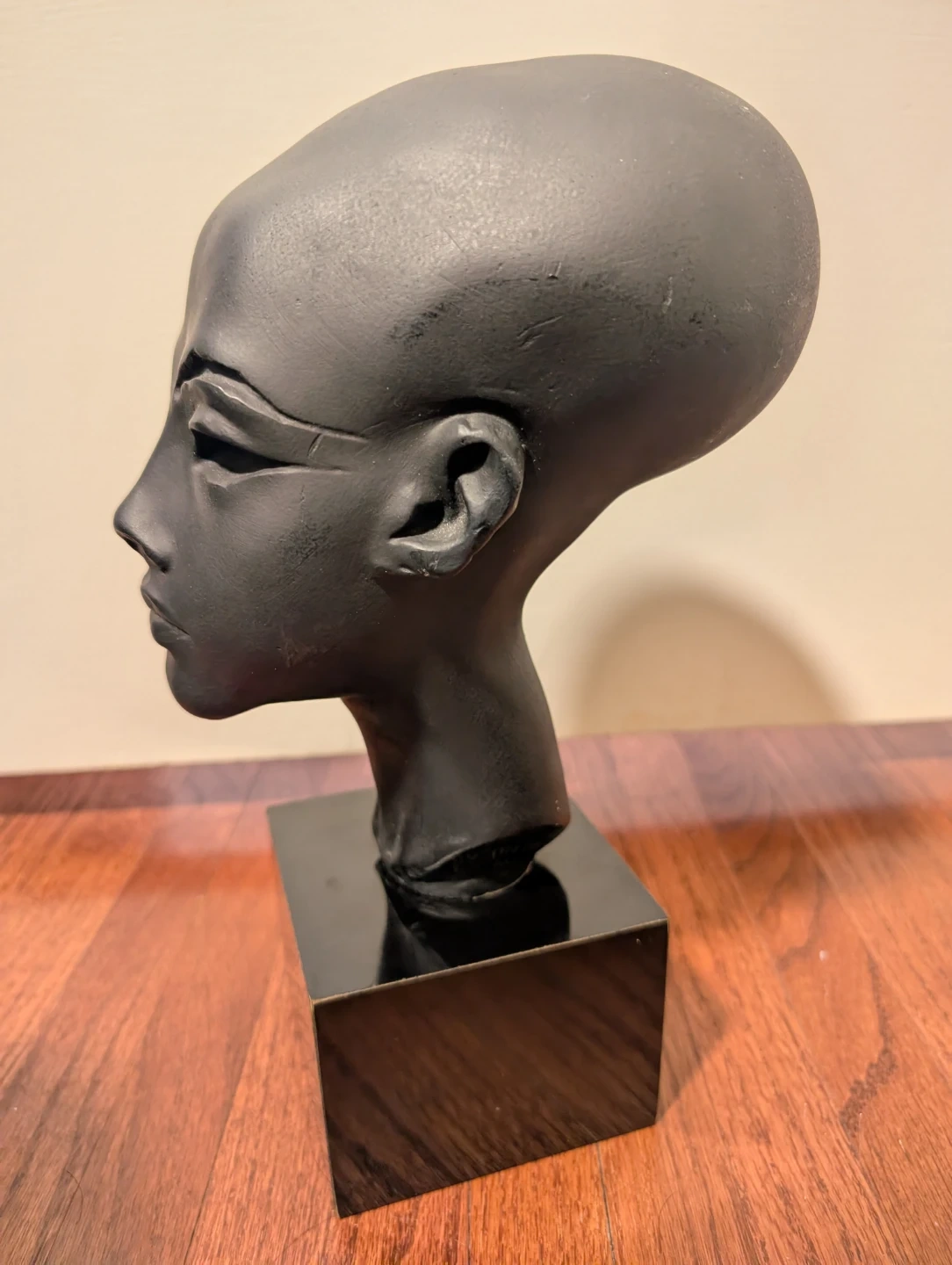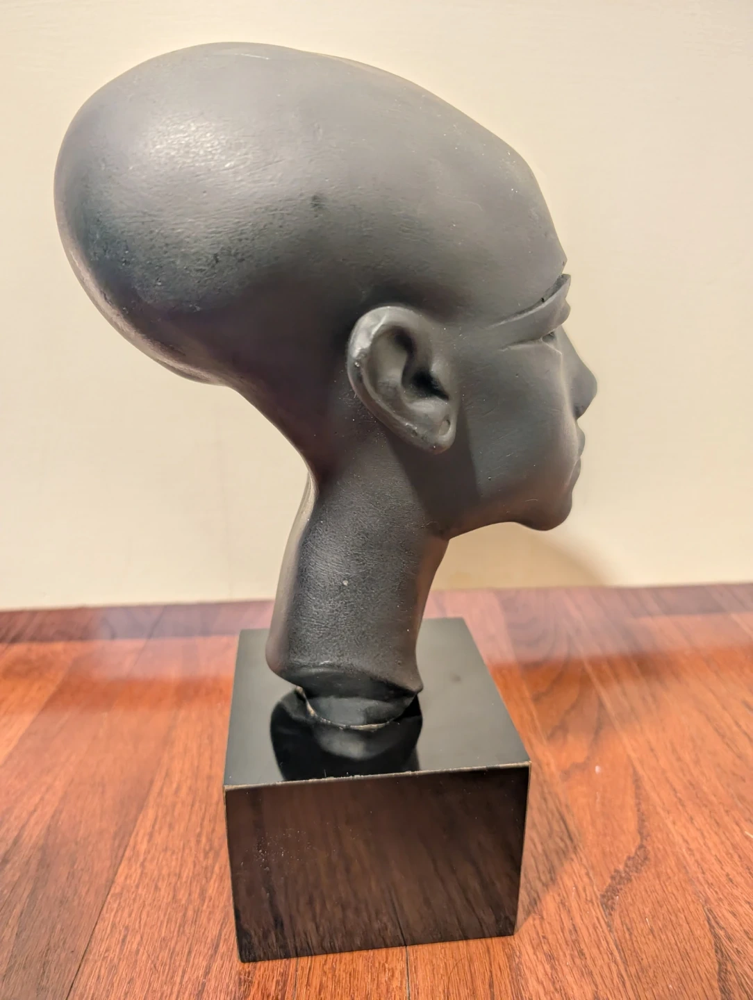 A matte black decorative bust of a head on a glossy black base. This piece adds a unique touch to any space. Its size makes it suitable for display on shelves or tables.