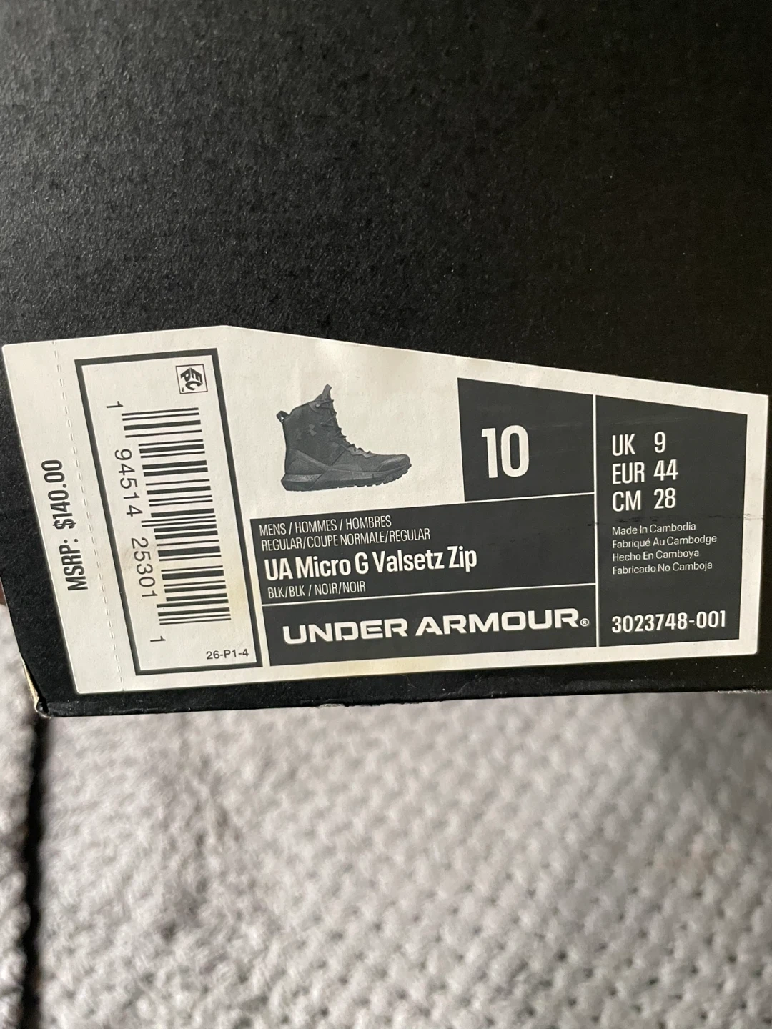 Selling a pair of Under Armour Micro G Valsetz Zip boots in men's size 10. They are black. The box is included. They were originally bought for $140
