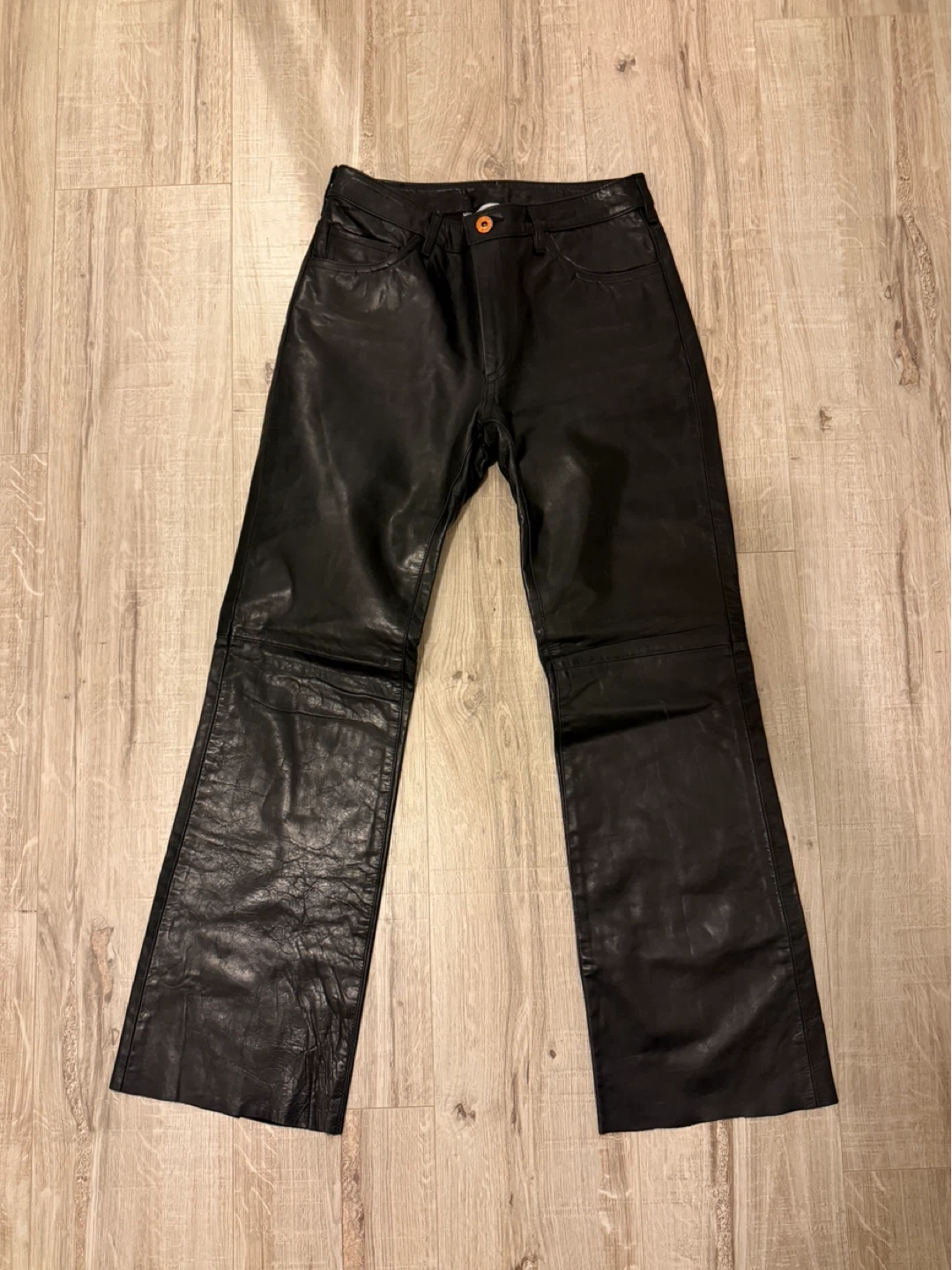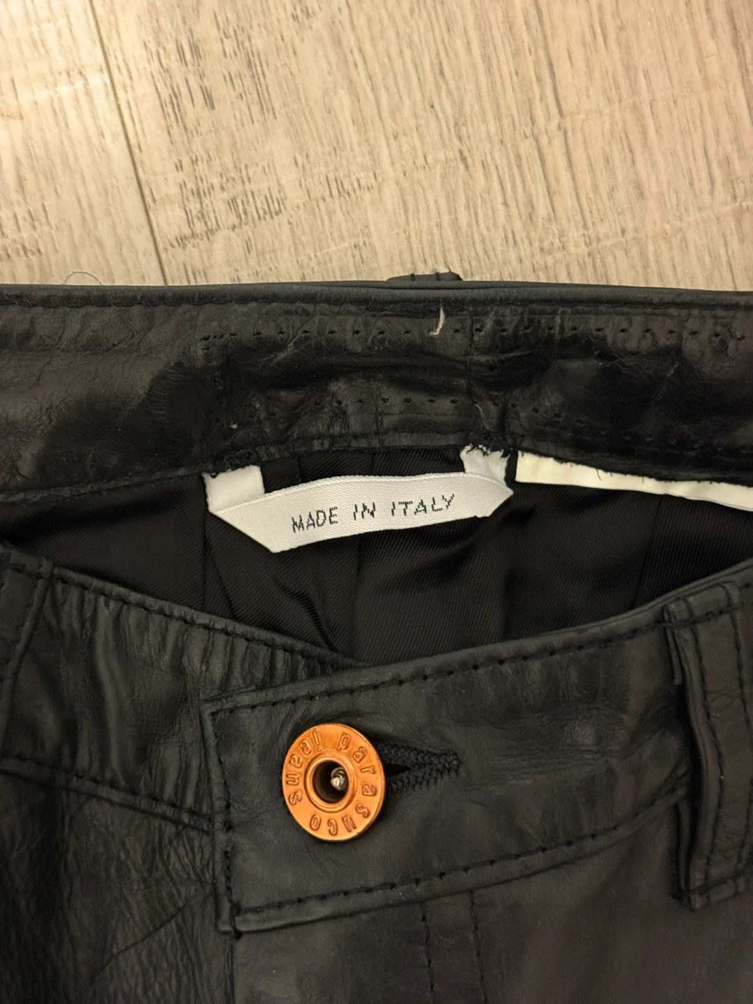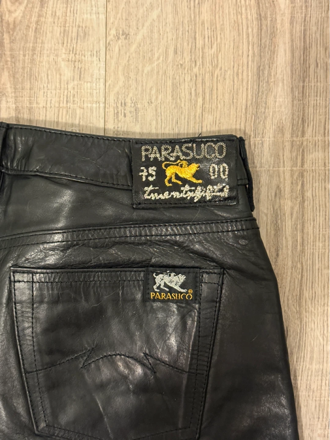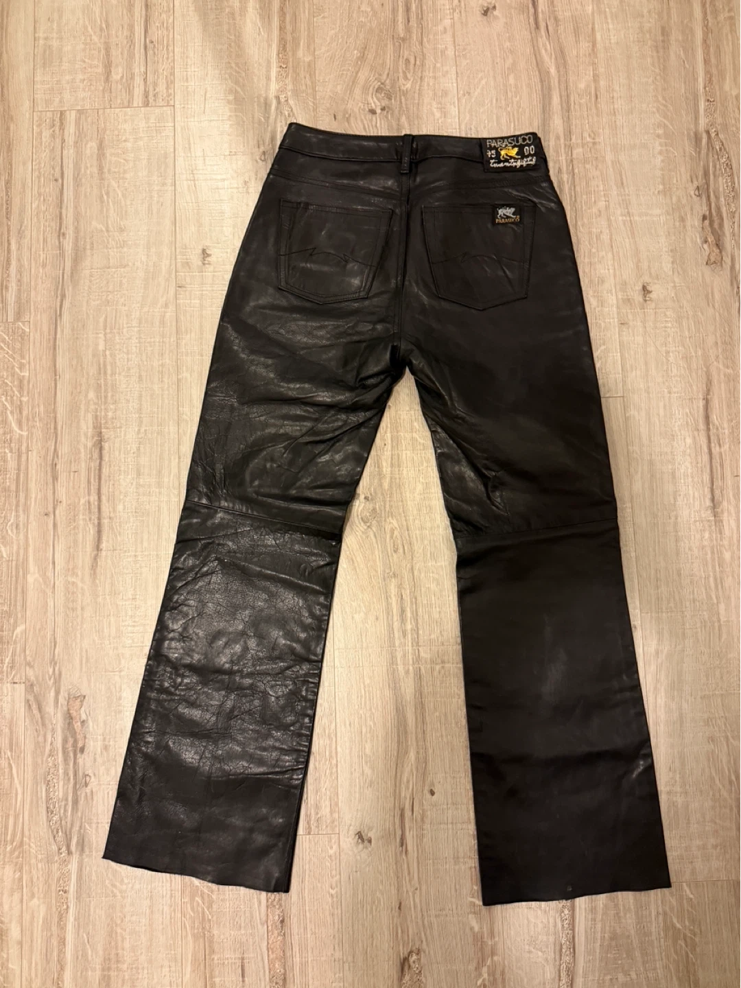 Selling a pair of PARASUCO black leather pants (genuine leather). They're made in Italy and have a unique design with the brand's logo on the back. These pants are sure to make a statement!