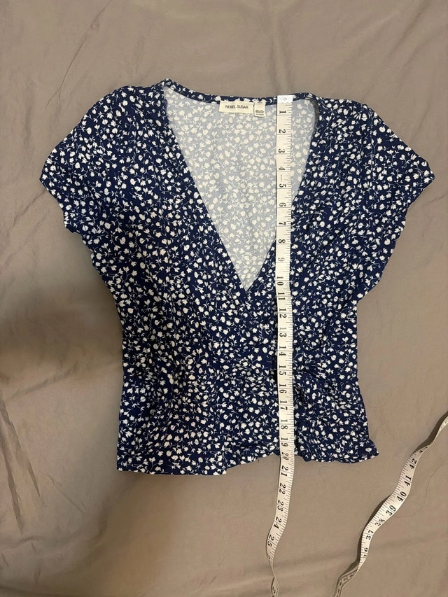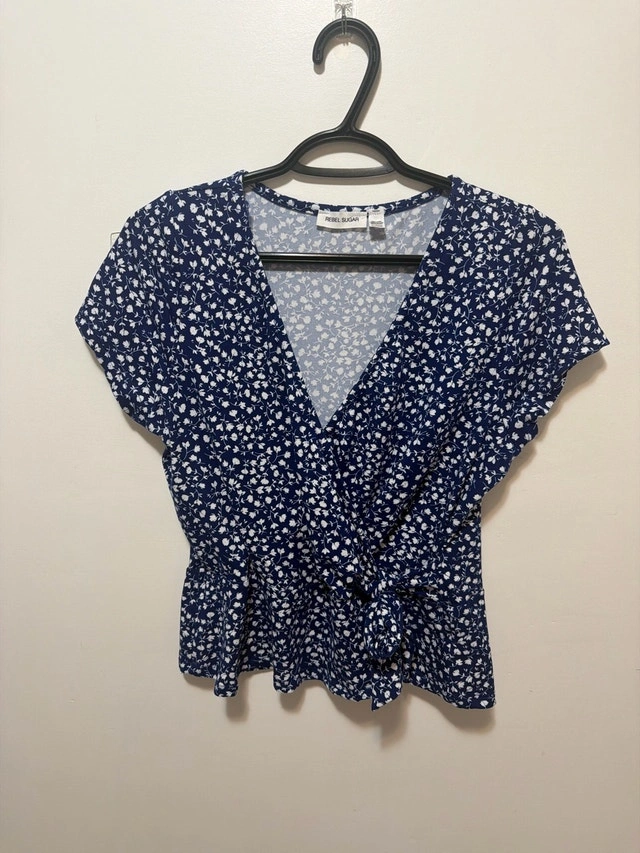This Pure Sugar ladies' top, in size medium, features a stylish blue and white floral pattern. It's designed with a flattering v-neck and a comfortable fit, perfect for casual wear. Although I've enjoyed wearing it, it remains in great condition and is ready for a new home.