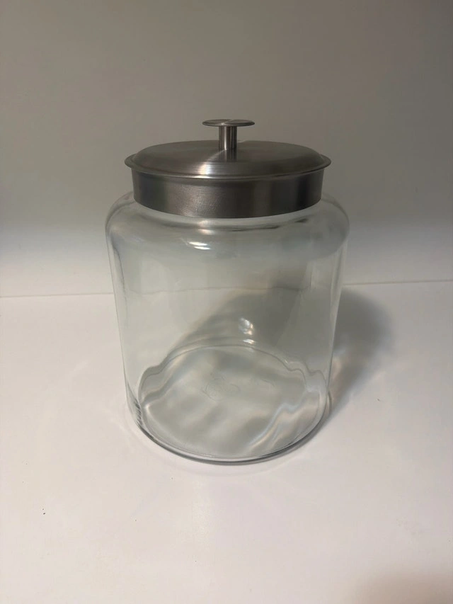 This glass jar, complete with a sleek metal lid, is ideal for stylishly storing anything from kitchen staples to knick-knacks; it is in ok condition. The rubber on lid is loose/ came off but have. If the ad is up, the item's available.