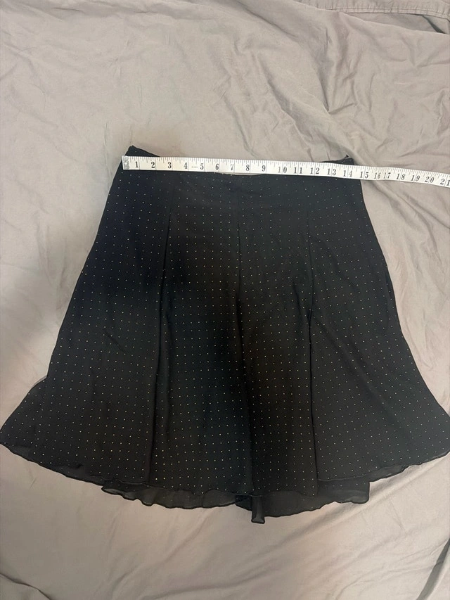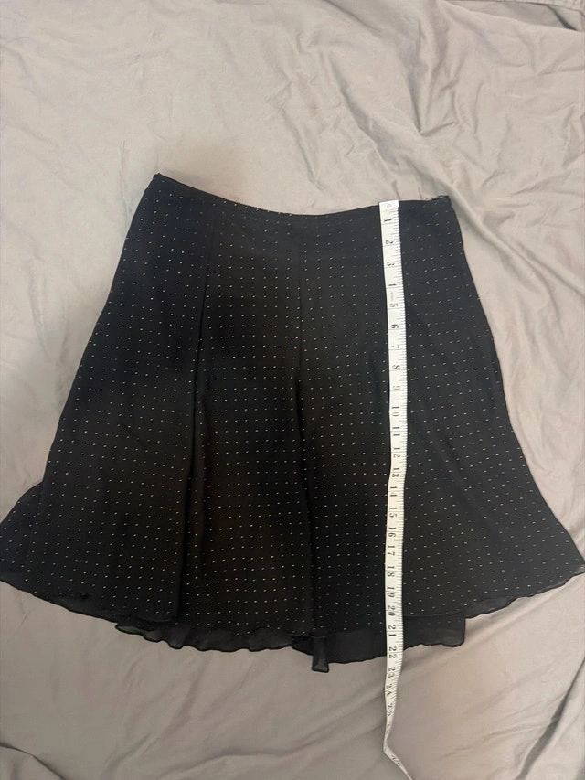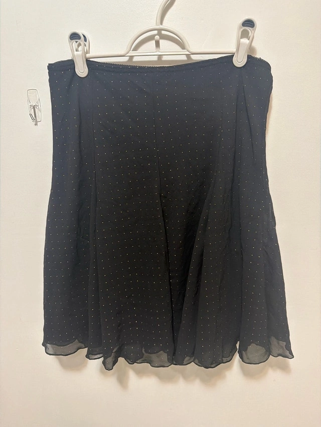 Add a touch of shimmer to your wardrobe with this gently worn Vamp skirt, featuring a stylish black fabric adorned with delicate gold dots. The skirt is a versatile piece that falls gracefully, making it perfect for dressing up or down.