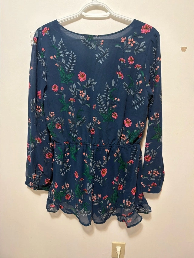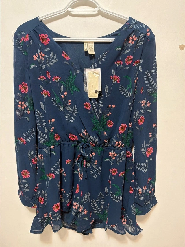 This Jopna romper is new with tags and features a beautiful floral pattern on a navy blue background. It's a size large with long sleeves and a cinched waist, perfect for a stylish and comfortable fit.