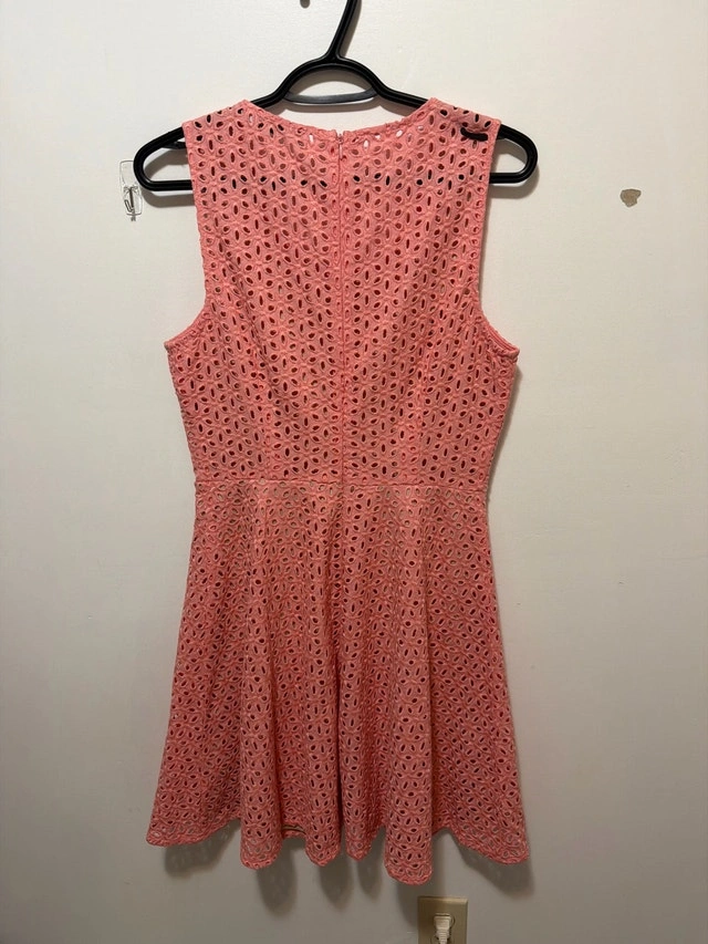 This is a JustFab Dress featuring a lovely eyelet design in a coral colour, size medium. Never worn but already fraying! There is a small imperfection in the fabric near the bottom hem. Please see the last photo for details. This dress is perfect for warmer weather!