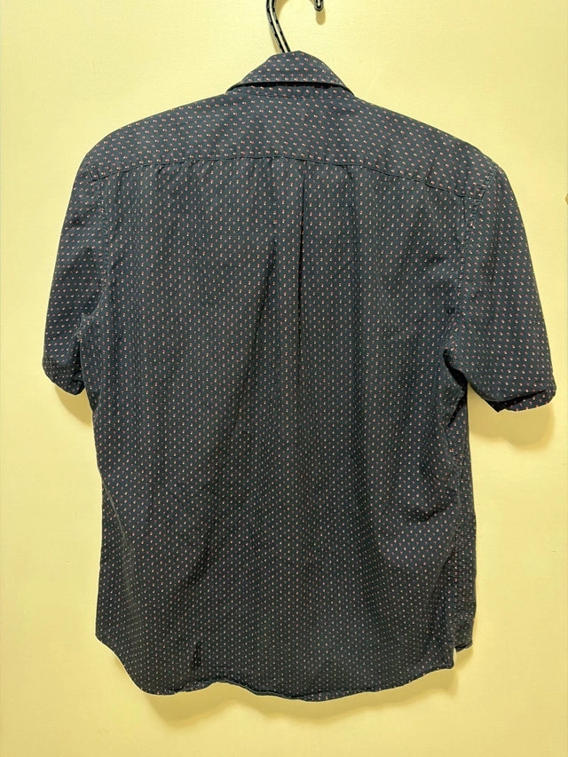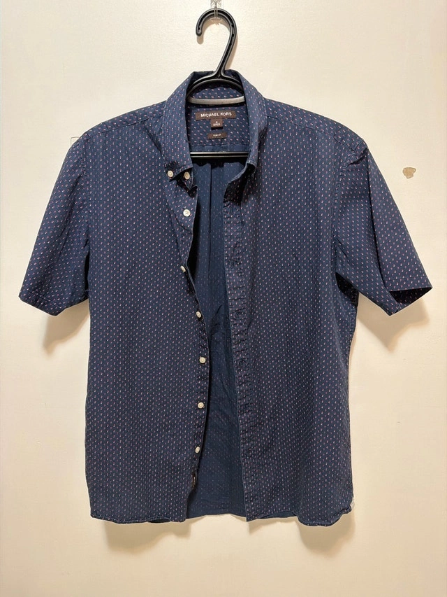 Add a touch of sophistication to your wardrobe with this Michael Kors short sleeve button-up shirt in men's size medium. The shirt features a stylish pattern on a comfortable, slim-fit design. It's in ok condition and ready for its next adventure. Specifications: