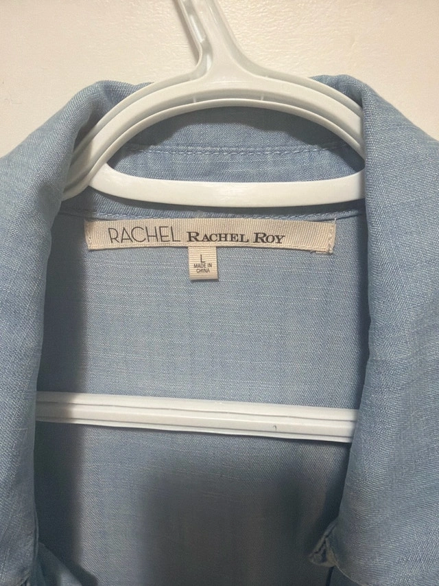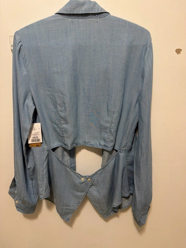 Add a stylish touch to your wardrobe with this Rachel Roy denim shirt. The shirt is in new never worn condition. It features a unique open-back design and classic button-down style. It's a versatile piece that can be dressed up or down for various occasions.