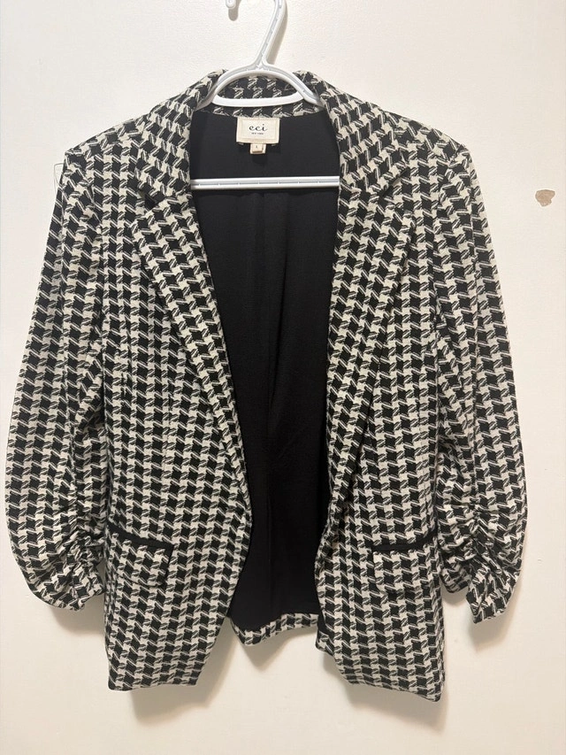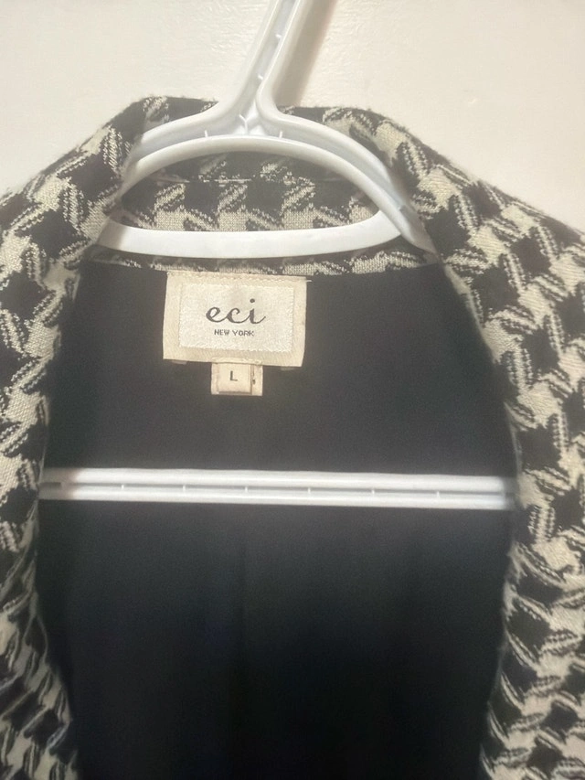 Add a chic touch to your wardrobe with this ECI houndstooth blazer, size large, featuring a classic black and white pattern and a comfortable fit. This blazer has been previously worn but remains in good condition, ready to elevate your style. Perfect for both professional and casual settings.