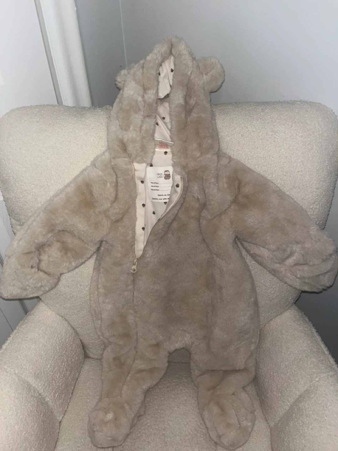 Super cute and cozy beige bear onesie from F&F! It's in new condition without the tags and perfect for keeping your little one warm and snuggly