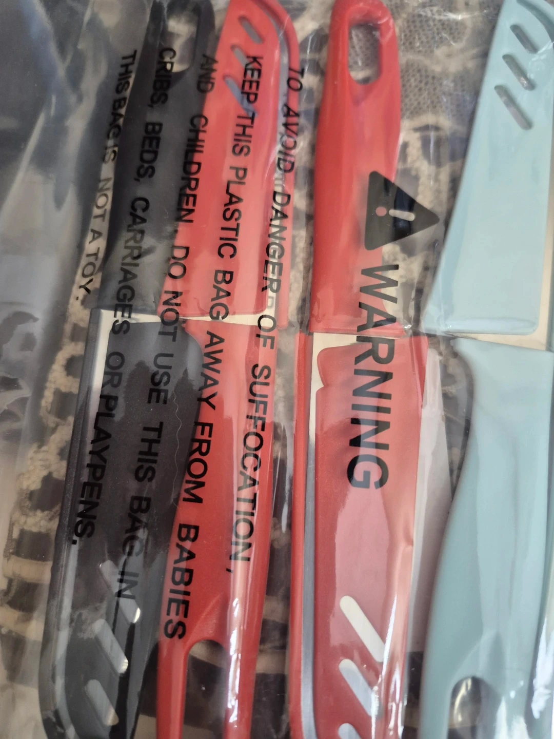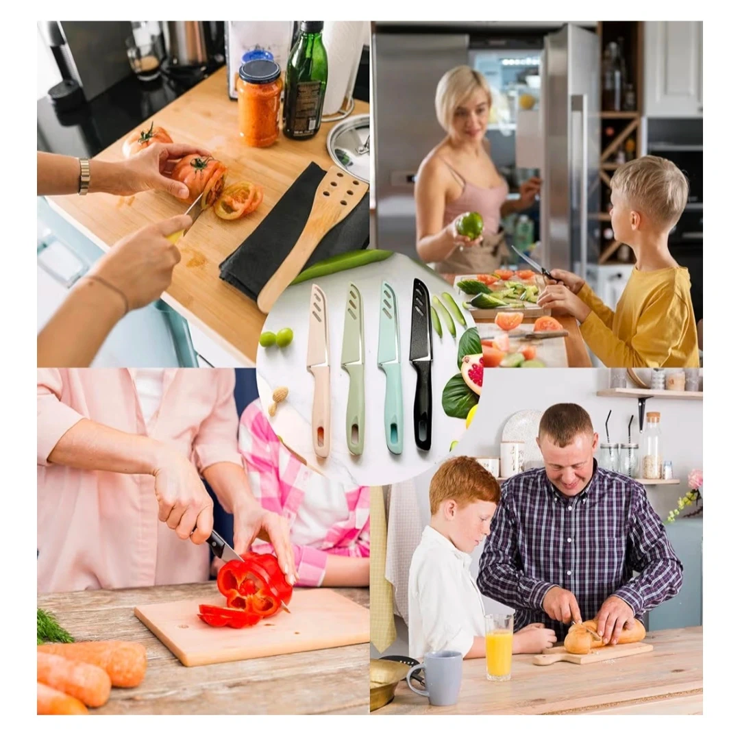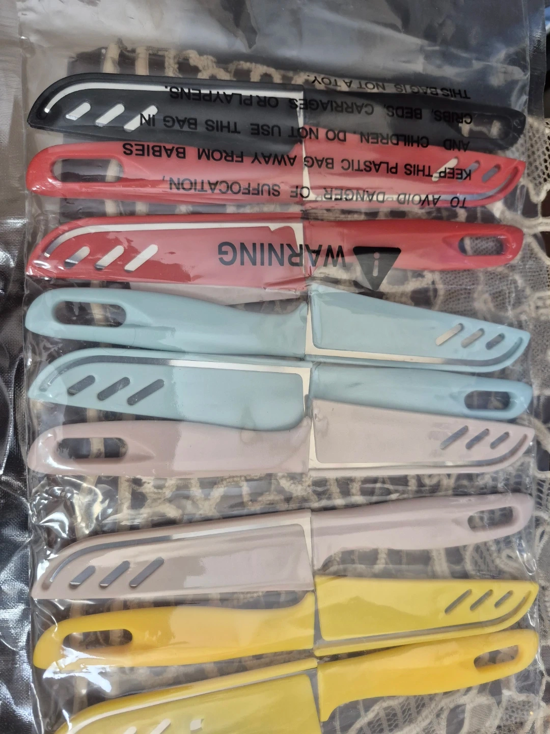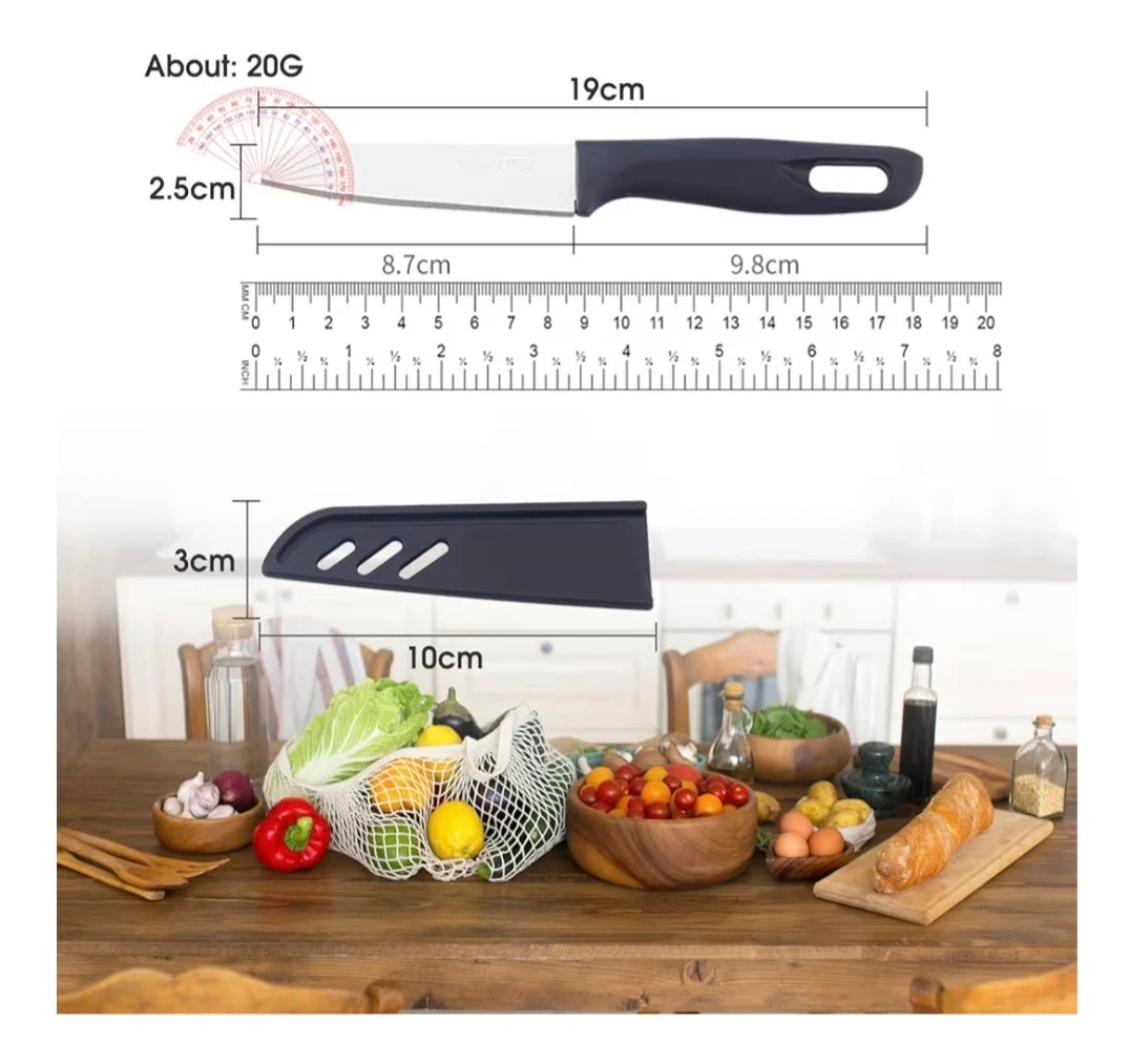 This is a set of 9 kitchen knives and 9 PCS Knife Sheath designed to meet your multi-functional cutting needs! The knives come in various colours. Each knife is approximately 19cm long with a blade length of 8.7cm