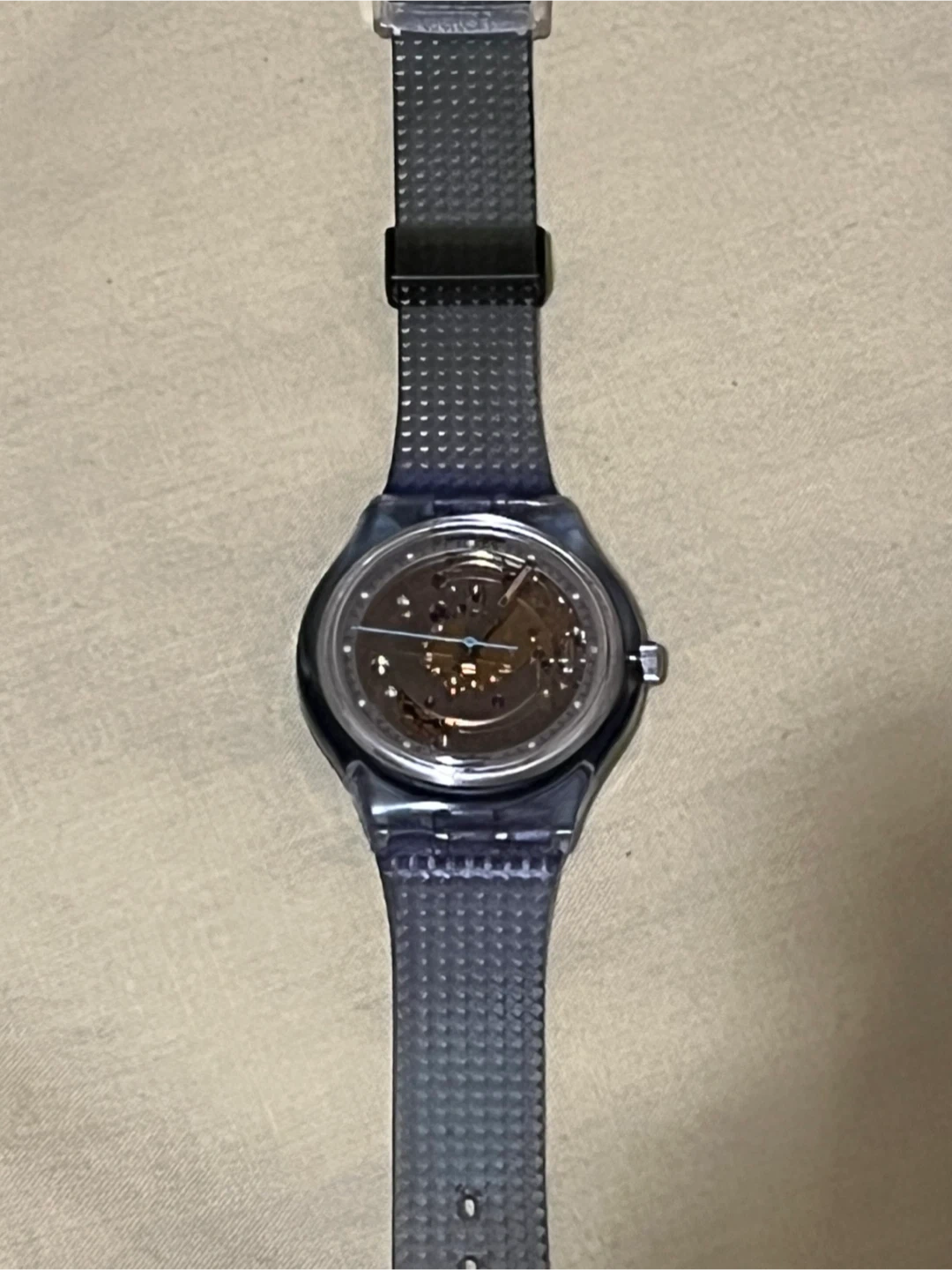 Selling a Swatch Automatic watch in good condition! It has a unique transparent design that shows the inner workings of the watch. The band is a textured plastic material.
