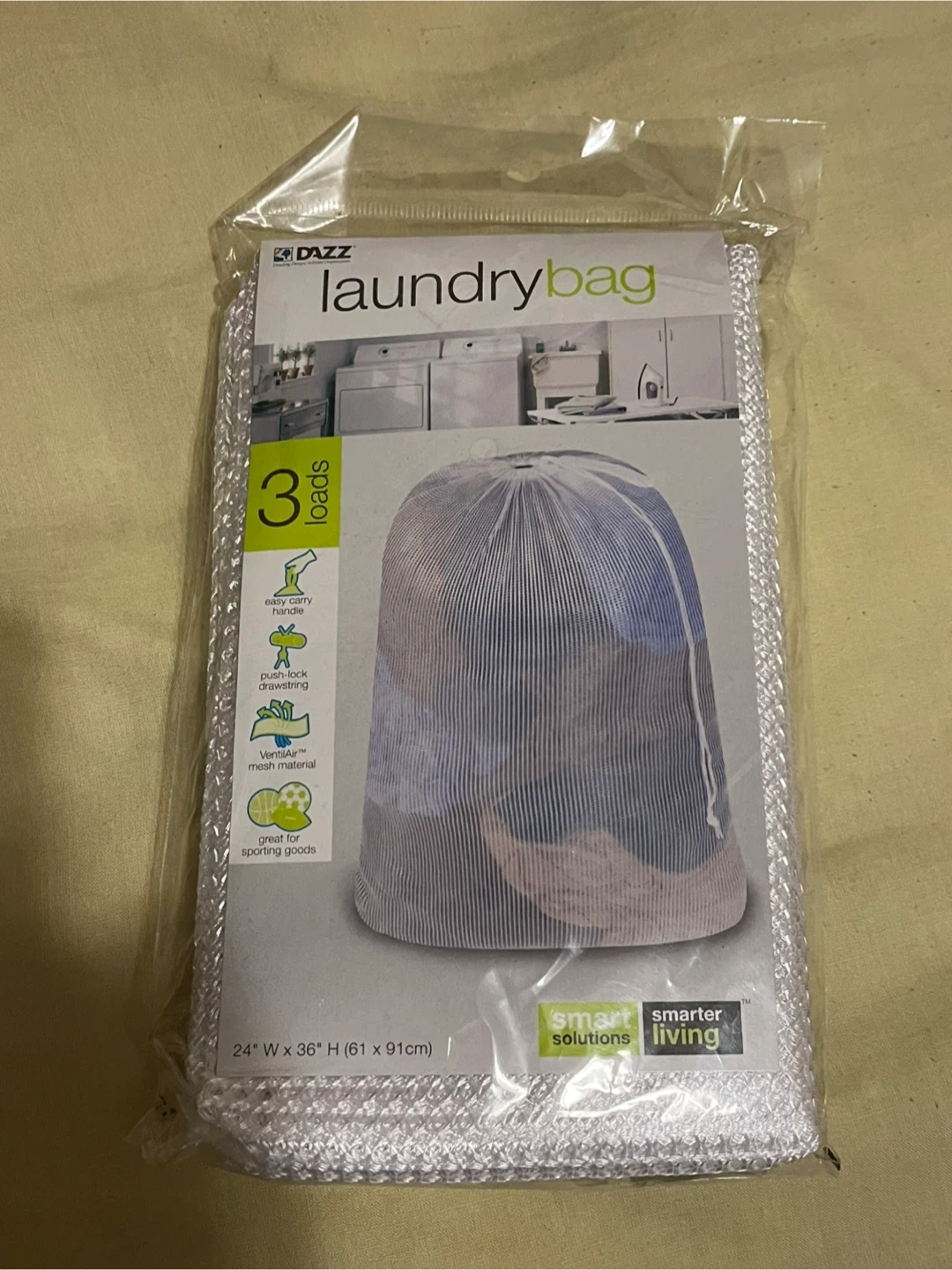 I'm selling a DAZZ laundry bag, brand new in packaging! It can hold up to 3 loads of laundry. The bag features an easy carry handle and a push-lock drawstring. Made with VentilAir mesh material, it's great for sporting goods too! Dimensions are 24" W x 36" H (61 x 91cm)