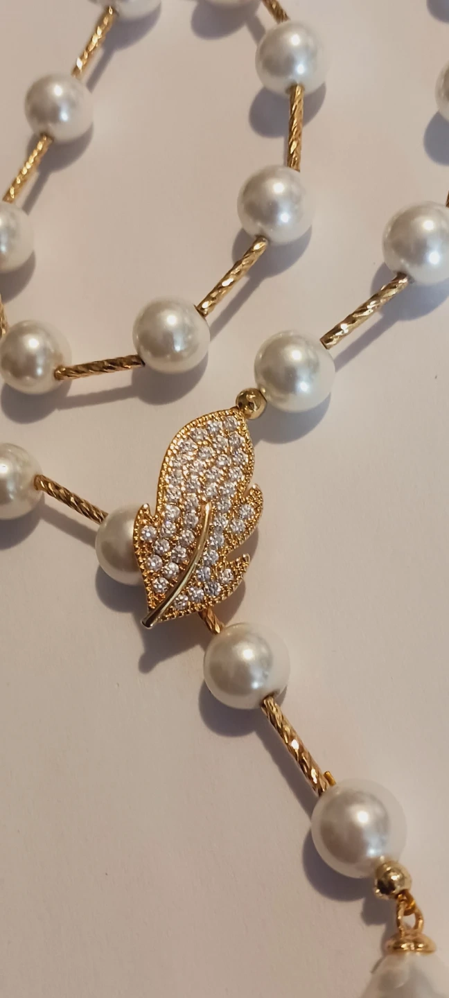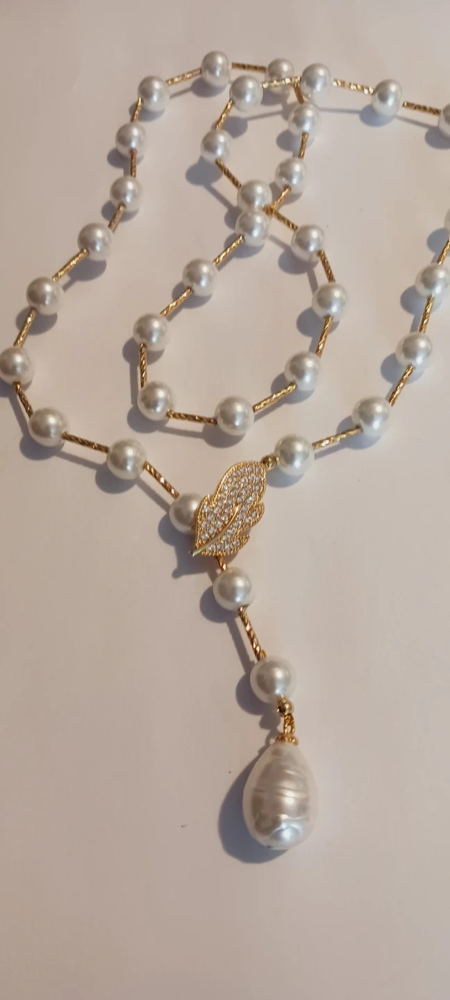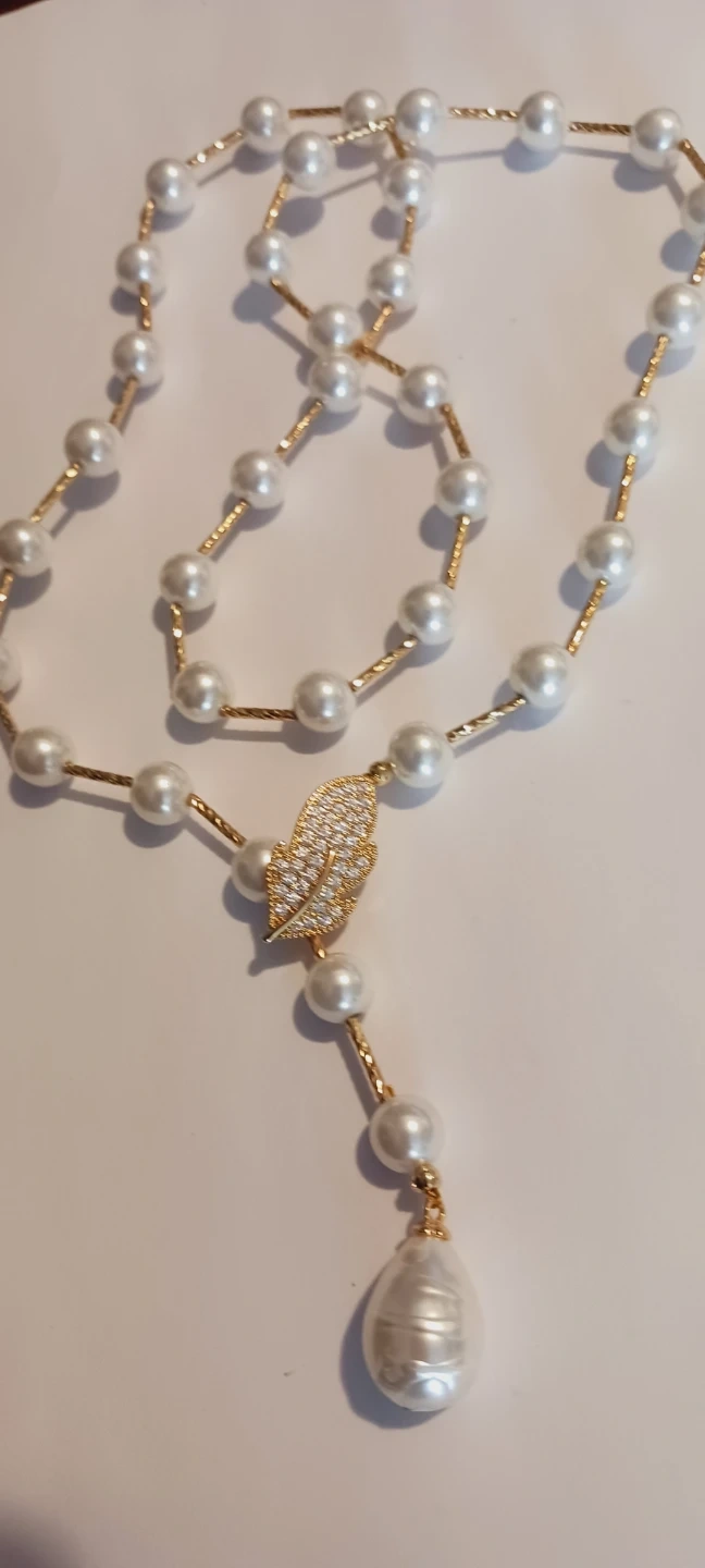 New !! This is a beautiful pearl necklace with a gold leaf pendant. The pearls are a classic white color, and the gold leaf adds a touch of elegance. New !! 22" long. ALL MY PRICES ARE NEGOTIABLE !!