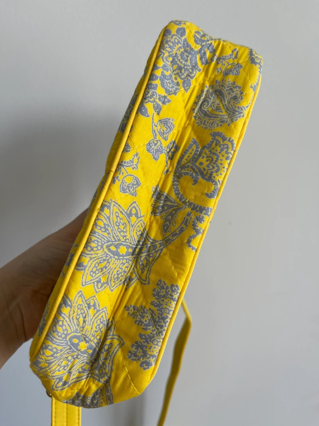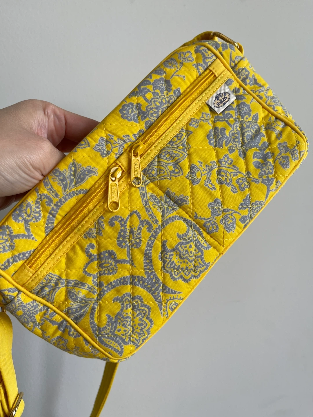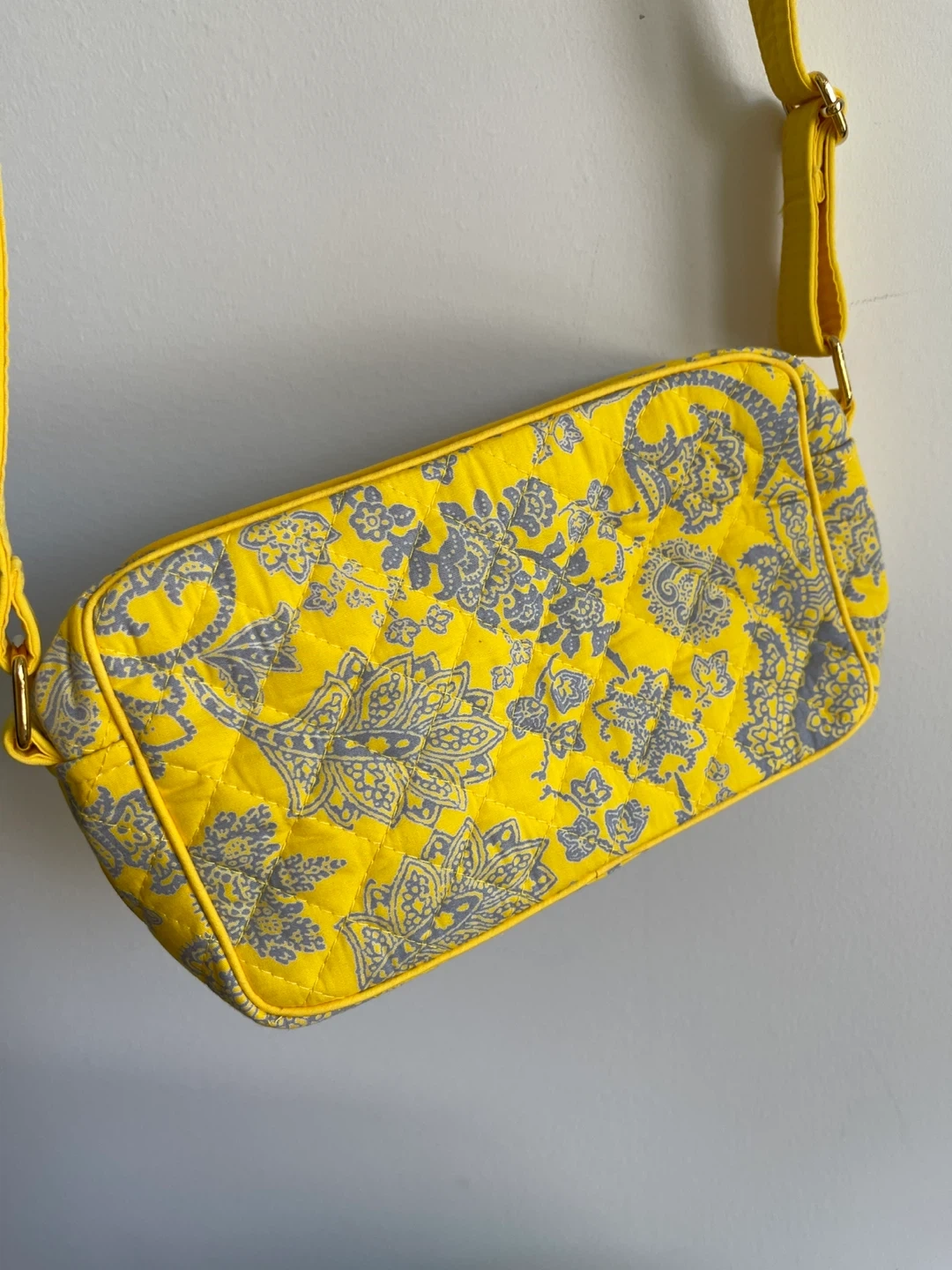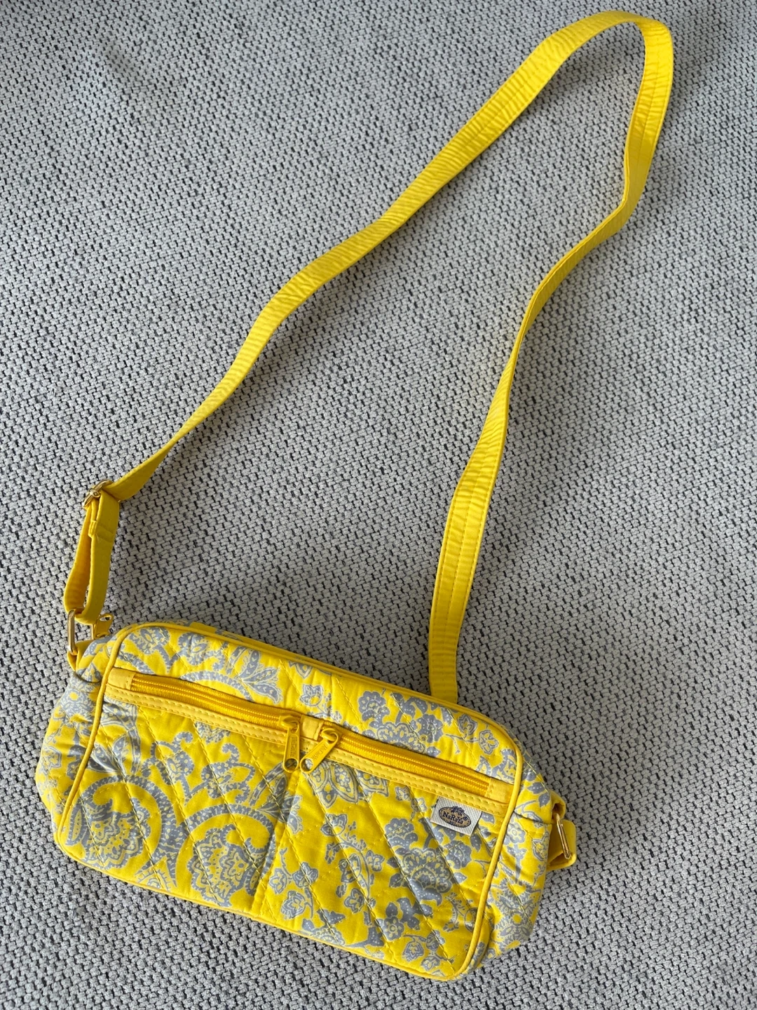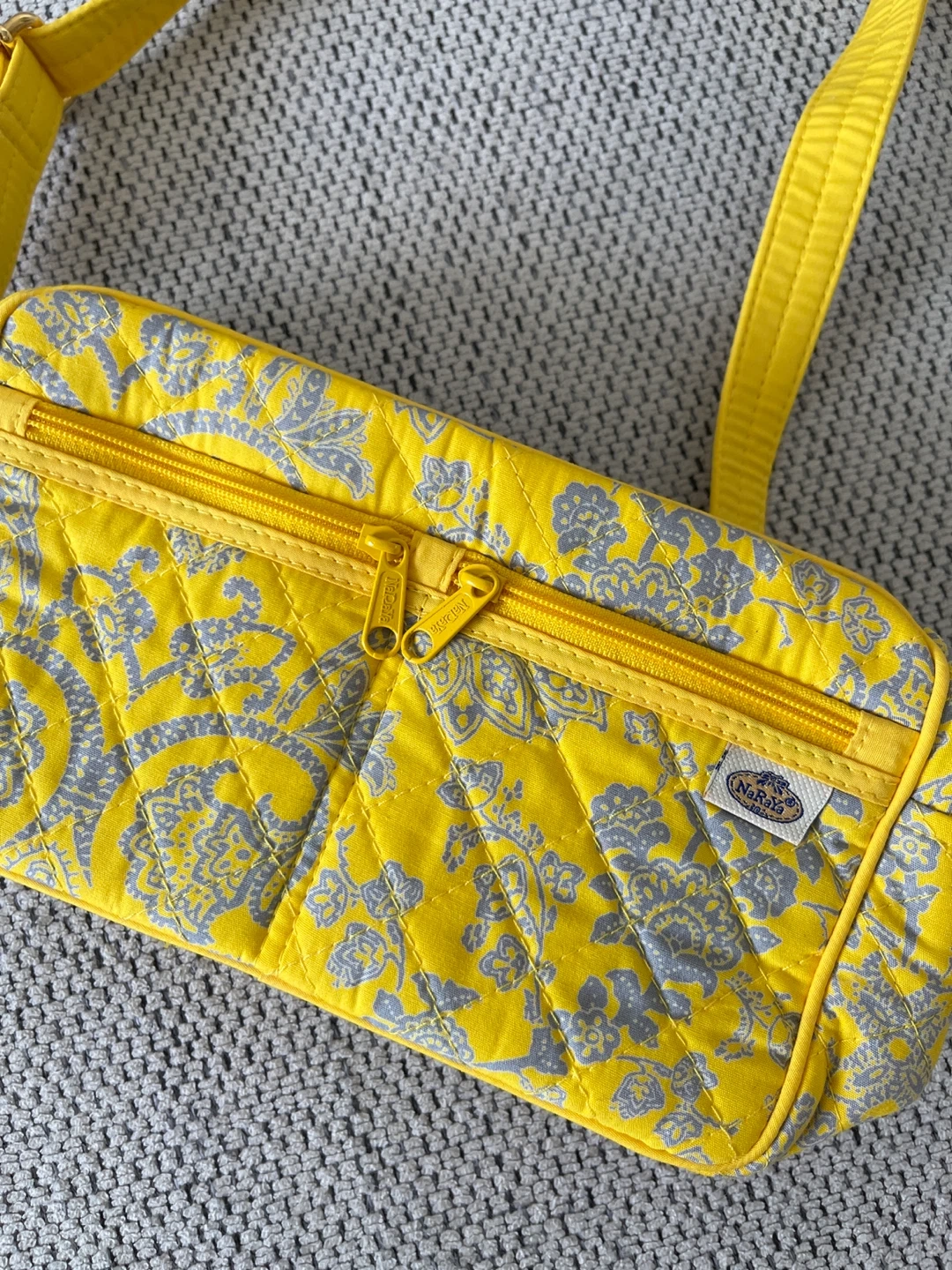 This is a cute quilted crossbody bag by NaRaYa! It's a vibrant yellow with a grey floral pattern. Perfect for carrying your essentials while adding a pop of colour to your outfit