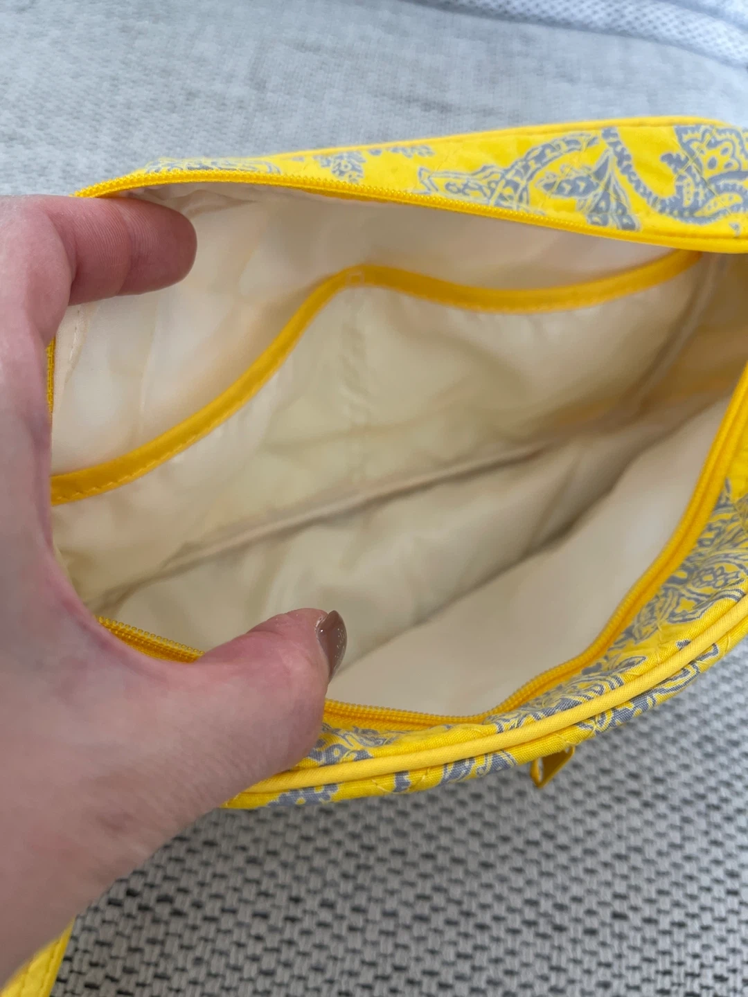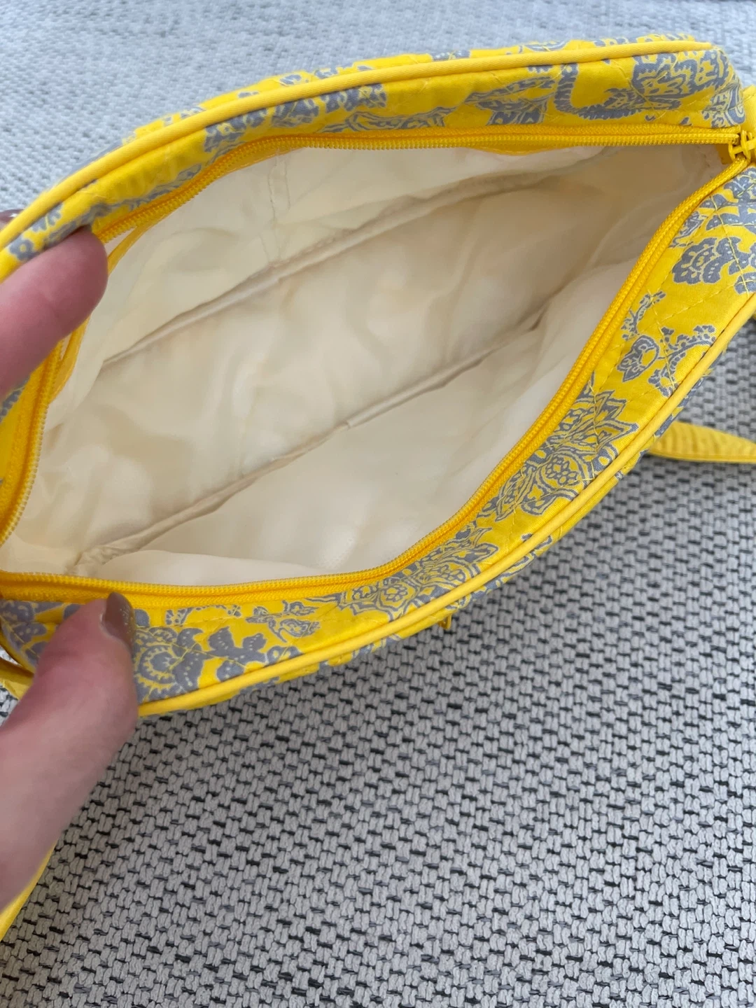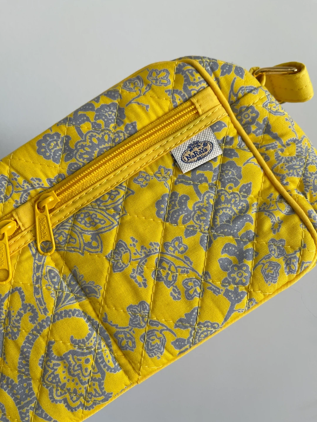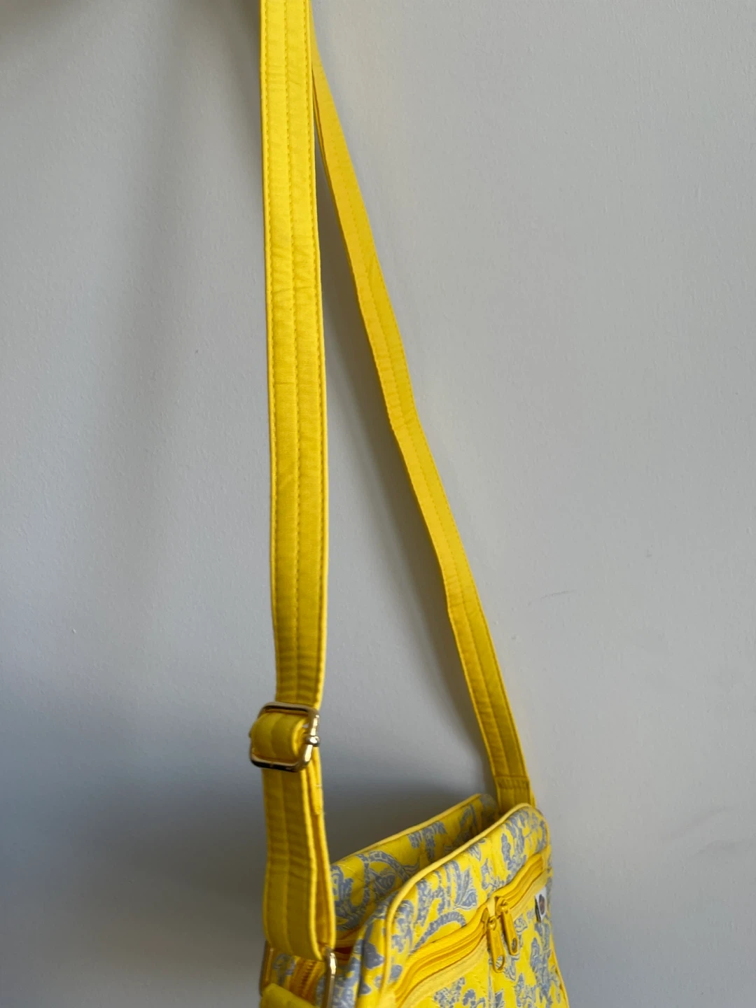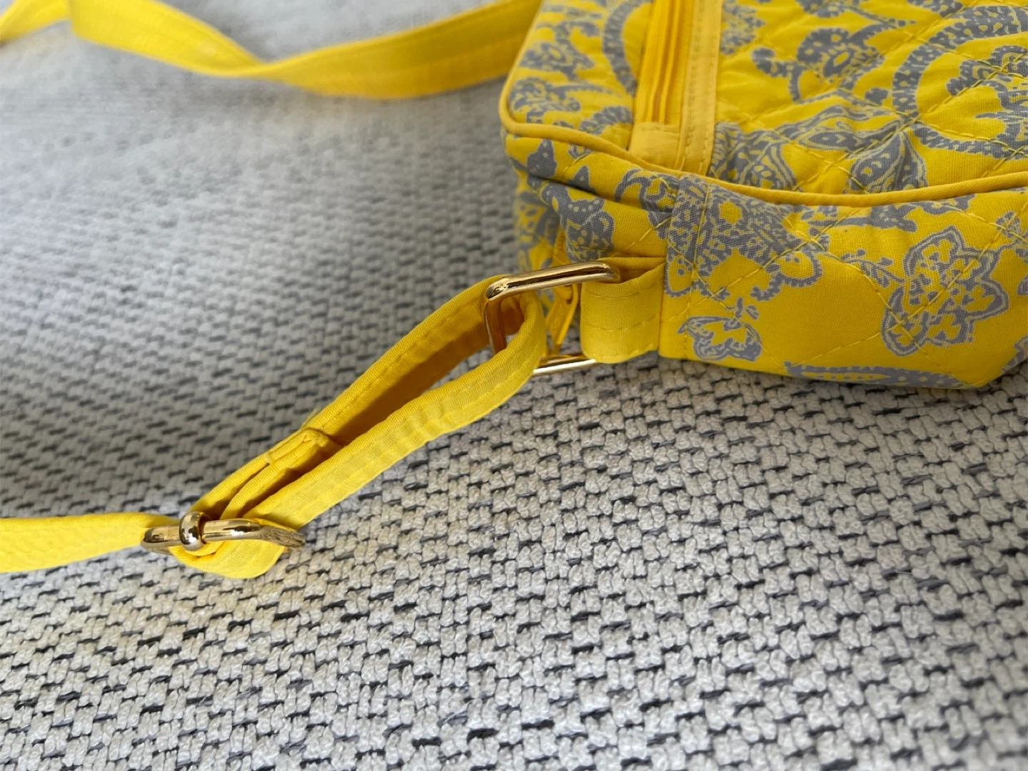 This is a cute quilted crossbody bag by NaRaYa! It's a vibrant yellow with a grey floral pattern. Perfect for carrying your essentials while adding a pop of colour to your outfit