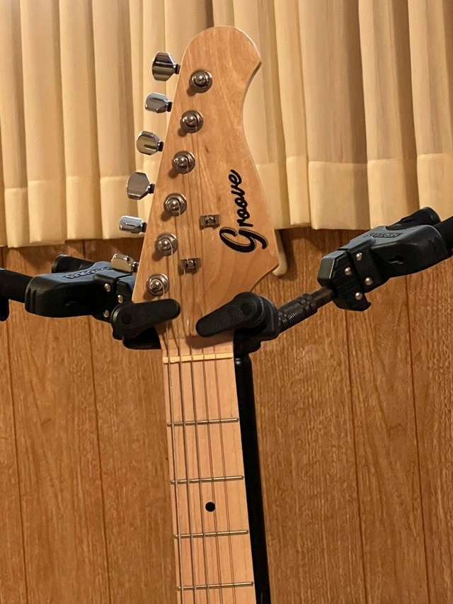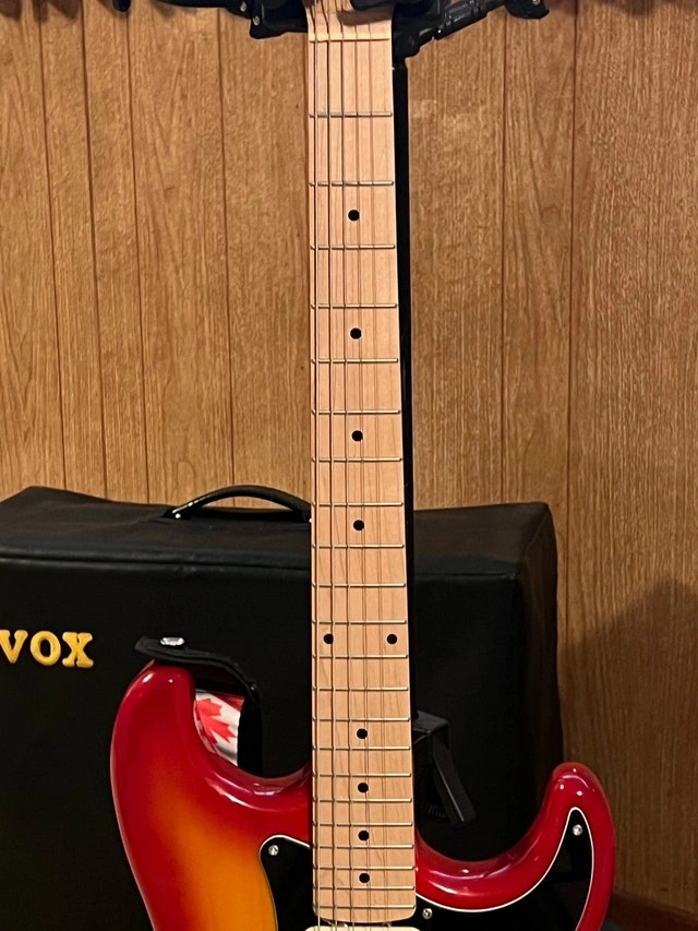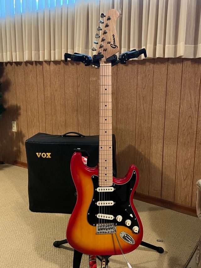 GROOVE STRATOCASTER SIERRA SUNBURST EXCEPTIONAL No blemishes. Groove electric guitar in a sunburst finish. It has a maple neck and fretboard. The body appears to be alder wood with a gloss finish. It is a double cut-away design with three single-coil pickups. The guitar has a six-point synchronized tremolo system. Comes with strap, 5 picks, and whammy bar. Try it before you buy it.