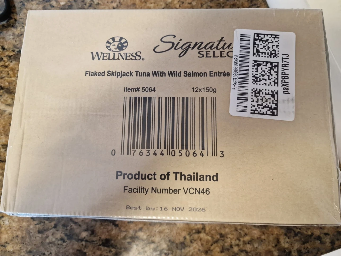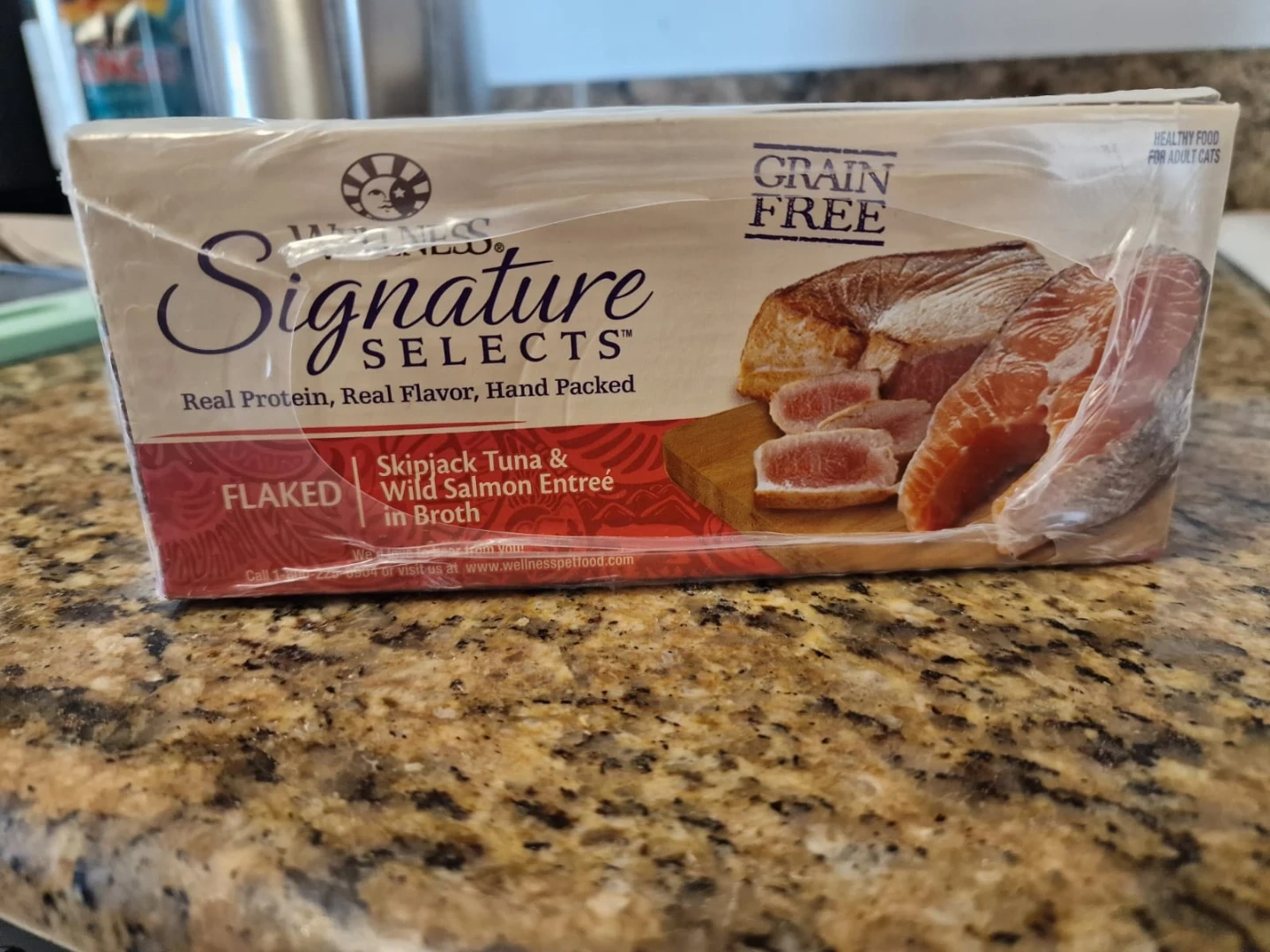 Giving away a box of Wellness Signature Selects Flaked Skipjack Tuna With Wild Salmon Entrée cat food. It's a grain-free, healthy food option for adult cats. Best by 2026 November 16