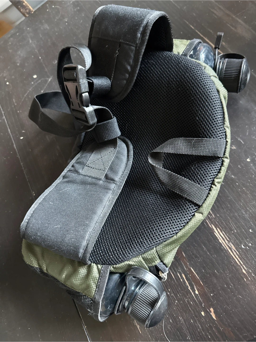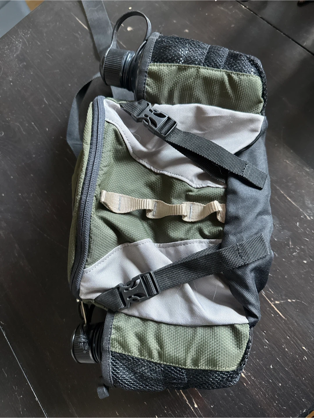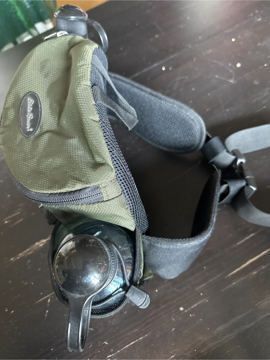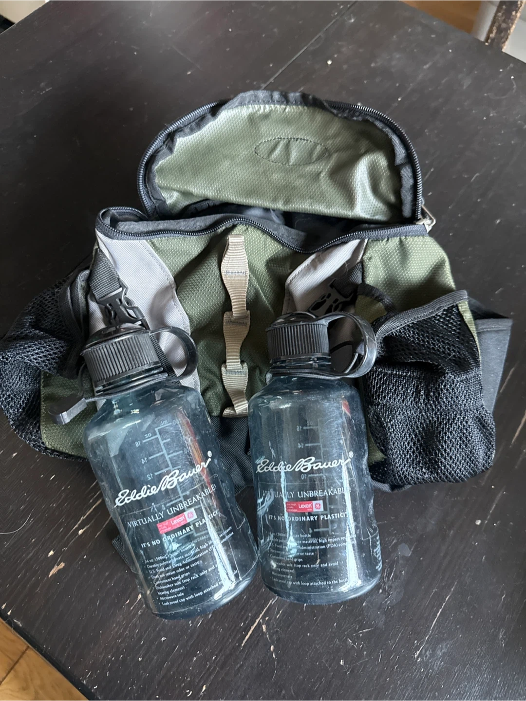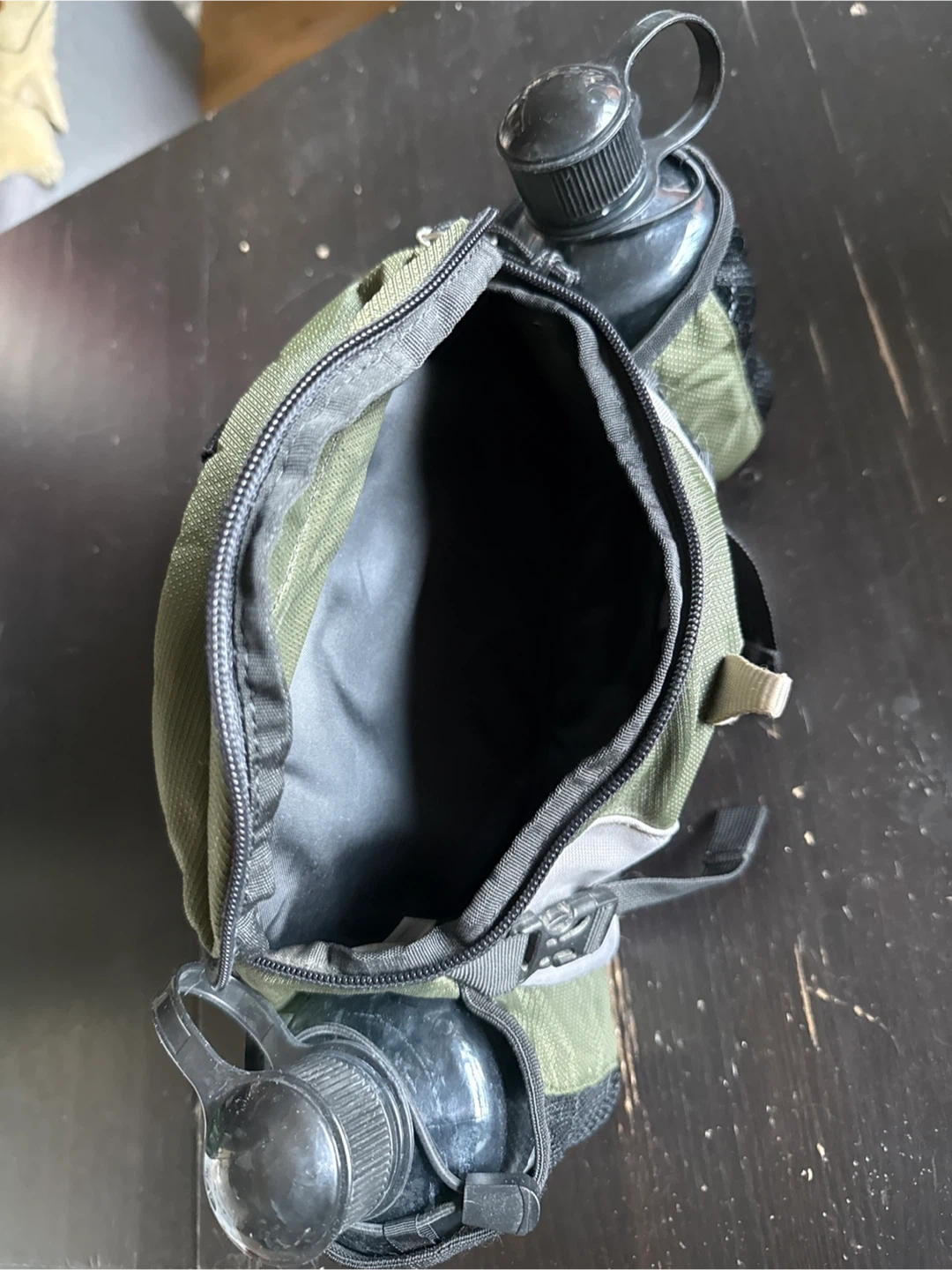 Eddie Bauer dark green 2 water bottles carrier (funny pack ?) in great condition! It's a convenient way to carry your water bottles and most important essentials while hiking or walking. The carrier is made of durable material and has an adjustable strap for a comfortable fit