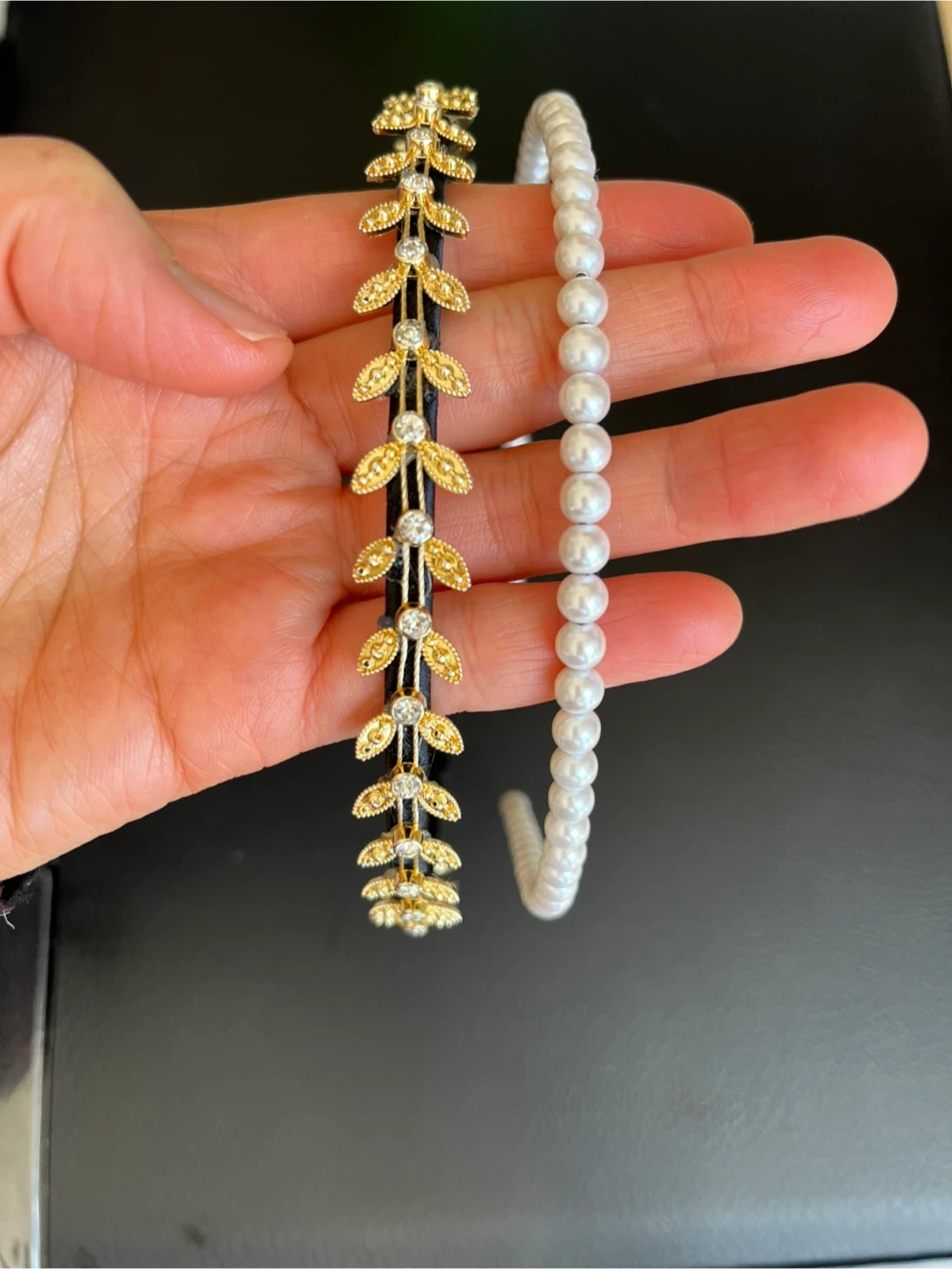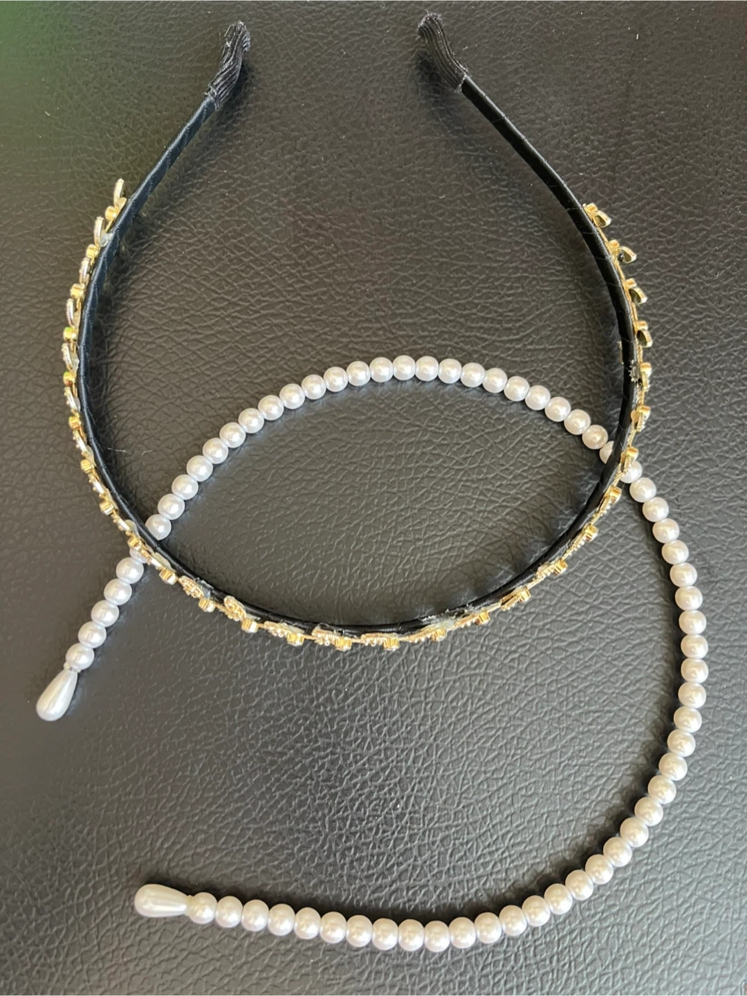 Two lovely headbands for sale! One features delicate gold leaves and the other is a classic pearl design. Perfect for adding a touch of elegance to any outfit.