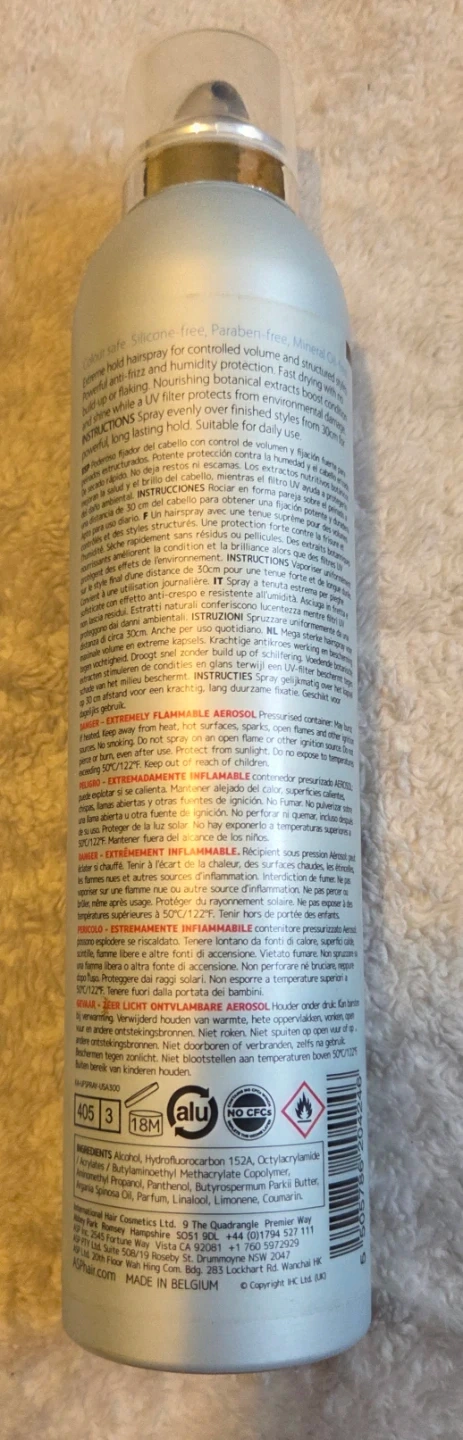 Selling a can of A.S.P Kitoko ARTE Ultimate Finish Hairspray. It's designed for extreme control and UV protection. This hairspray contains Karité, Argan, and Panthenol. It's an anti-humidity, extra strong fixing spray. The can contains 300ml/10.2fl.oz