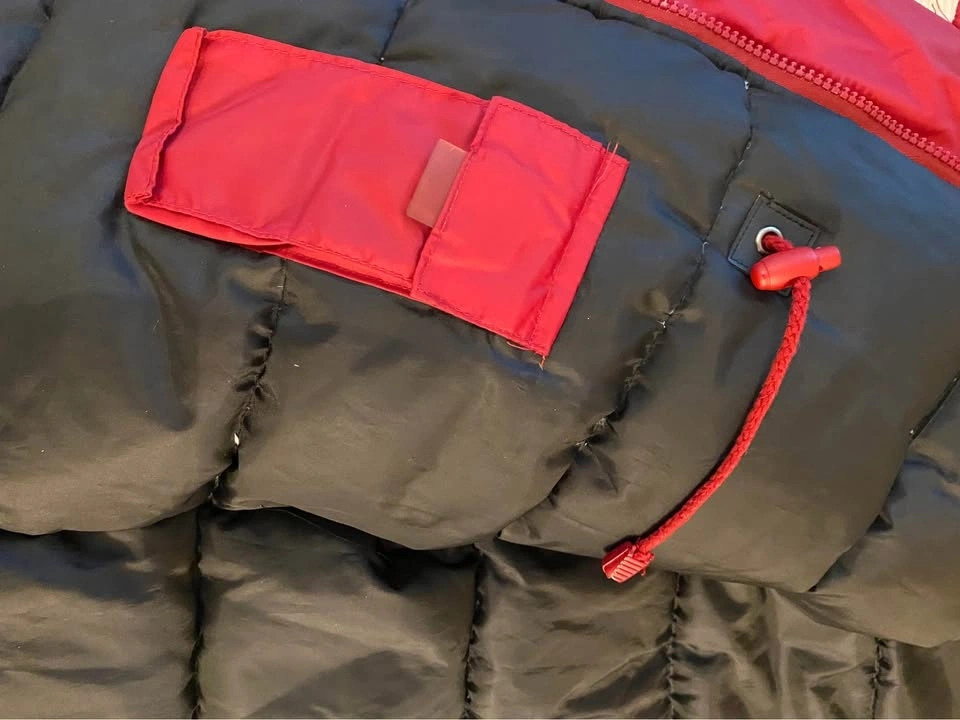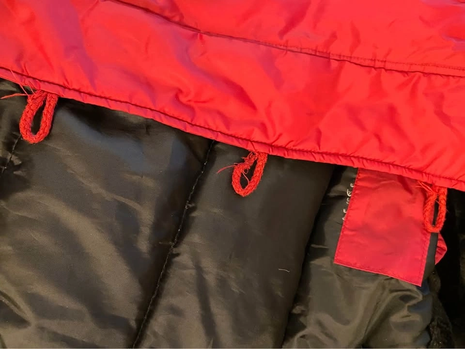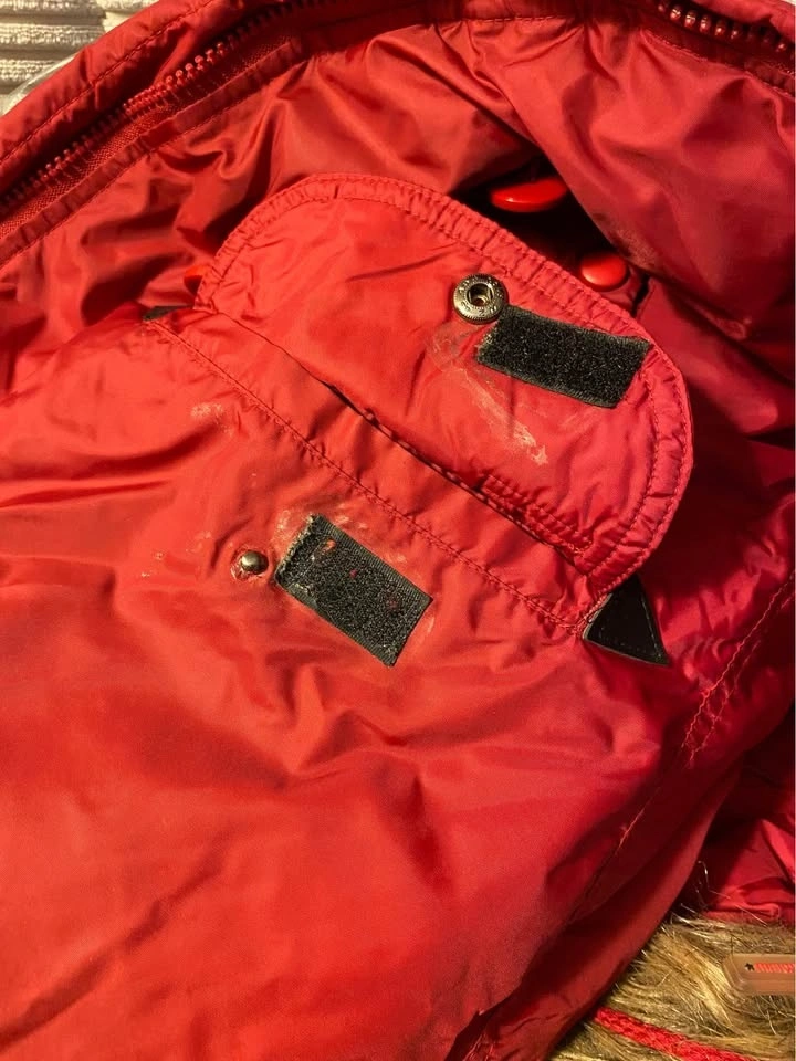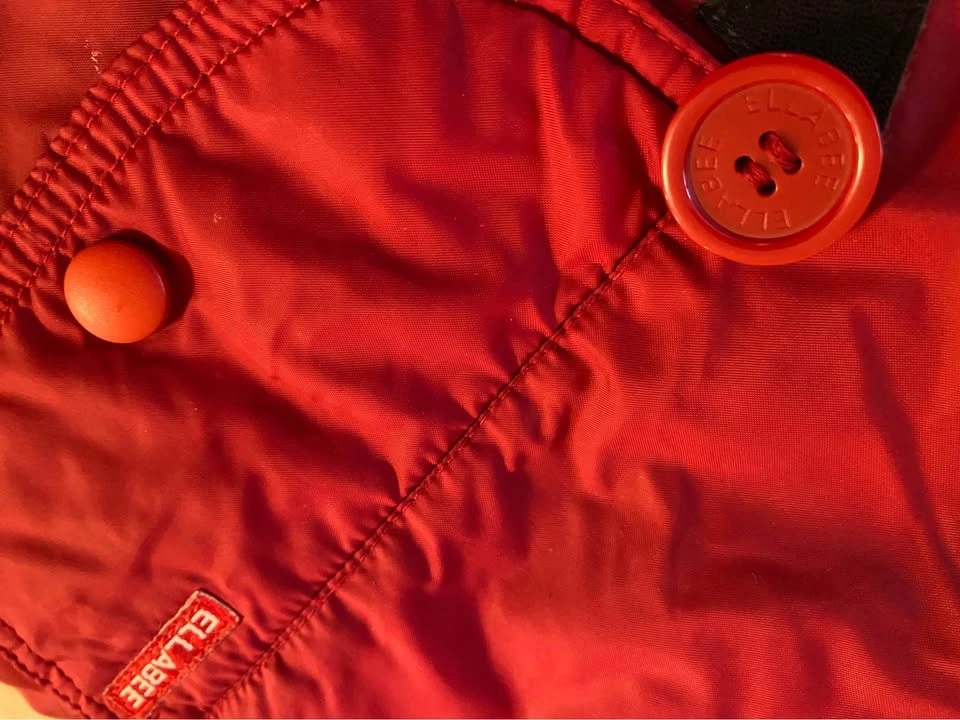 Ellabee tag removed (Mom doesn’t like them) and she had tinkered with left pocket as one of the snap buttons might have been falling off so a Velcro was added. Looks like some glue residue marks in the underside of the pocket flap. Coat is in fair condition and is still most functional otherwise!