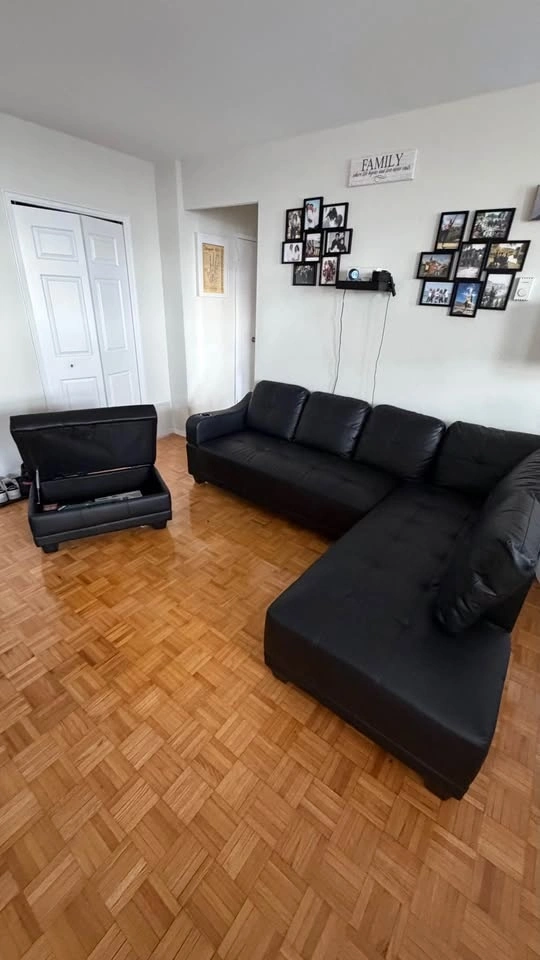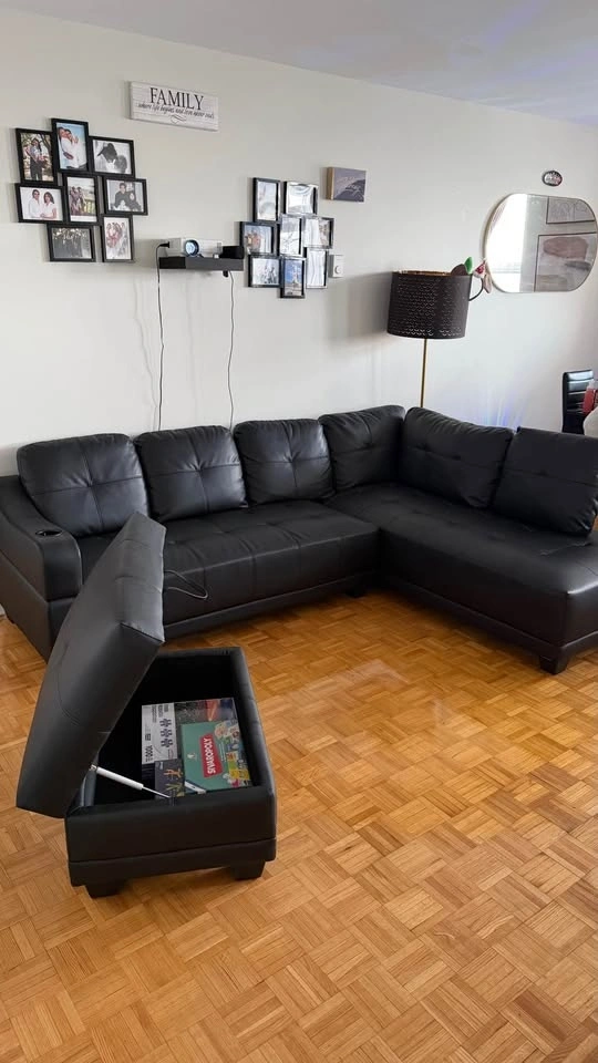Features: L-shape, built-in cup holders, includes storage ottoman.