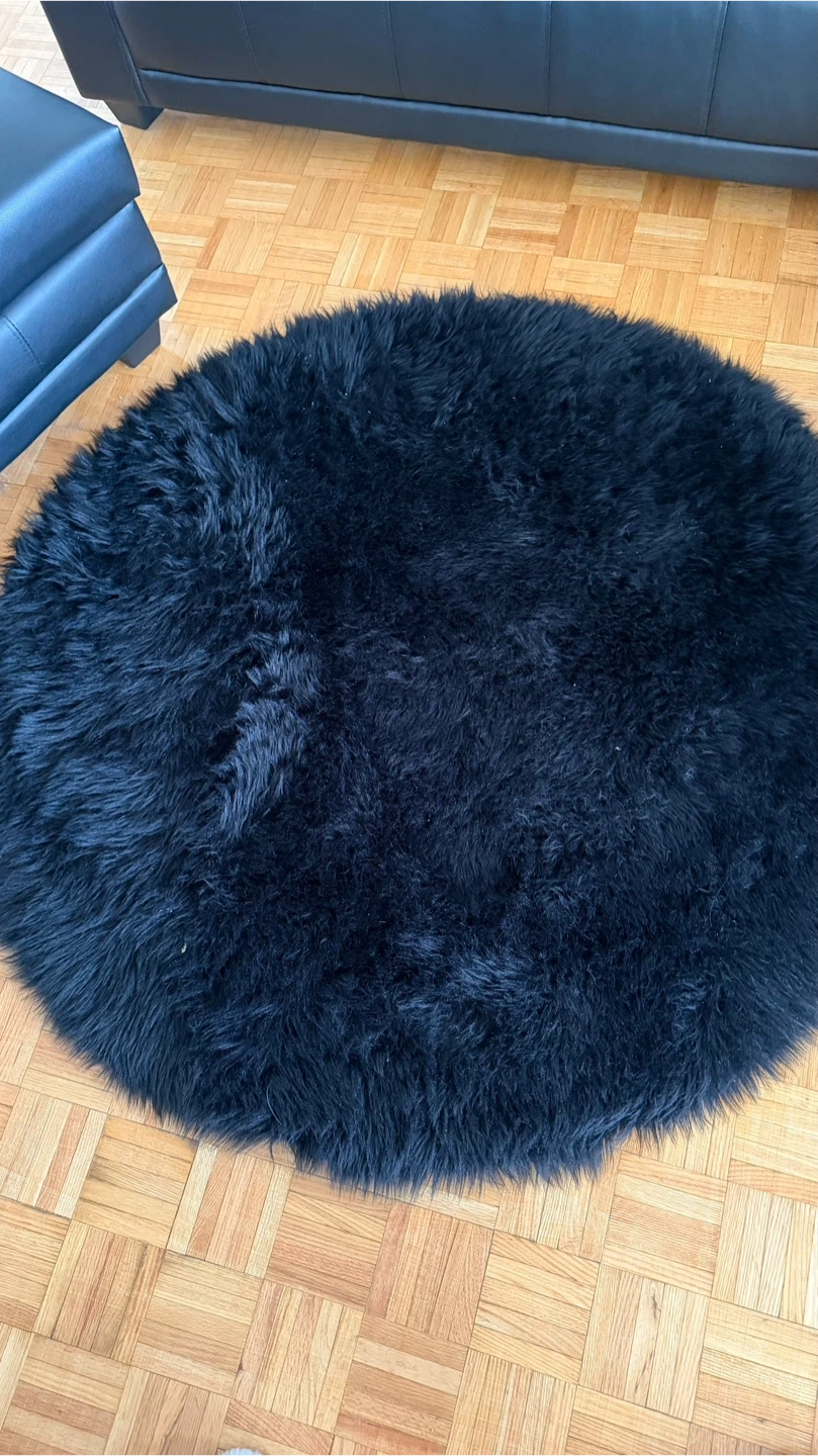 Selling a black round faux sheepskin rug. It's in great shape and would be a cozy addition to any room! Originally bought for $89