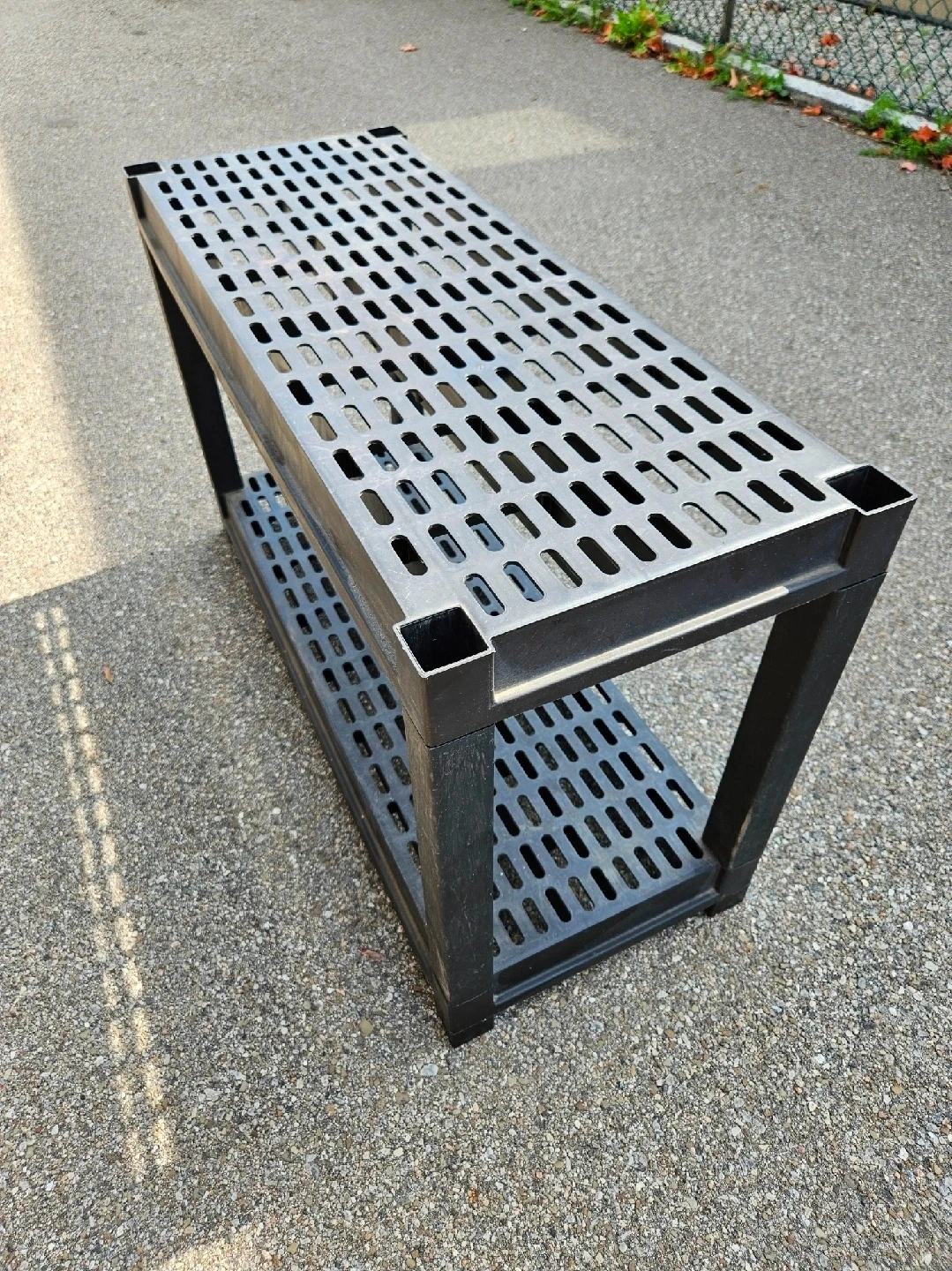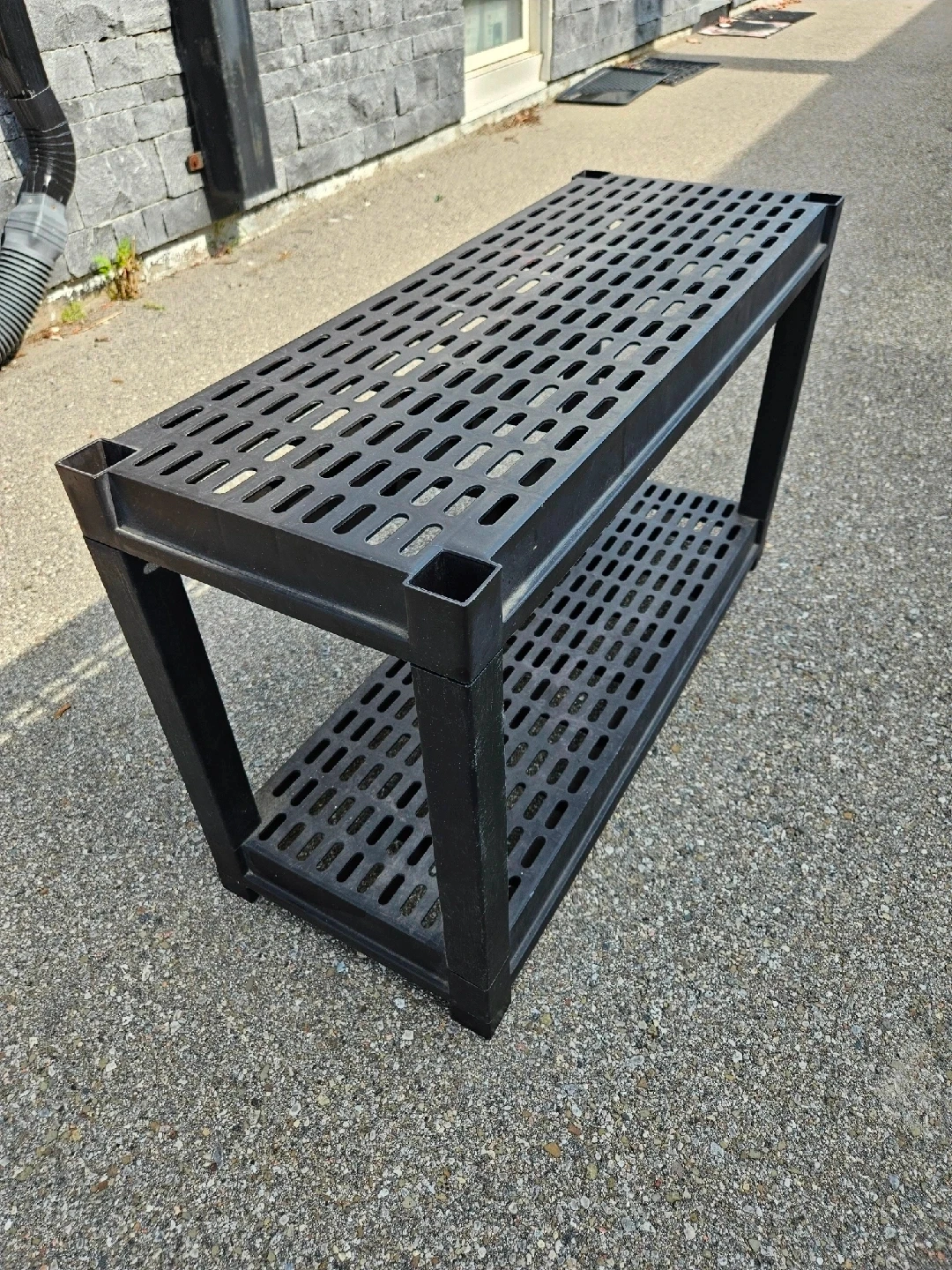 Here is a handy black plastic shelf unit! It's perfect for organizing items in your garage, shed, or even indoors. It has two tiers, providing ample storage space. It's in great shape and ready for a new home