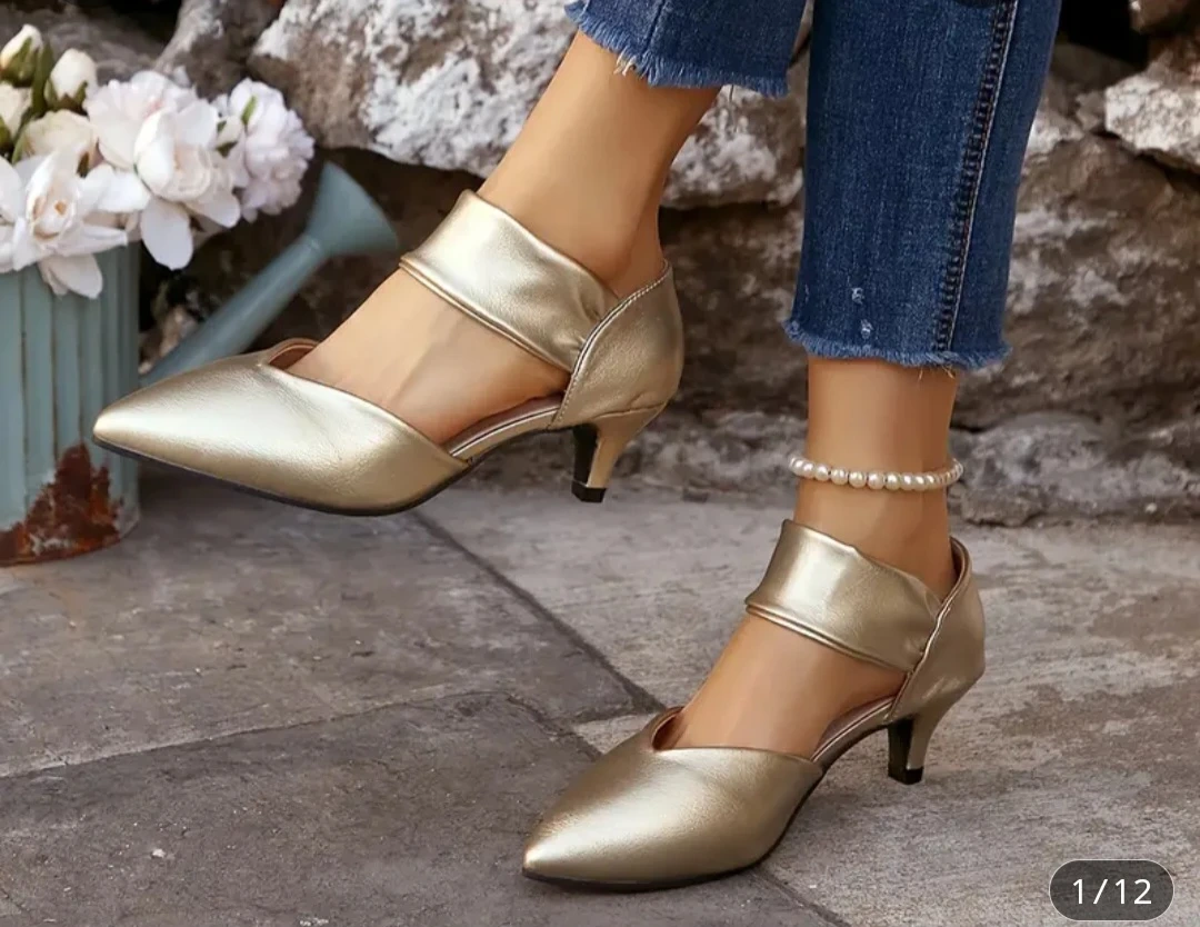 These gold or black (2 pairs available) pointed toe kitten heels are super cute and stylish! They are a size 10.5 and are brand NEW. Perfect for dressing up or adding a little sparkle to your everyday look.