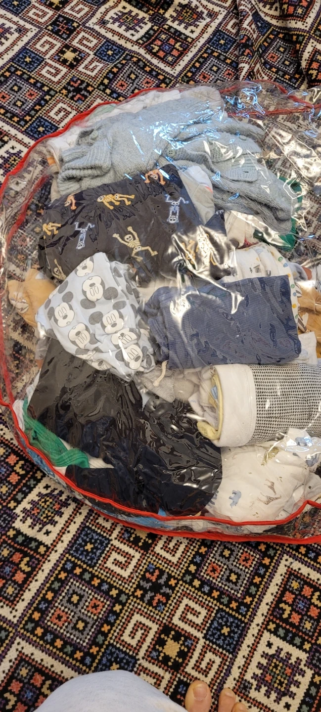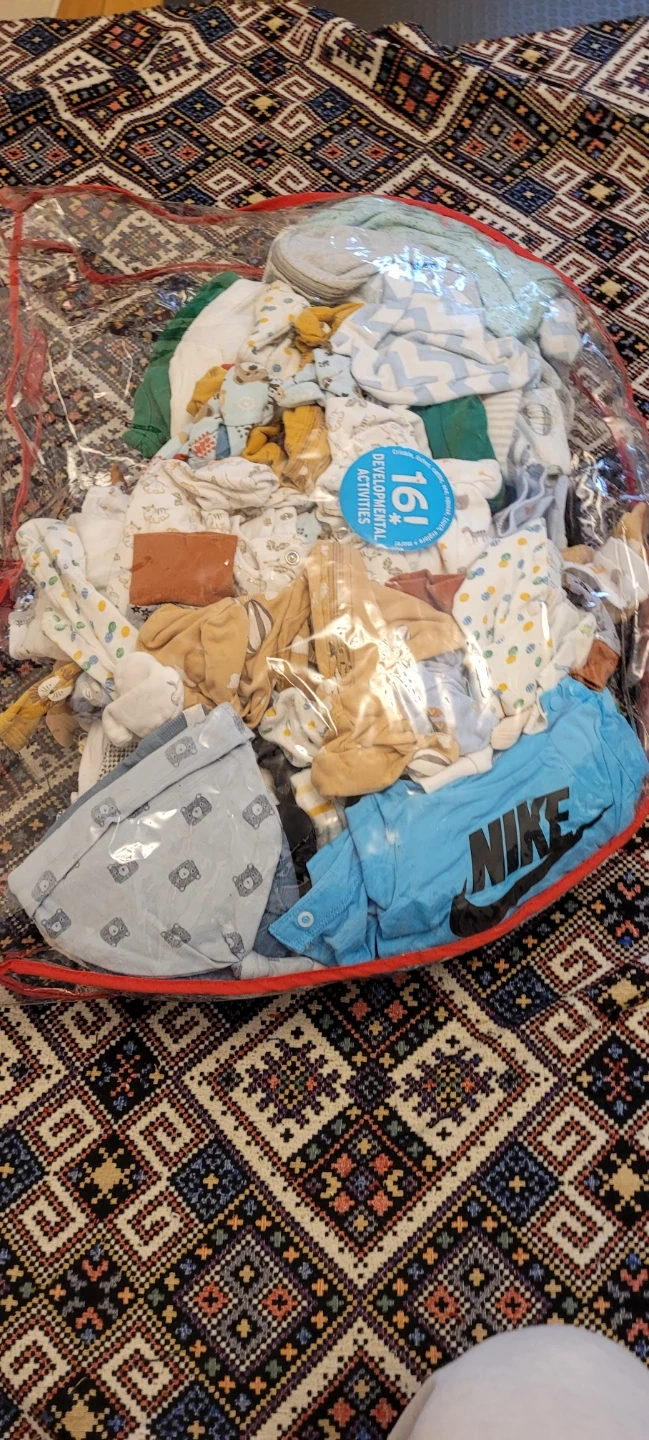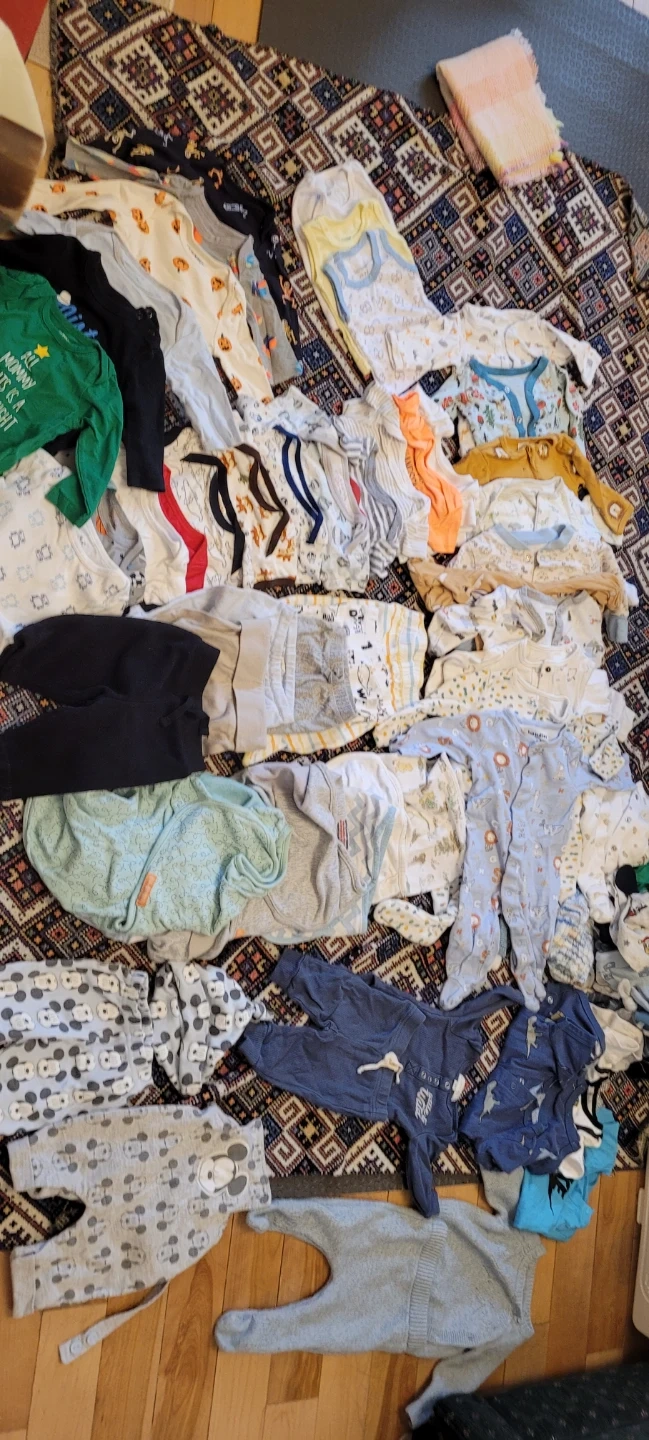 A big bundle of baby clothes in various sizes and styles! There are onesies, sleep sacks/swaddles, shirts, pants, hats, socks, and gloves. Perfect for stocking up your little one's wardrobe.