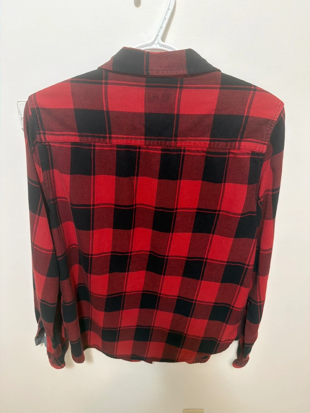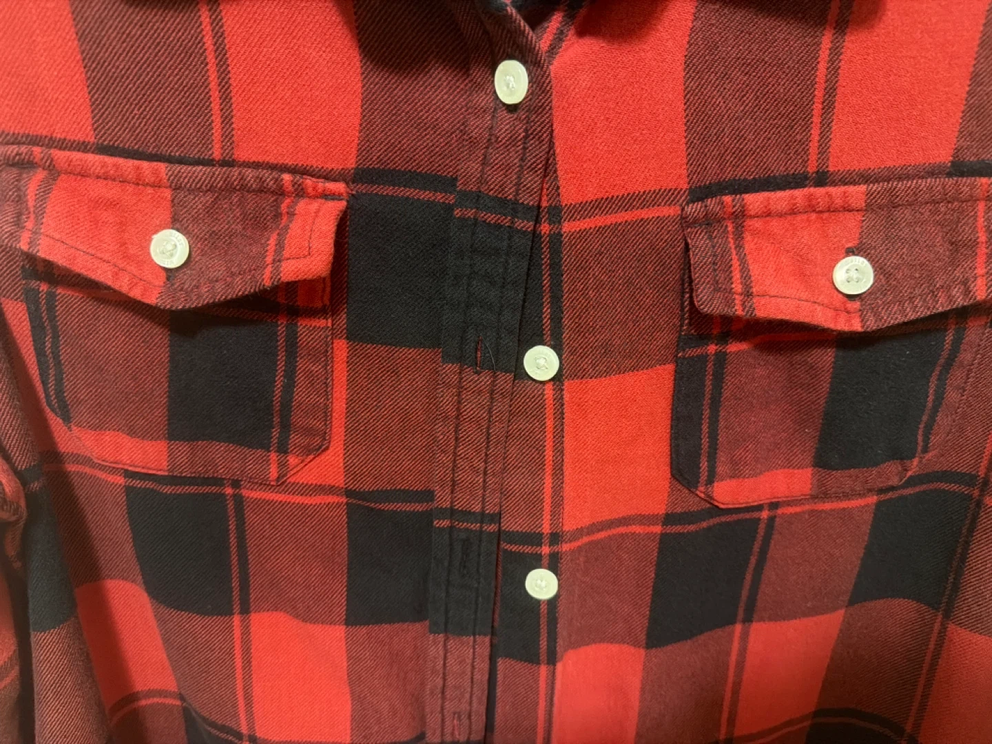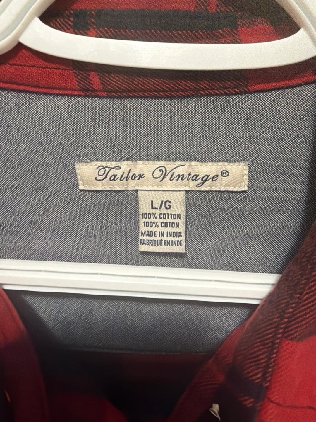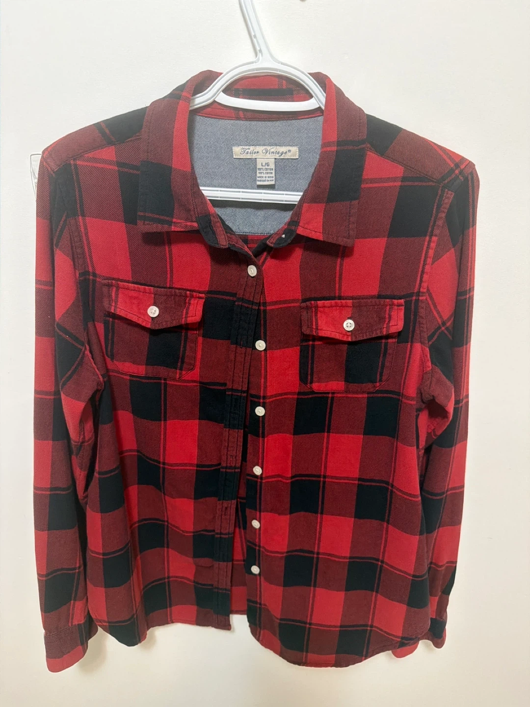 Selling a Tailor Vintage flannel shirt in a classic red and black plaid pattern. It's a size large and made of 100% cotton. Perfect for layering or wearing on its own!