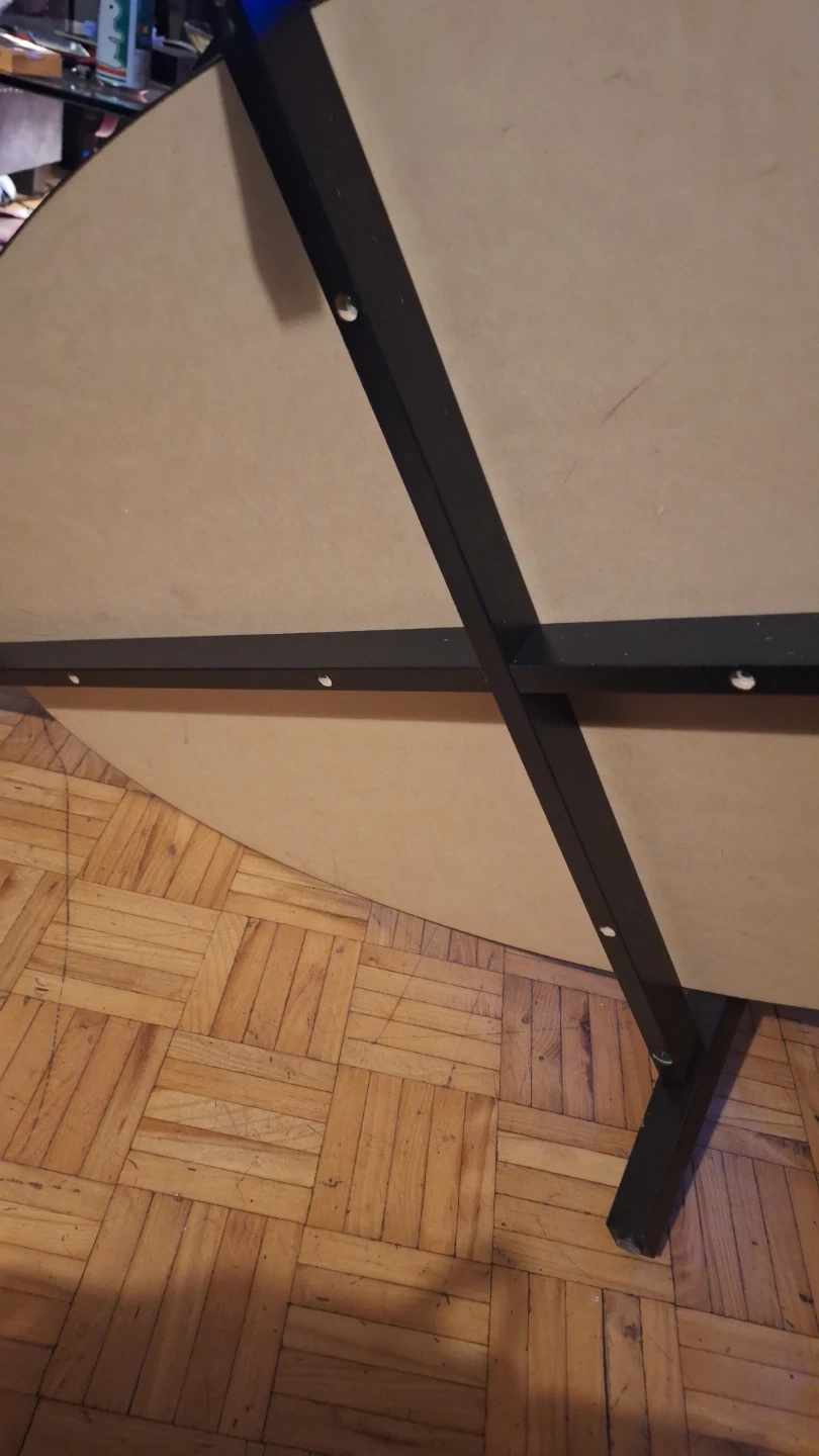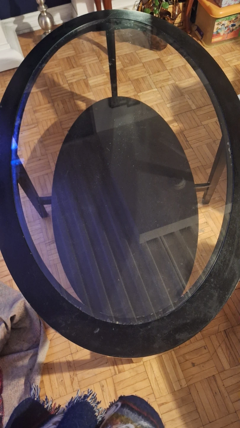 Selling a round coffee table with a glass top and black frame. It has a lower shelf for extra storage or display. It shows some signs of use, but is still in good condition and ready for a new home