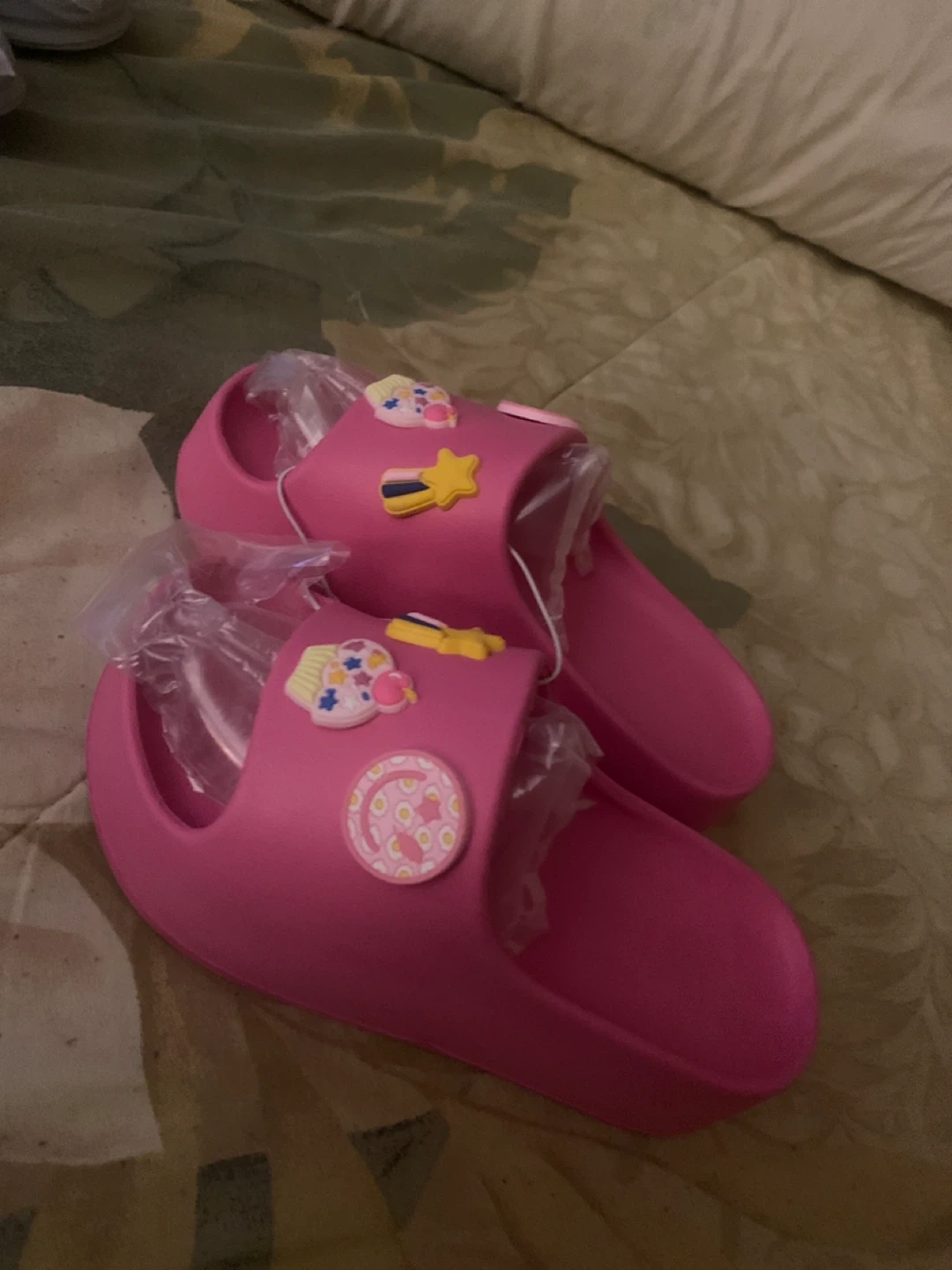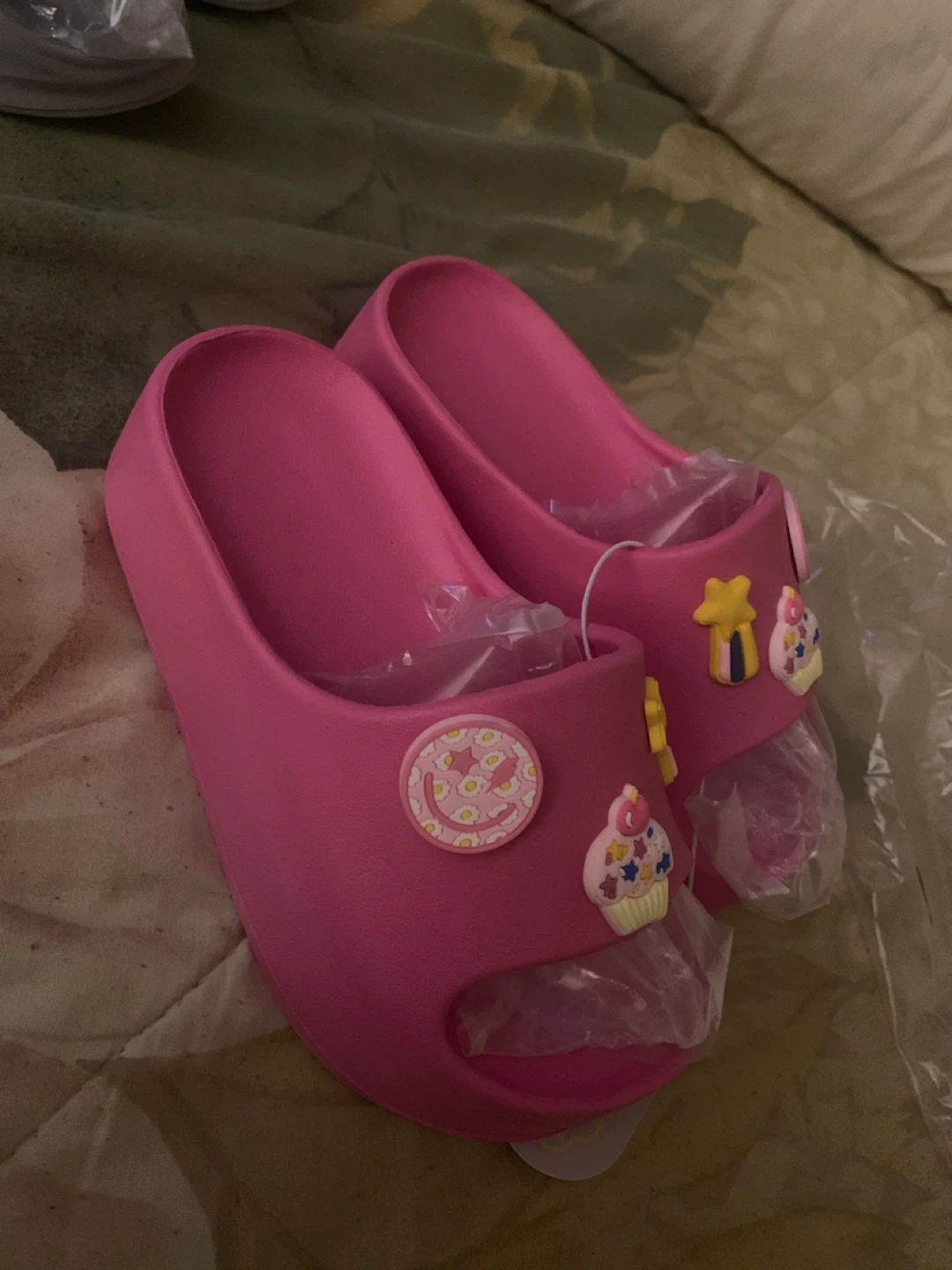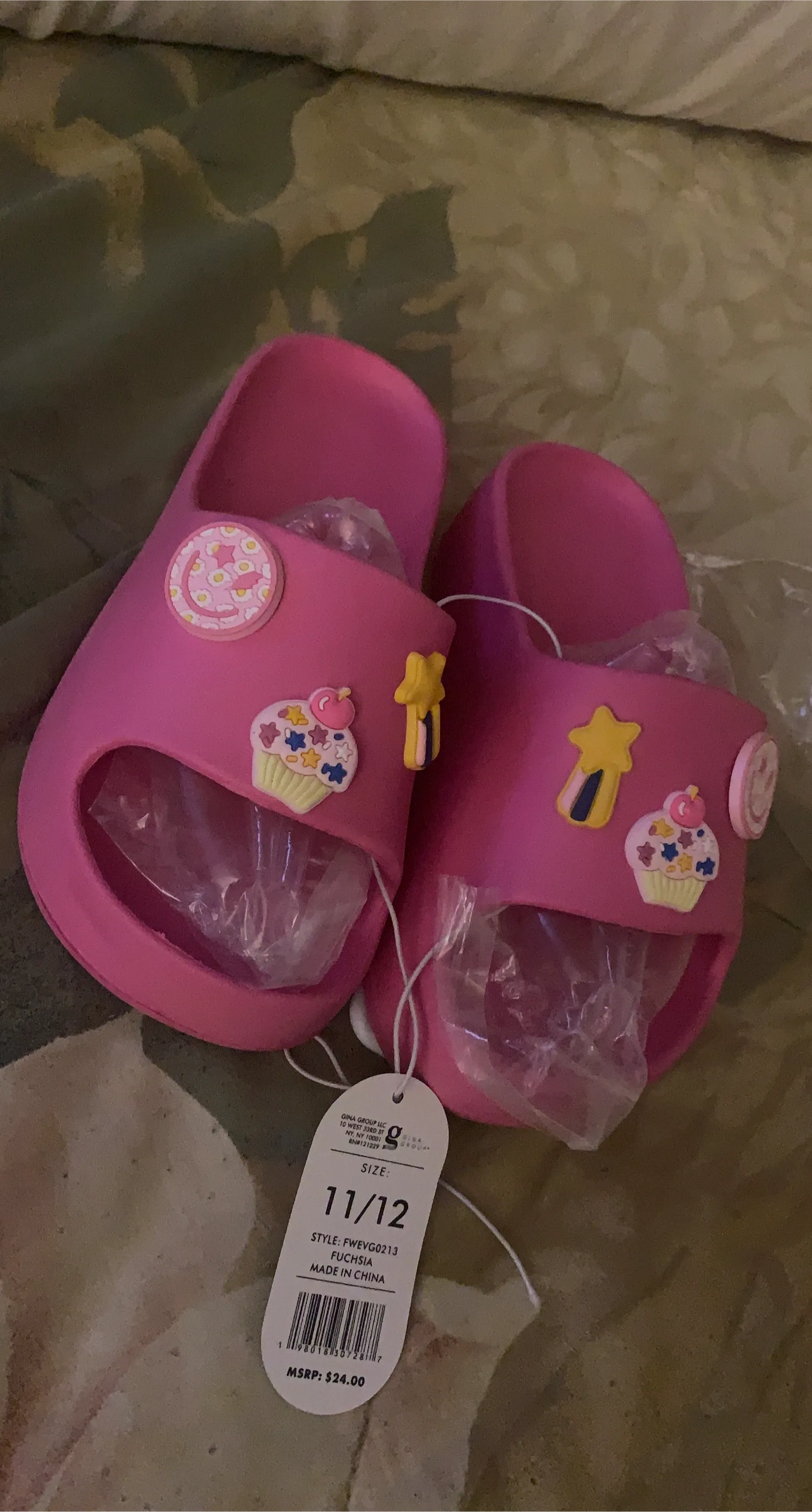 These bright pink slide sandals feature fun cupcake and star charms. They're a size 11/12. Made in China. These are comfortable slides for everyday wear!